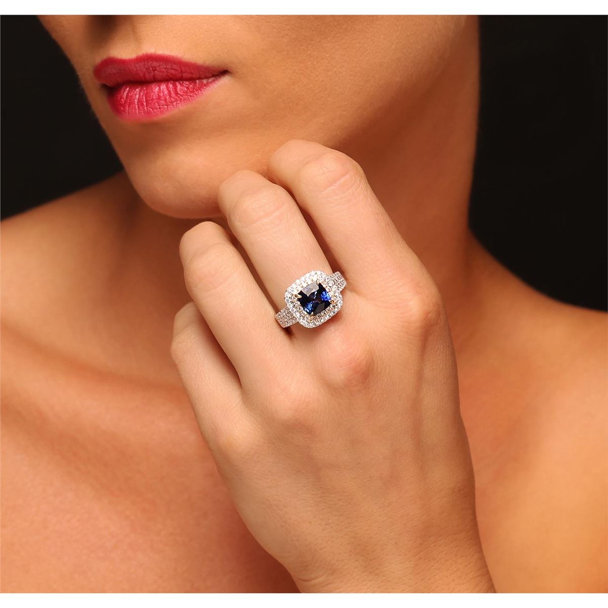 One electronically tested 14KT white and yellow gold Ladies combination cast & assembled ring with a high polish finish. Condition is new. Identified with markings of "14K". Containing: One prong set square cushion modified mixed cut natural tanzanite, measuring 8.00 x 8.00 x 5.20mm, approximate weight of 2.91ct., clarity is eye clean, type I, medium dark, moderately strong, blue color, (GIA B 6/4), cut is good. Colored gemstones are presumed to have been subjected to commonly used color/clarity enhancement processes. Eighty-Two prong set round brilliant cut diamonds, measuring 1.50 - 1.50 x 0.90mm (depth est.) approximate. Total Weight of 82 Stones = 1.25ct. Clarity: I-1 to I-2. Color: H - I, Cut is Good. Total Weight of Colored Stones 2.91ct. Total Weight of Diamonds 1.25ct. Total Weight of Ring 6.70 grams. GGL Appraised at $8,055.00.