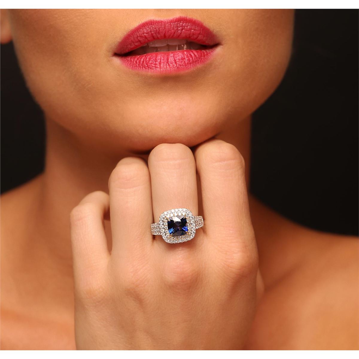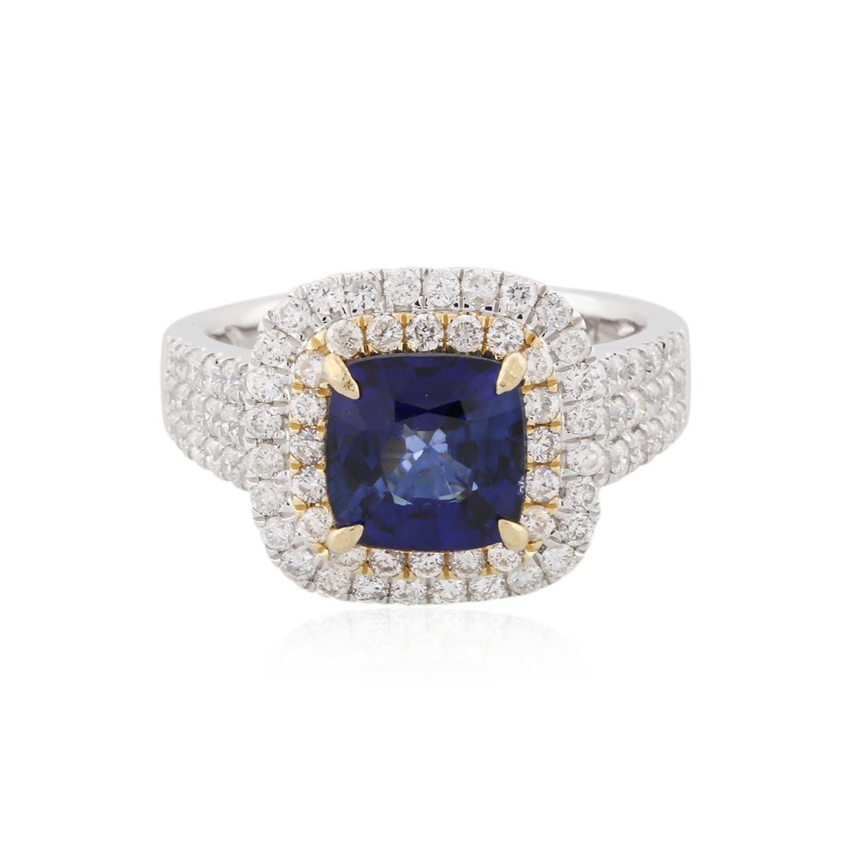 One electronically tested 14KT white and yellow gold Ladies combination cast & assembled ring with a high polish finish. Condition is new. Identified with markings of "14K". Containing: One prong set square cushion modified mixed cut natural tanzanite, measuring 8.00 x 8.00 x 5.20mm, approximate weight of 2.91ct., clarity is eye clean, type I, medium dark, moderately strong, blue color, (GIA B 6/4), cut is good. Colored gemstones are presumed to have been subjected to commonly used color/clarity enhancement processes. Eighty-Two prong set round brilliant cut diamonds, measuring 1.50 - 1.50 x 0.90mm (depth est.) approximate. Total Weight of 82 Stones = 1.25ct. Clarity: I-1 to I-2. Color: H - I, Cut is Good. Total Weight of Colored Stones 2.91ct. Total Weight of Diamonds 1.25ct. Total Weight of Ring 6.70 grams. GGL Appraised at $8,055.00.