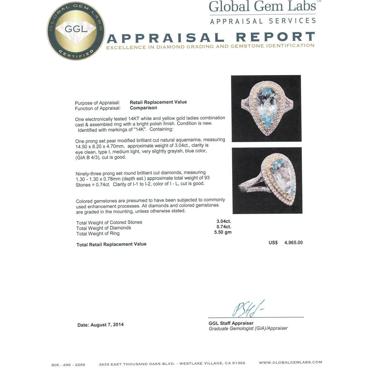 One electronically tested 14KT white and yellow gold ladies combination cast & assembled ring with a bright polish finish. Identified with markings of "14K". Condition is new. Containing: One prong set pear modified brilliant cut natural aquamarine, measuring 14.50 x 8.20 x 4.70mm, approximate weight of 3.04ct., clarity is eye clean, type I, medium light, very slightly grayish, blue color, (GIA B 4/3), cut is good. Ninety-Three prong set round brilliant cut diamonds, measuring 1.30 - 1.30 x 0.78mm (depth est.) approximate total weight of 93 Stones = 0.74ct. Clarity: I-1 to I-2. Color: I - L, Cut is Good. Colored gemstones are presumed to have been subjected to commonly used enhancement processes. All diamonds and colored gemstones are graded in the mounting, unless otherwise stated. Total Weight of Colored Stones 3.04ct. Total Weight of Diamonds 0.74ct. Total Weight of Ring 5.50 grams. GGL Appraised at $4,965.00.