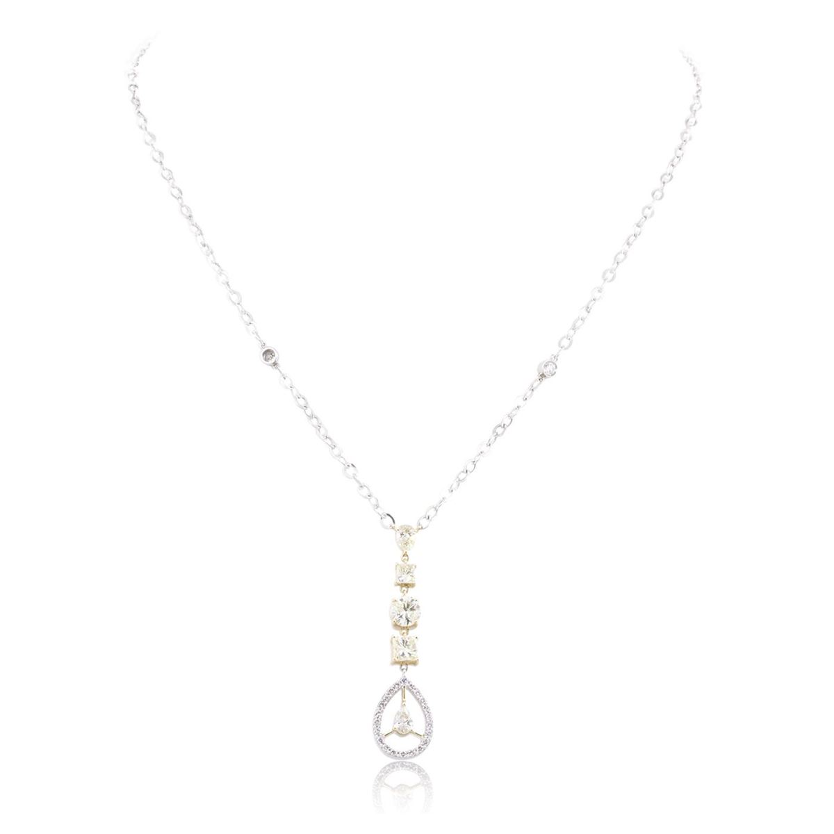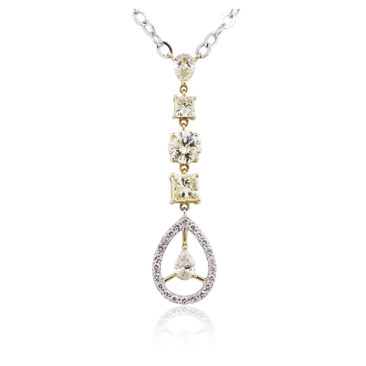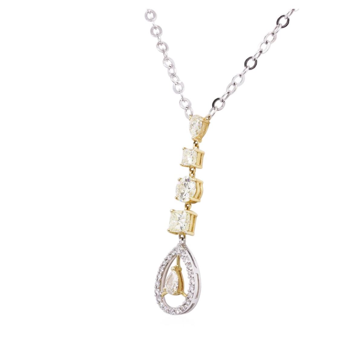 One electronically tested 14KT white and yellow gold ladies cast diamond necklace with a lobster claw clasp with a bright polish finish. Measurements: 17" in length. Identified with markings of "585". Condition is new. Containing: One prong set princess cut diamond, measuring 5.10 x 5.10 x 3.83mm (depth est.) approximate weight of 0.82ct. Clarity: I-1, Cut is Good. One prong set princess cut diamond, measuring 3.90 x 3.50 x 2.63mm (depth est.) approximate weight of 0.29ct. Clarity: I-1, Cut is Good. One prong set round brilliant cut diamond, measuring 6.50 - 6.50 x 3.90mm (depth est.) approximate weight of 1.01ct. Clarity: I-2, Cut is Good. Two prong set pear shaped cut diamonds, measuring 5.50 x 3.50 x 2.21mm (depth est.) approximate total weight of 2 Stones = 0.50ct. Clarity: SI-1 to SI-2, Cut is Good. Twenty-Two prong set round brilliant cut diamonds, measuring 1.50 - 1.50 x 0.90mm (depth est.) approximate total weight of 22 Stones = 0.27ct. Clarity: I-1. Color: I - J, Cut is Good. Two bezel set round brilliant cut diamonds, measuring 3.00 - 3.00 x 1.80mm (depth est.) approximate total weight of 2 Stones = 0.20ct. Clarity: SI-2 to I-1. Color: I - J, Cut is Good. All diamonds are graded in the mounting, unless otherwise stated. Total Weight of Diamonds 3.09ct. Total Weight of Necklace 5.90 grams. GGL Appraised at $9,655.00.