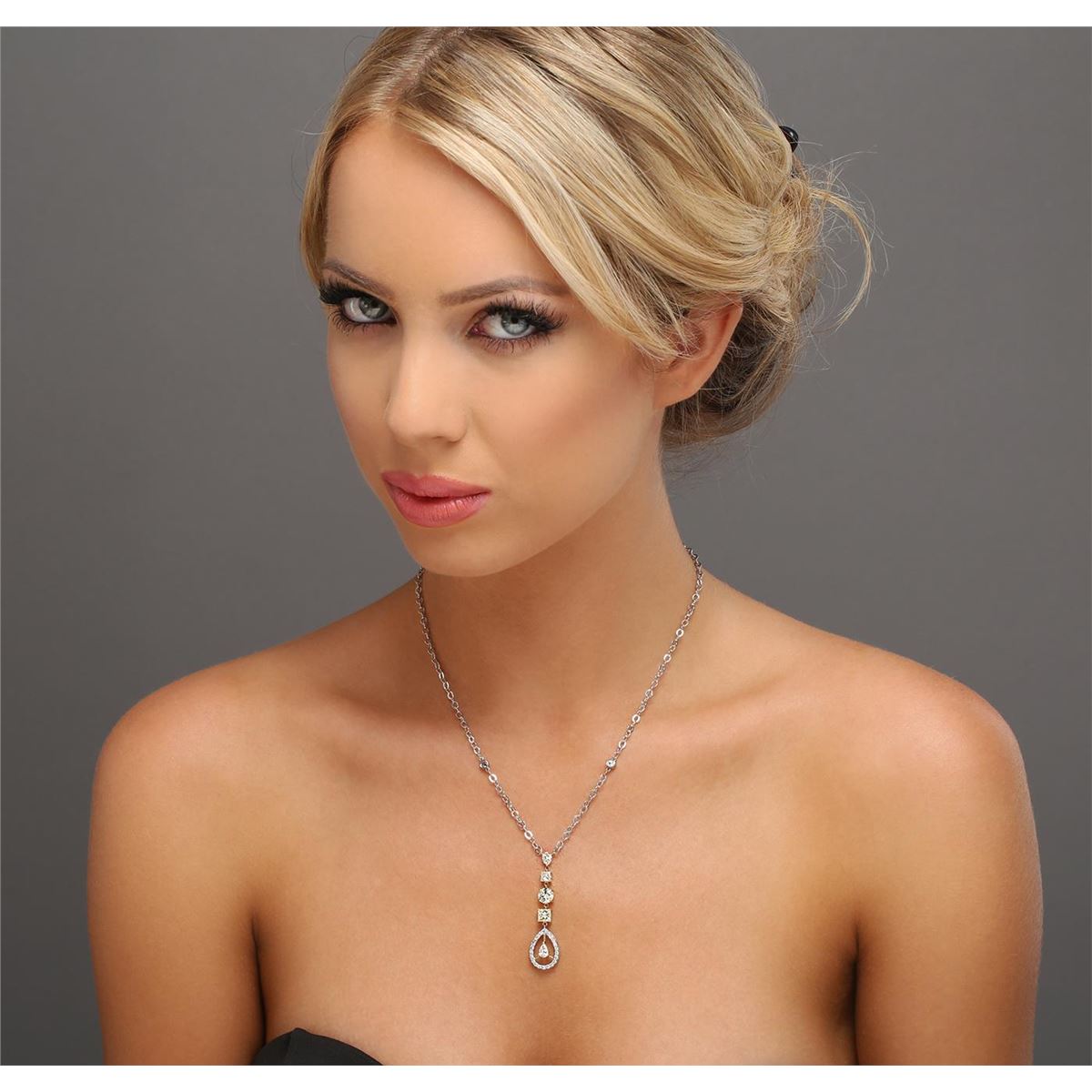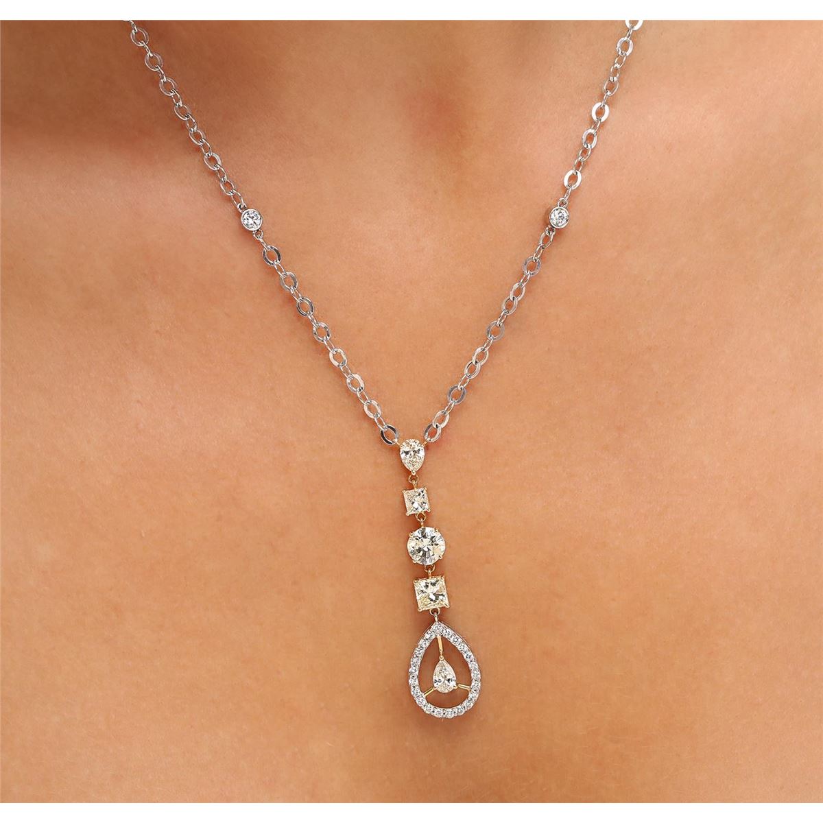 One electronically tested 14KT white and yellow gold ladies cast diamond necklace with a lobster claw clasp with a bright polish finish. Measurements: 17" in length. Identified with markings of "585". Condition is new. Containing: One prong set princess cut diamond, measuring 5.10 x 5.10 x 3.83mm (depth est.) approximate weight of 0.82ct. Clarity: I-1, Cut is Good. One prong set princess cut diamond, measuring 3.90 x 3.50 x 2.63mm (depth est.) approximate weight of 0.29ct. Clarity: I-1, Cut is Good. One prong set round brilliant cut diamond, measuring 6.50 - 6.50 x 3.90mm (depth est.) approximate weight of 1.01ct. Clarity: I-2, Cut is Good. Two prong set pear shaped cut diamonds, measuring 5.50 x 3.50 x 2.21mm (depth est.) approximate total weight of 2 Stones = 0.50ct. Clarity: SI-1 to SI-2, Cut is Good. Twenty-Two prong set round brilliant cut diamonds, measuring 1.50 - 1.50 x 0.90mm (depth est.) approximate total weight of 22 Stones = 0.27ct. Clarity: I-1. Color: I - J, Cut is Good. Two bezel set round brilliant cut diamonds, measuring 3.00 - 3.00 x 1.80mm (depth est.) approximate total weight of 2 Stones = 0.20ct. Clarity: SI-2 to I-1. Color: I - J, Cut is Good. All diamonds are graded in the mounting, unless otherwise stated. Total Weight of Diamonds 3.09ct. Total Weight of Necklace 5.90 grams. GGL Appraised at $9,655.00.