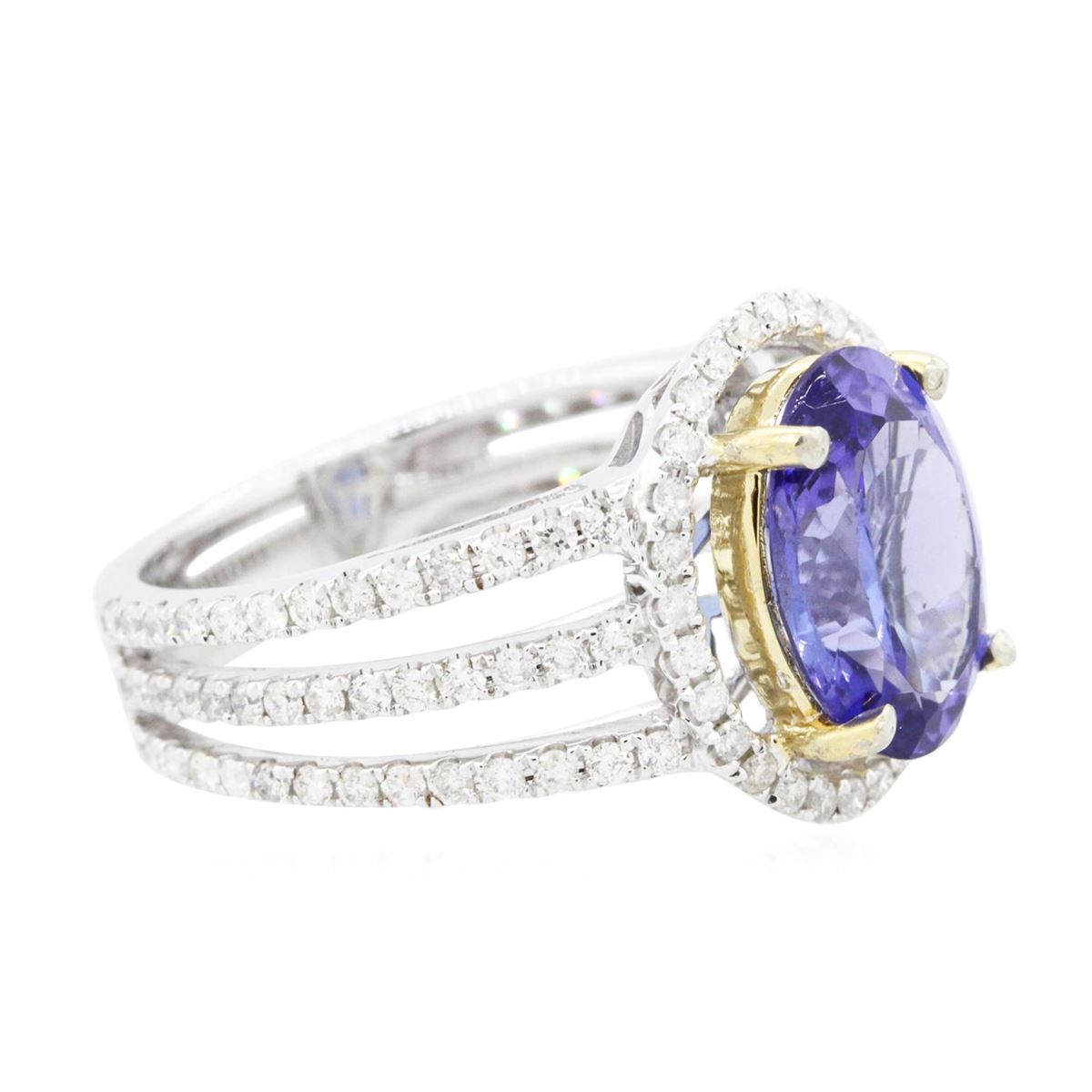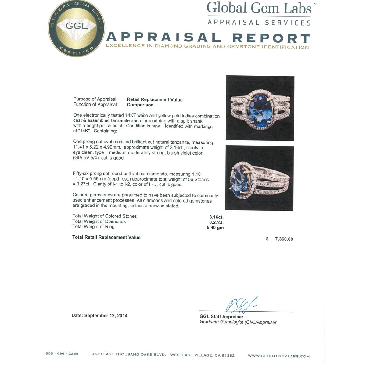 One electronically tested 14KT white and yellow gold ladies combination cast & assembled tanzanite and diamond ring with a split shank with a bright polish finish. Identified with markings of "14K". Condition is new. Containing: One prong set oval modified brilliant cut natural tanzanite, measuring 11.41 x 8.22 x 4.90mm, approximate weight of 3.16ct., clarity is eye clean, type I, medium, moderately strong, bluish violet color, (GIA bV 5/4), cut is good. Fifty-Six prong set round brilliant cut diamonds, measuring 1.10 - 1.10 x 0.66mm (depth est.) approximate total weight of 56 Stones = 0.27ct. Clarity: I-1 to I-2. Color: I - J, Cut is Good. Colored gemstones are presumed to have been subjected to commonly used enhancement processes. All diamonds and colored gemstones are graded in the mounting, unless otherwise stated total weight of Colored Stones 3.16ct. Total Weight of Diamonds 0.27ct. Total Weight of Ring 5.40 grams. GGL Appraised at $7,360.00.
