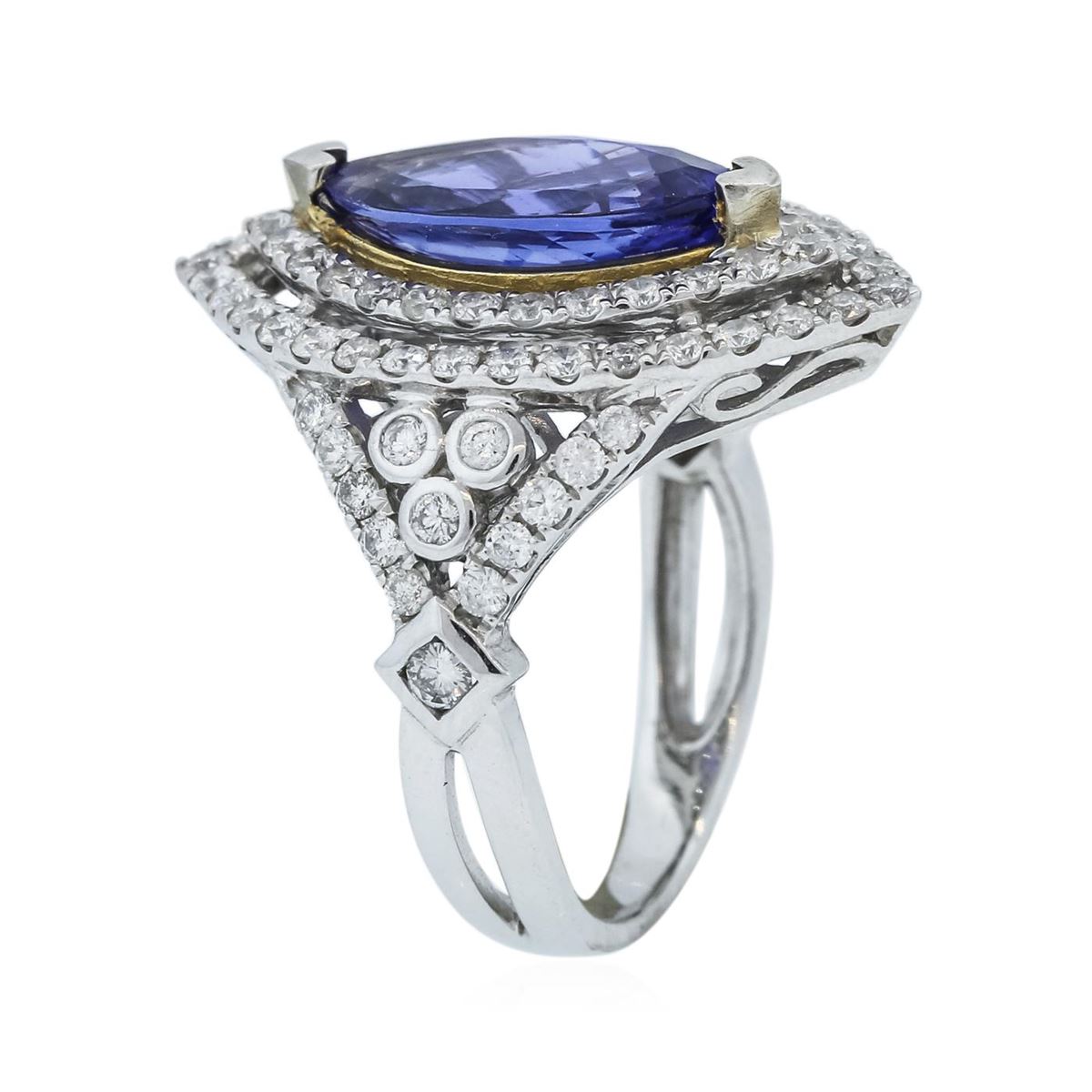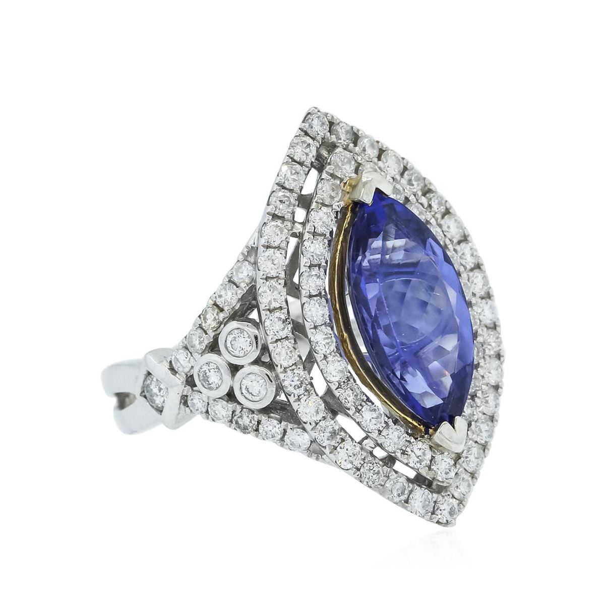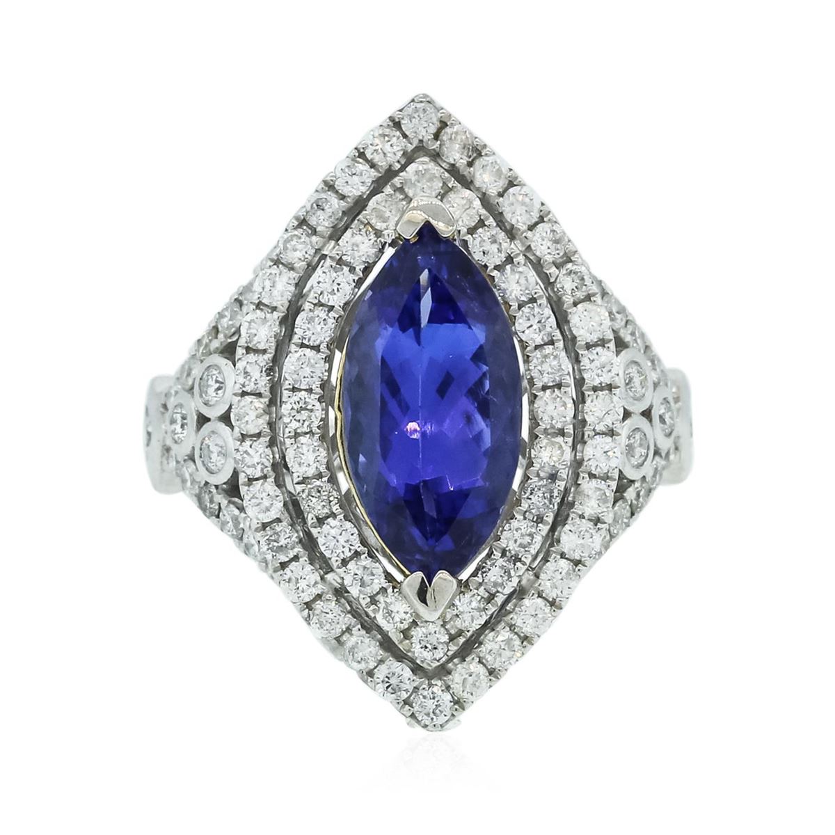 One electronically tested 14KT white and yellow gold ladies combination cast & assembled tanzanite and diamond ring with a split shoulder shank with a bright polish finish. Identified with markings of "14K". Condition is new. Containing: One prong set marquise modified brilliant cut natural tanzanite, measuring 15.00 x 6.84 x 4.91mm, approximate weight of 3.21ct., clarity is eye clean, type I, medium, moderately strong, bluish violet color, (GIA bV 5/4), cut is good. Eighty-Four prong set round brilliant cut diamonds, measuring 1.60 - 1.30 x 0.87mm (depth est.) stated total weight of 84 Stones = 0.93ct. Clarity: I-1 to I-2. Color: I - J, Cut is Good. Colored gemstones are presumed to have been subjected to commonly used enhancement processes. All diamonds and colored gemstones are graded in the mounting, unless otherwise stated total weight of Colored Stones 3.21ct. Total Weight of Diamonds 0.93ct. Total Weight of Ring 7.40 grams. GGL Appraised at $8,765.00.