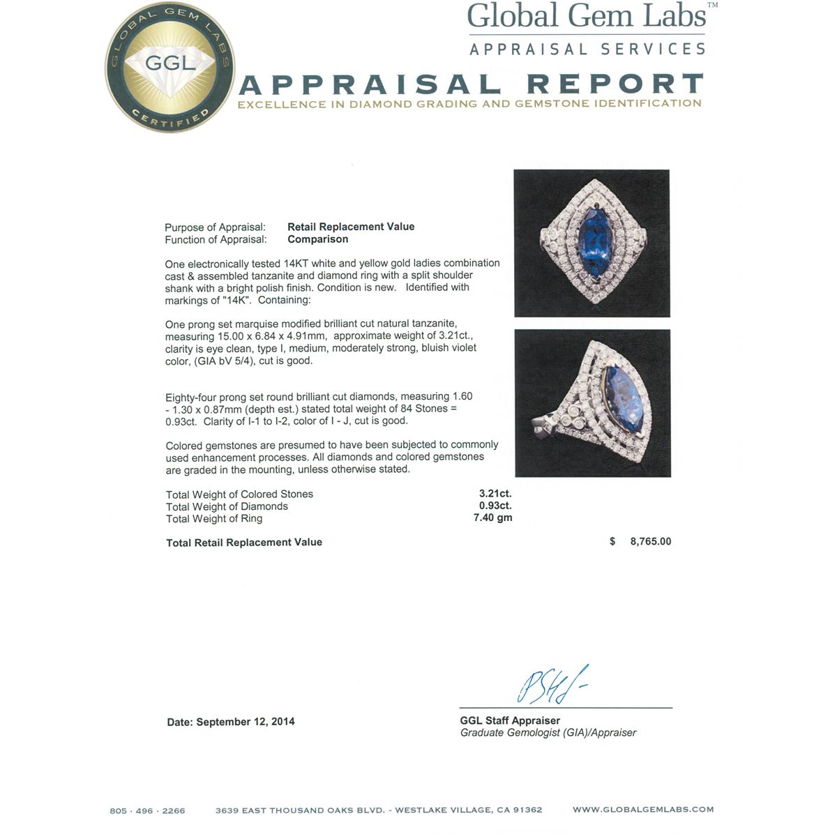 One electronically tested 14KT white and yellow gold ladies combination cast & assembled tanzanite and diamond ring with a split shoulder shank with a bright polish finish. Identified with markings of "14K". Condition is new. Containing: One prong set marquise modified brilliant cut natural tanzanite, measuring 15.00 x 6.84 x 4.91mm, approximate weight of 3.21ct., clarity is eye clean, type I, medium, moderately strong, bluish violet color, (GIA bV 5/4), cut is good. Eighty-Four prong set round brilliant cut diamonds, measuring 1.60 - 1.30 x 0.87mm (depth est.) stated total weight of 84 Stones = 0.93ct. Clarity: I-1 to I-2. Color: I - J, Cut is Good. Colored gemstones are presumed to have been subjected to commonly used enhancement processes. All diamonds and colored gemstones are graded in the mounting, unless otherwise stated total weight of Colored Stones 3.21ct. Total Weight of Diamonds 0.93ct. Total Weight of Ring 7.40 grams. GGL Appraised at $8,765.00.