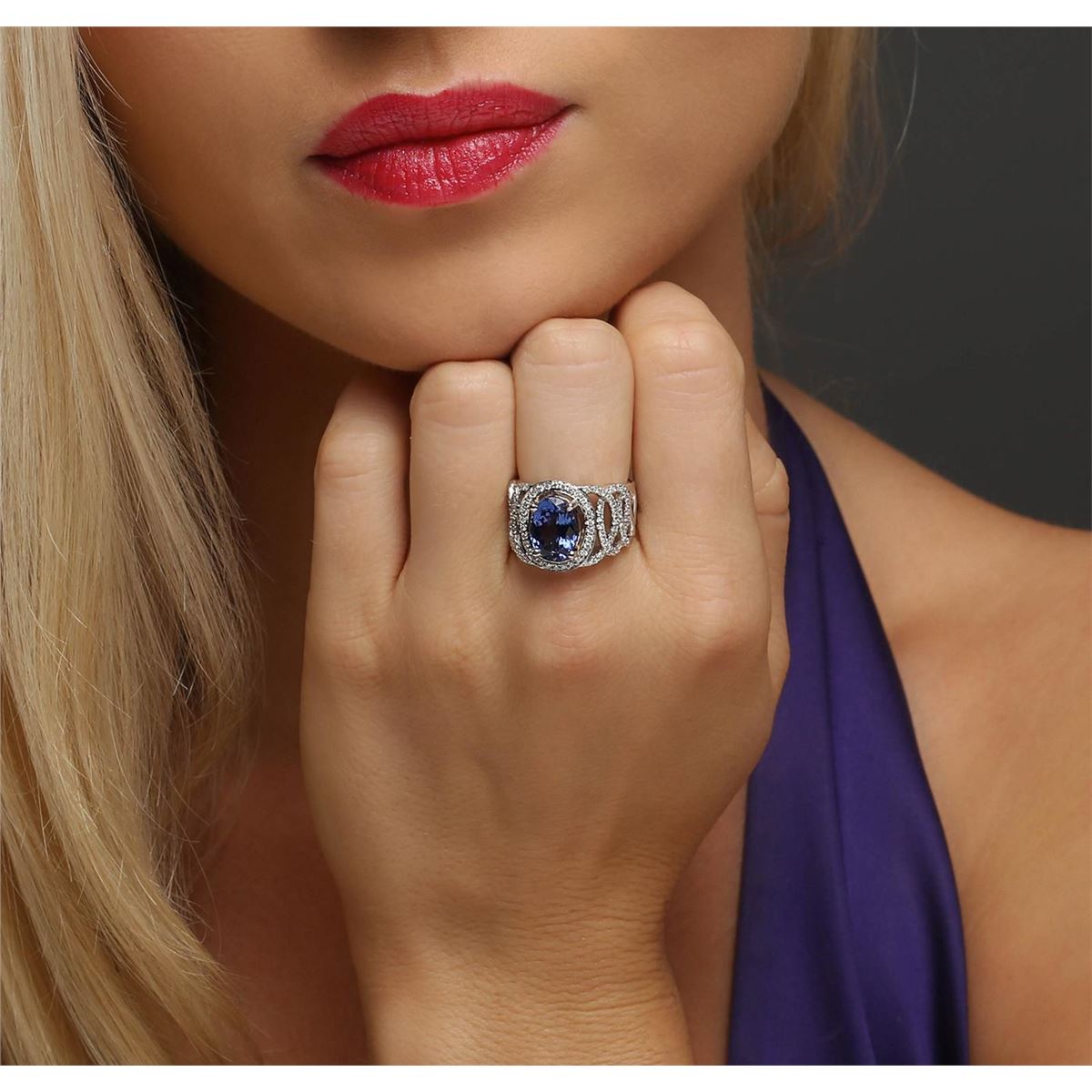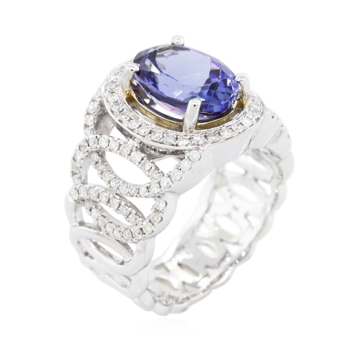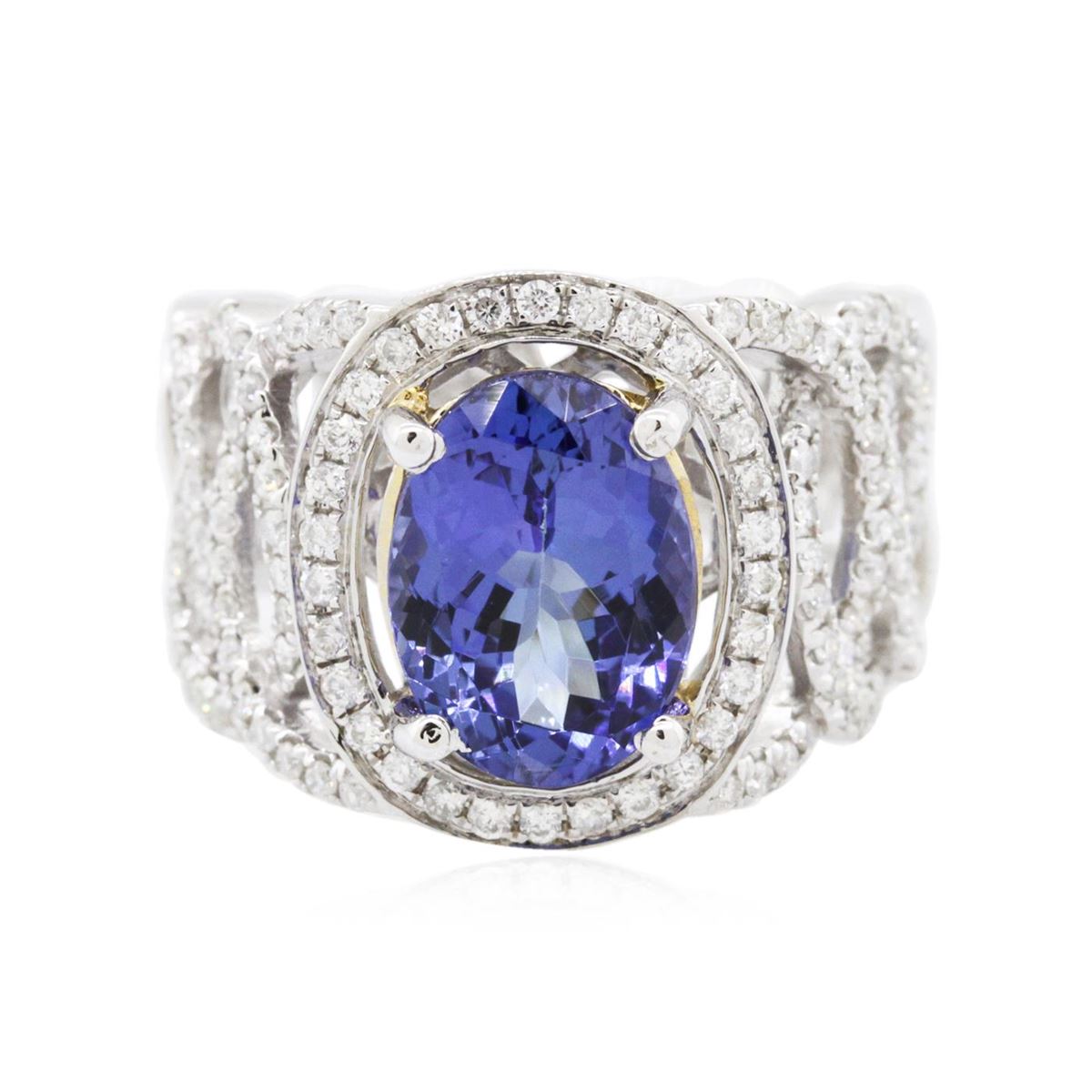 One electronically tested 14KT white and yellow gold ladies combination cast & assembled tanzanite and diamond ring with a tapered shank with a bright polish finish. Identified with markings of "14K". Condition is new. Containing: One prong set oval modified brilliant cut natural tanzanite, measuring 10.74 x 7.88 x 5.63mm, approximate weight of 3.27ct., clarity is eye clean, type I, medium, very slightly grayish, violet color, (GIA V 5/3), cut is good. One Hundred Eighteen prong set round brilliant cut diamonds, measuring 1.20 - 1.20 x 0.72mm (depth est.) approximate total weight of 118 Stones = 0.74ct. Clarity: I-1 to I-2. Color: I - J, Cut is Good. Colored gemstones are presumed to have been subjected to commonly used enhancement processes. All diamonds and colored gemstones are graded in the mounting, unless otherwise stated total weight of Colored Stones 3.27ct. Total Weight of Diamonds 0.74ct. Total Weight of Ring 7.90 grams. GGL Appraised at $8,970.00.