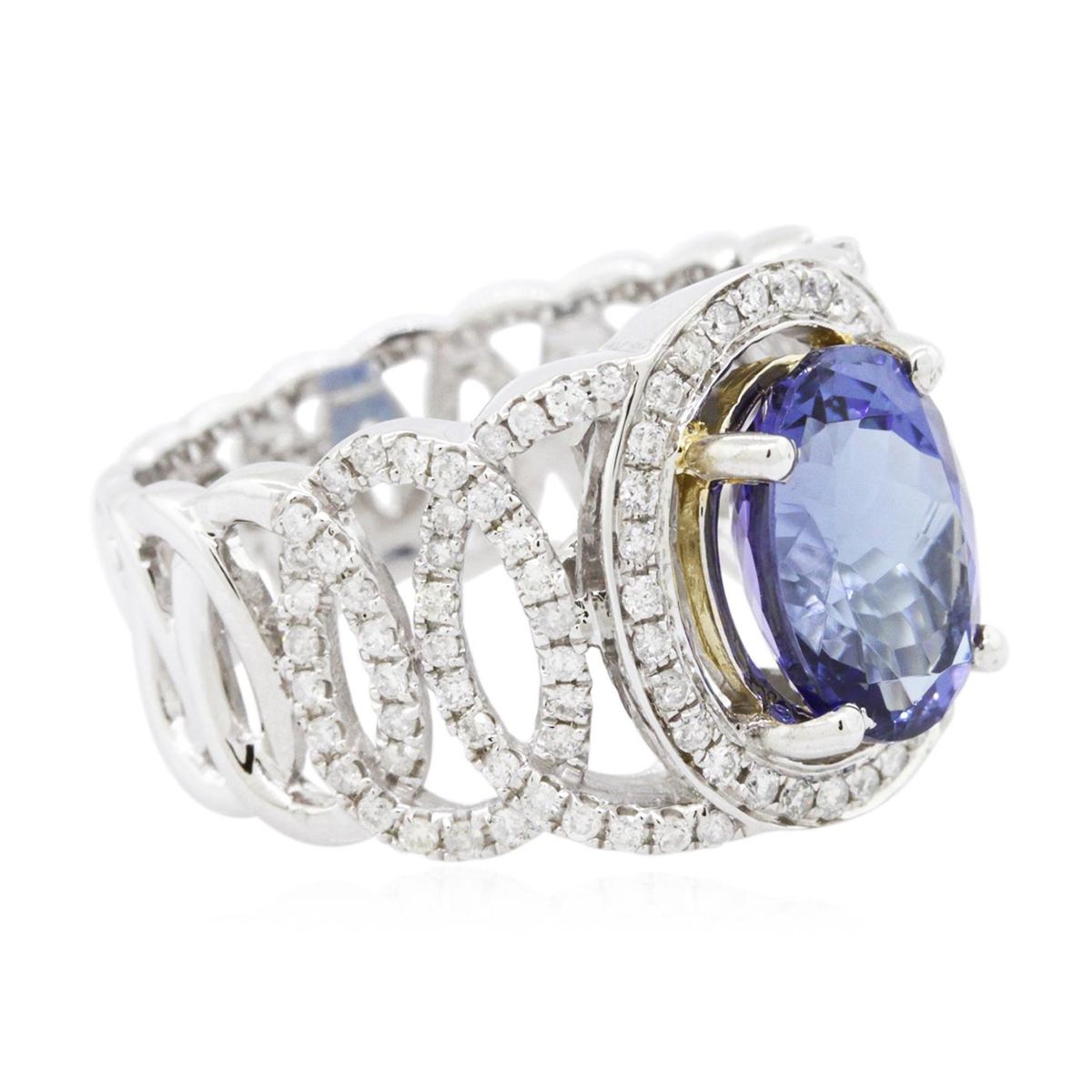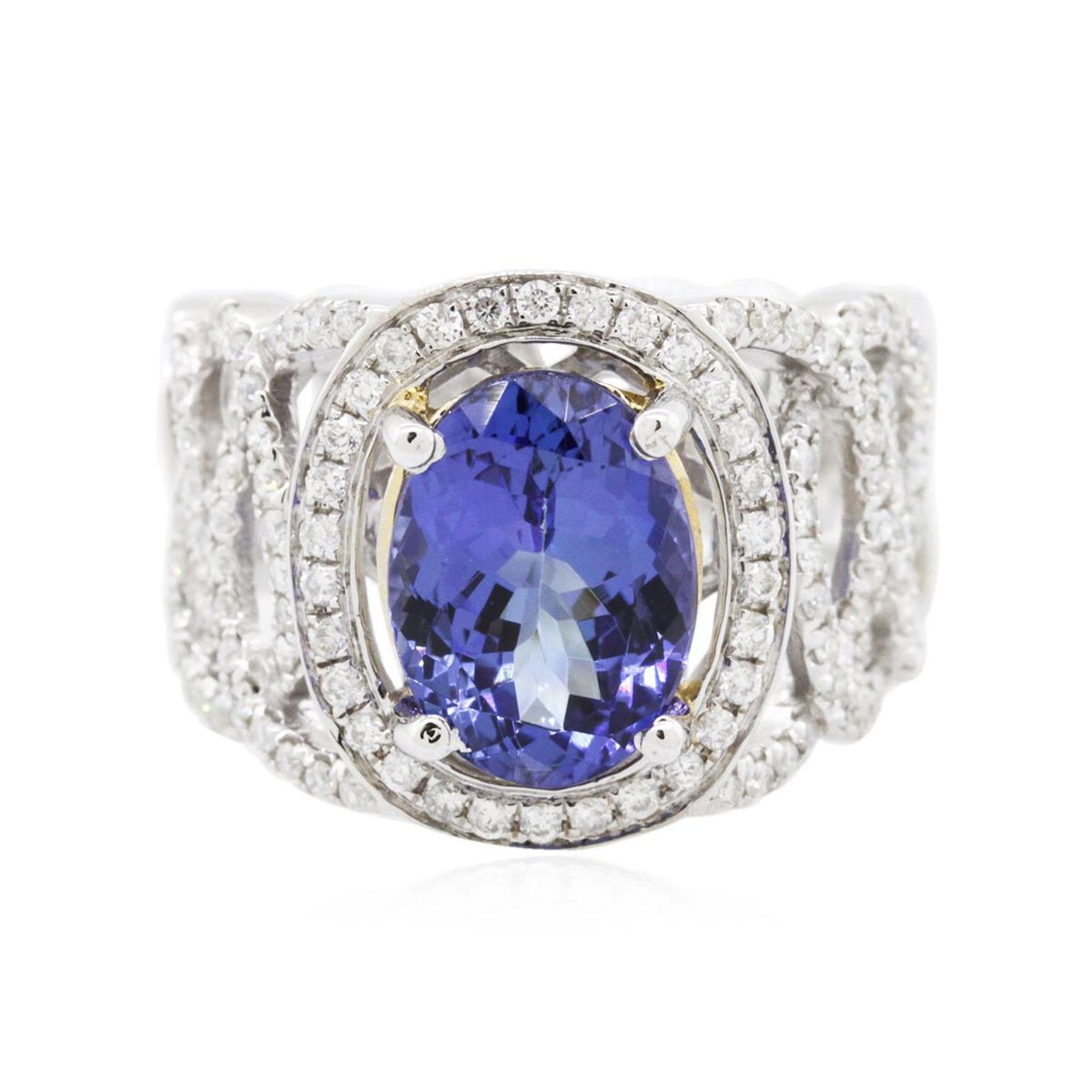 One electronically tested 14KT white and yellow gold ladies combination cast & assembled tanzanite and diamond ring with a tapered shank with a bright polish finish. Identified with markings of "14K". Condition is new. Containing: One prong set oval modified brilliant cut natural tanzanite, measuring 10.74 x 7.88 x 5.63mm, approximate weight of 3.27ct., clarity is eye clean, type I, medium, very slightly grayish, violet color, (GIA V 5/3), cut is good. One Hundred Eighteen prong set round brilliant cut diamonds, measuring 1.20 - 1.20 x 0.72mm (depth est.) approximate total weight of 118 Stones = 0.74ct. Clarity: I-1 to I-2. Color: I - J, Cut is Good. Colored gemstones are presumed to have been subjected to commonly used enhancement processes. All diamonds and colored gemstones are graded in the mounting, unless otherwise stated total weight of Colored Stones 3.27ct. Total Weight of Diamonds 0.74ct. Total Weight of Ring 7.90 grams. GGL Appraised at $8,970.00.