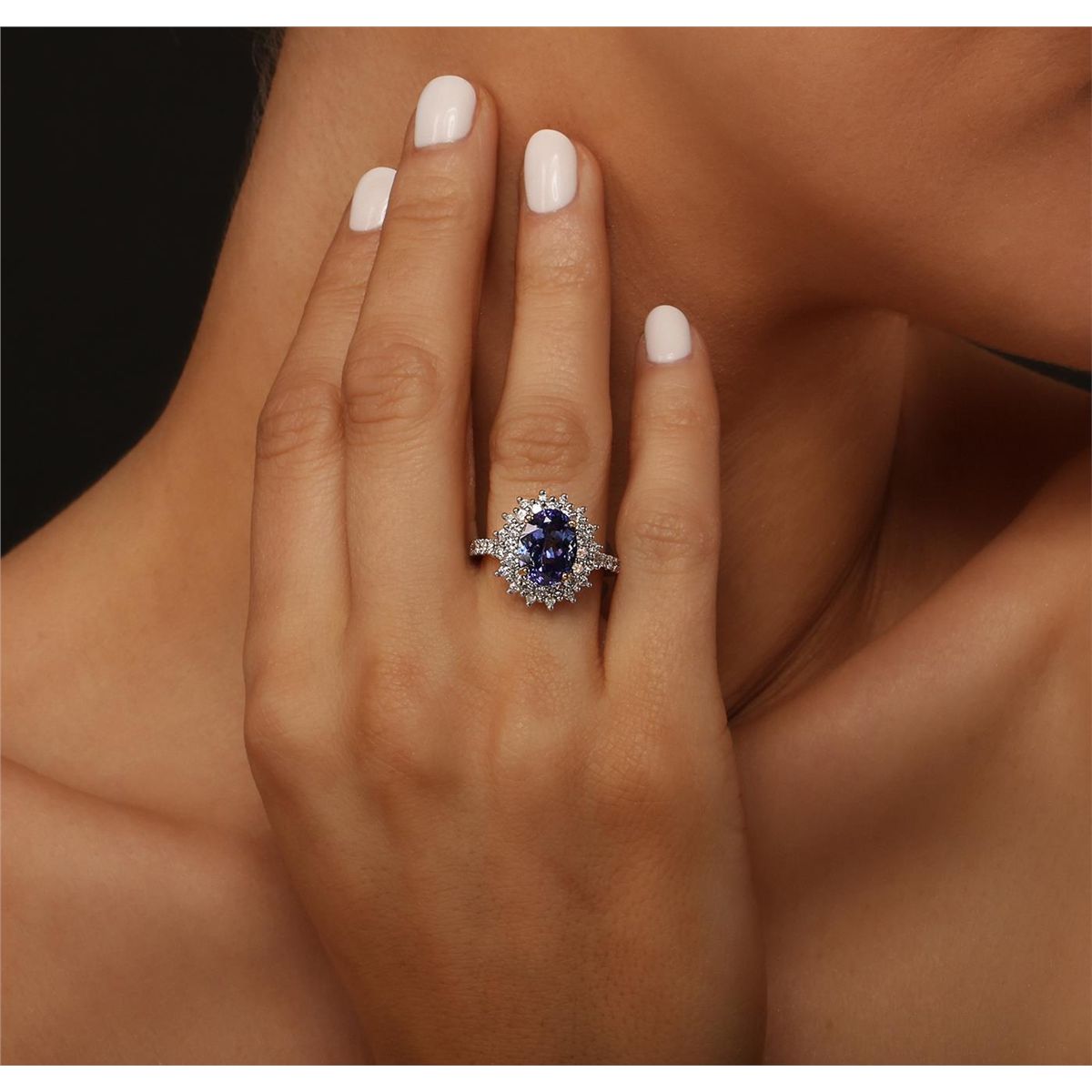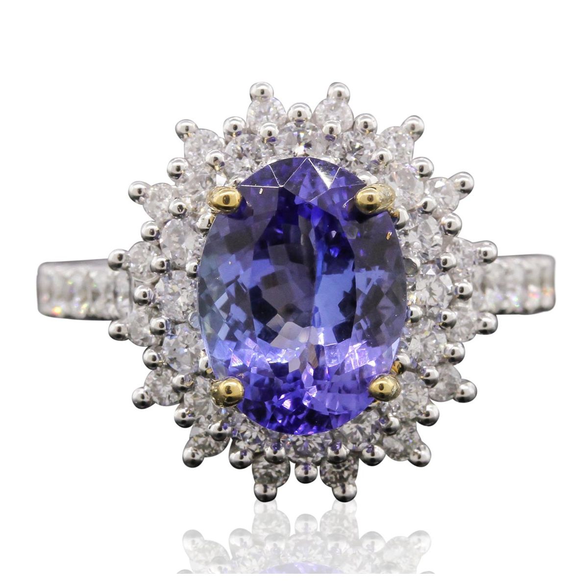 One electronically tested 14KT white and yellow gold Ladies combination cast & assembled ring with a bright polish finish. Condition is new. Identified with markings of "14K". Containing: One prong set oval modified brilliant cut natural tanzanite, measuring 11.00. x 8.30 x 5.25mm, approximate weight of 3.28ct., clarity is eye clean, type I, medium light, very slightly grayish, bluish violet color, (GIA bV 4/3), cut is good. Colored gemstones are presumed to have been subjected to commonly used color/clarity enhancement processes. Forty-Two prong set round brilliant cut diamonds, measuring 2.00. - 1.50 x 1.05mm (depth est.) approximate. Total Weight of 42 Stones = 0.82ct. . Clarity: I-1 to I-2. Color: I - J, Cut is Good. . Total Weight of Colored Stones 3.28ct. Total Weight of Diamonds 0.82ct. Total Weight of Ring 6.60 grams. GGL Appraised at $7,785.00.