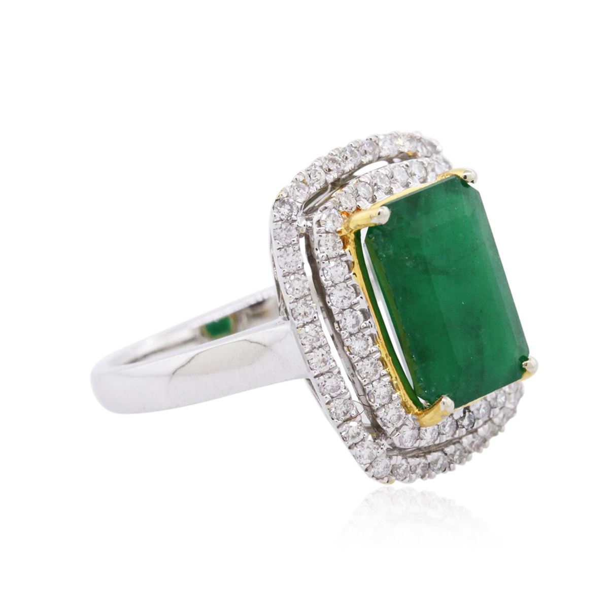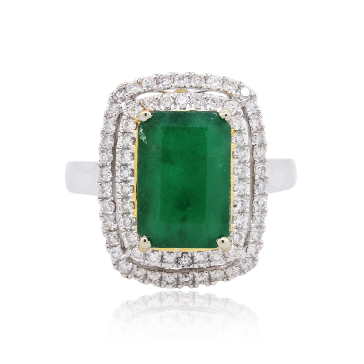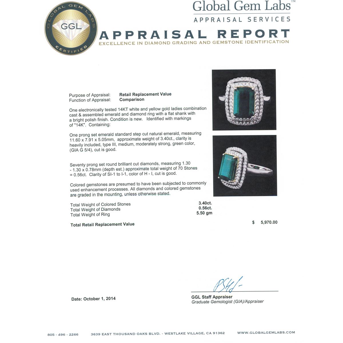 One electronically tested 14KT white and yellow gold ladies combination cast & assembled emerald and diamond ring with a flat shank with a bright polish finish. Identified with markings of "14K". Condition is new. Containing: One prong set emerald standard step cut natural emerald, measuring 11.60 x 7.91 x 5.05mm, approximate weight of 3.40ct., clarity is heavily included, type III, medium, moderately strong, green color, (GIA G 5/4), cut is good. Seventy prong set round brilliant cut diamonds, measuring 1.30 - 1.30 x 0.78mm (depth est.) approximate total weight of 70 Stones = 0.56ct. Clarity: SI-1 to I-1. Color: H - I, Cut is Good. Colored gemstones are presumed to have been subjected to commonly used enhancement processes. All diamonds and colored gemstones are graded in the mounting, unless otherwise stated. Total Weight of Colored Stones 3.40ct. Total Weight of Diamonds 0.56ct. Total Weight of Ring 5.50 grams. GGL Appraised at $5,970.00.