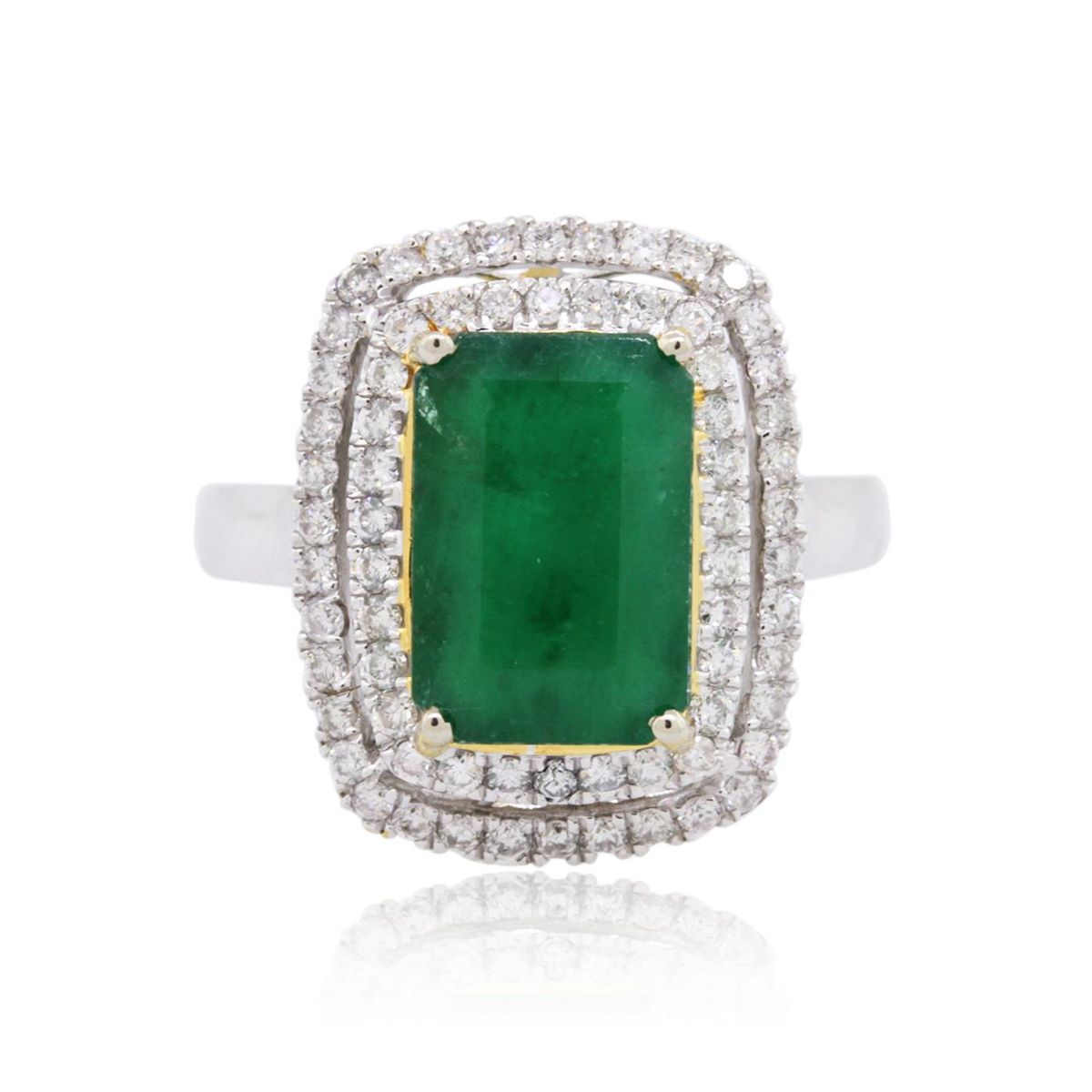 One electronically tested 14KT white and yellow gold ladies combination cast & assembled emerald and diamond ring with a flat shank with a bright polish finish. Identified with markings of "14K". Condition is new. Containing: One prong set emerald standard step cut natural emerald, measuring 11.60 x 7.91 x 5.05mm, approximate weight of 3.40ct., clarity is heavily included, type III, medium, moderately strong, green color, (GIA G 5/4), cut is good. Seventy prong set round brilliant cut diamonds, measuring 1.30 - 1.30 x 0.78mm (depth est.) approximate total weight of 70 Stones = 0.56ct. Clarity: SI-1 to I-1. Color: H - I, Cut is Good. Colored gemstones are presumed to have been subjected to commonly used enhancement processes. All diamonds and colored gemstones are graded in the mounting, unless otherwise stated. Total Weight of Colored Stones 3.40ct. Total Weight of Diamonds 0.56ct. Total Weight of Ring 5.50 grams. GGL Appraised at $5,970.00.