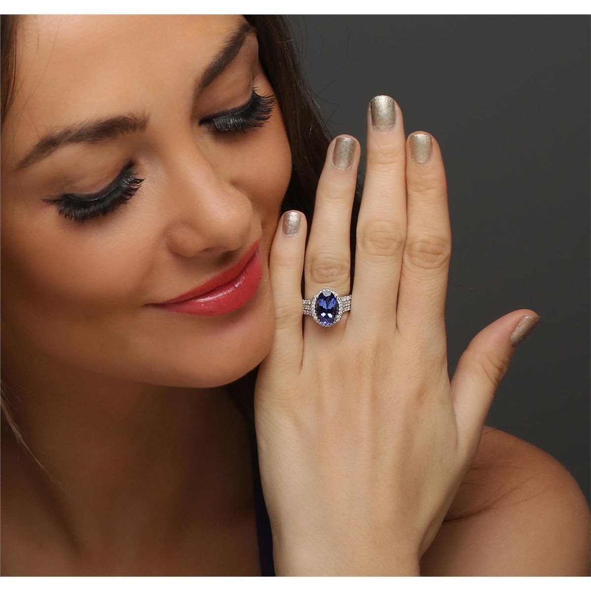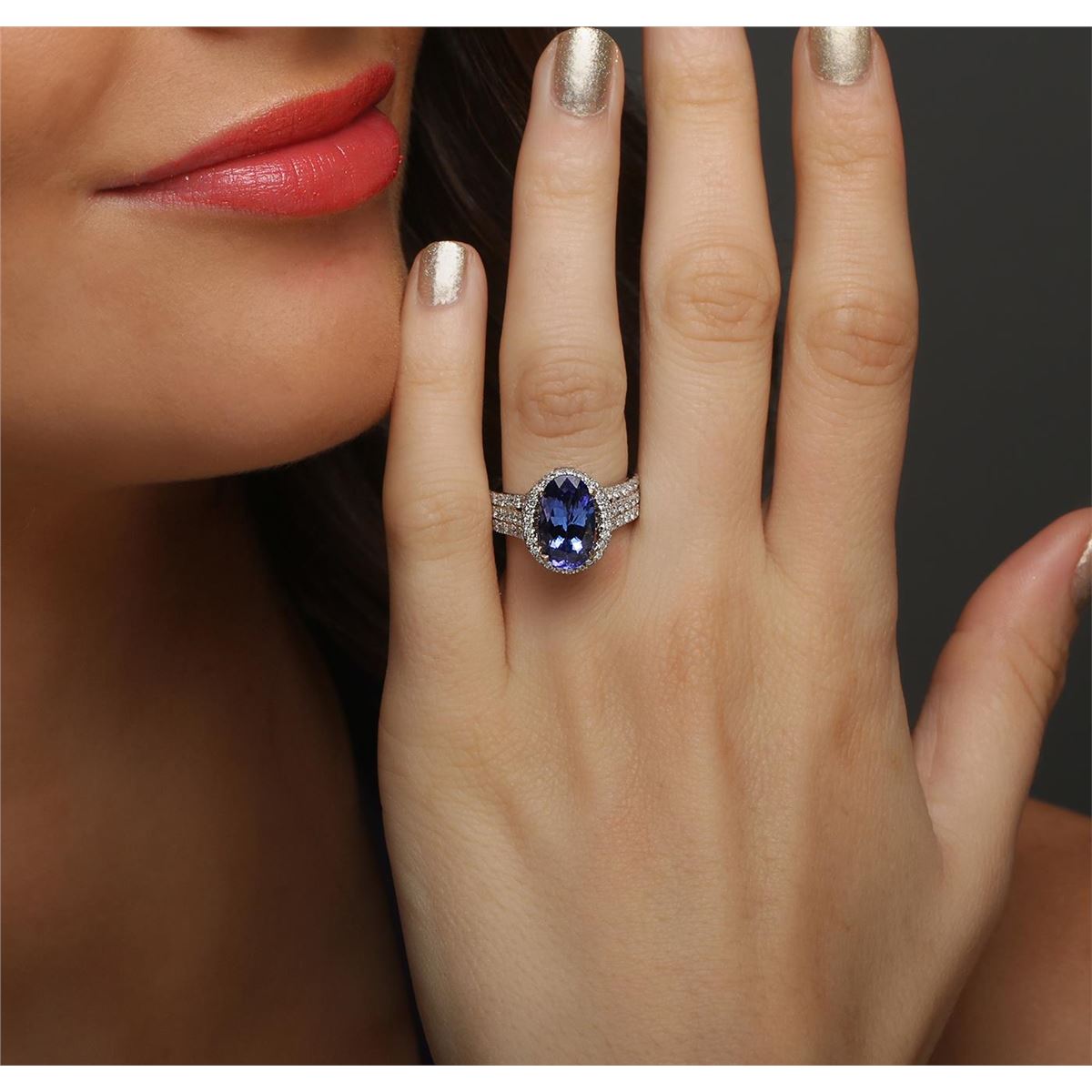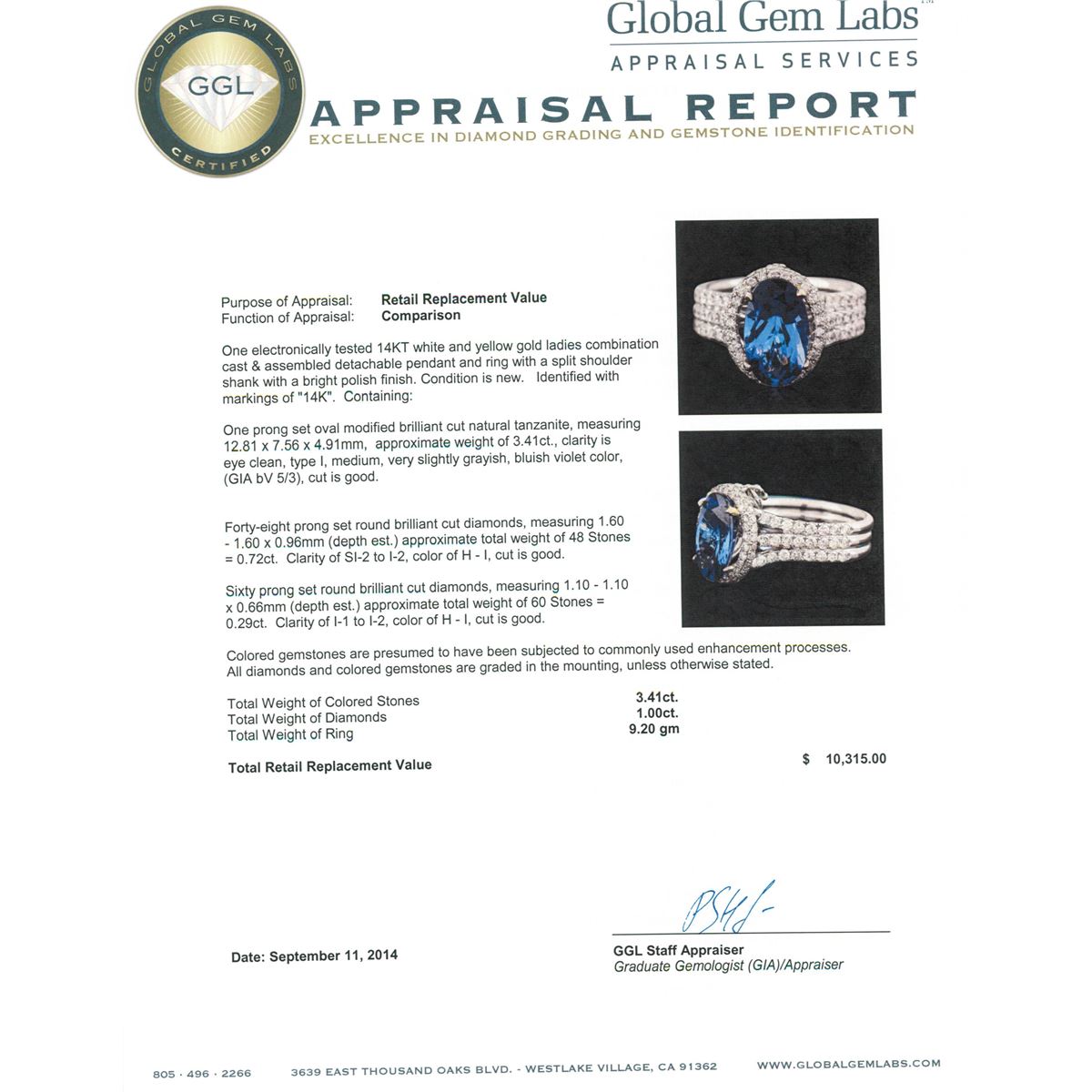 One electronically tested 14KT white and yellow gold ladies combination cast & assembled detachable pendant and ring with a split shoulder shank with a bright polish finish. Identified with markings of "14K". Condition is new. Containing: One prong set oval modified brilliant cut natural tanzanite, measuring 12.81 x 7.56 x 4.91mm, approximate weight of 3.41ct., clarity is eye clean, type I, medium, very slightly grayish, bluish violet color, (GIA bV 5/3), cut is good. Forty-Eight prong set round brilliant cut diamonds, measuring 1.60 - 1.60 x 0.96mm (depth est.) approximate total weight of 48 Stones = 0.72ct. Clarity: SI-2 to I-2. Color: H - I, Cut is Good. Sixty prong set round brilliant cut diamonds, measuring 1.10 - 1.10 x 0.66mm (depth est.) approximate total weight of 60 Stones = 0.29ct. Clarity: I-1 to I-2. Color: H - I, Cut is Good. Colored gemstones are presumed to have been subjected to commonly used enhancement processes. All diamonds and colored gemstones are graded in the mounting, unless otherwise stated. Total Weight of Colored Stones 3.41ct. Total Weight of Diamonds 1.00ct. Total Weight of Ring 9.20 grams. GGL Appraised at $10,315.00.