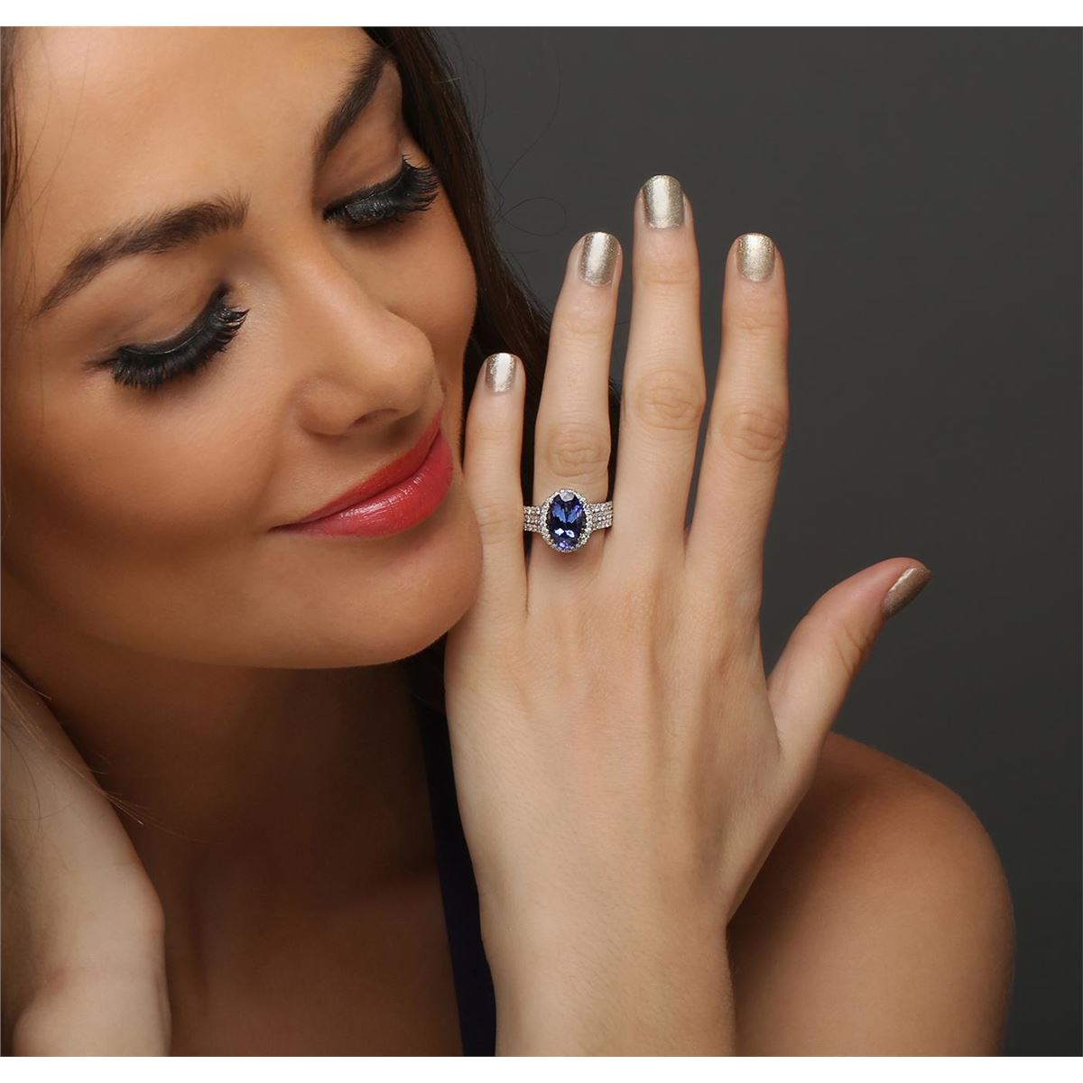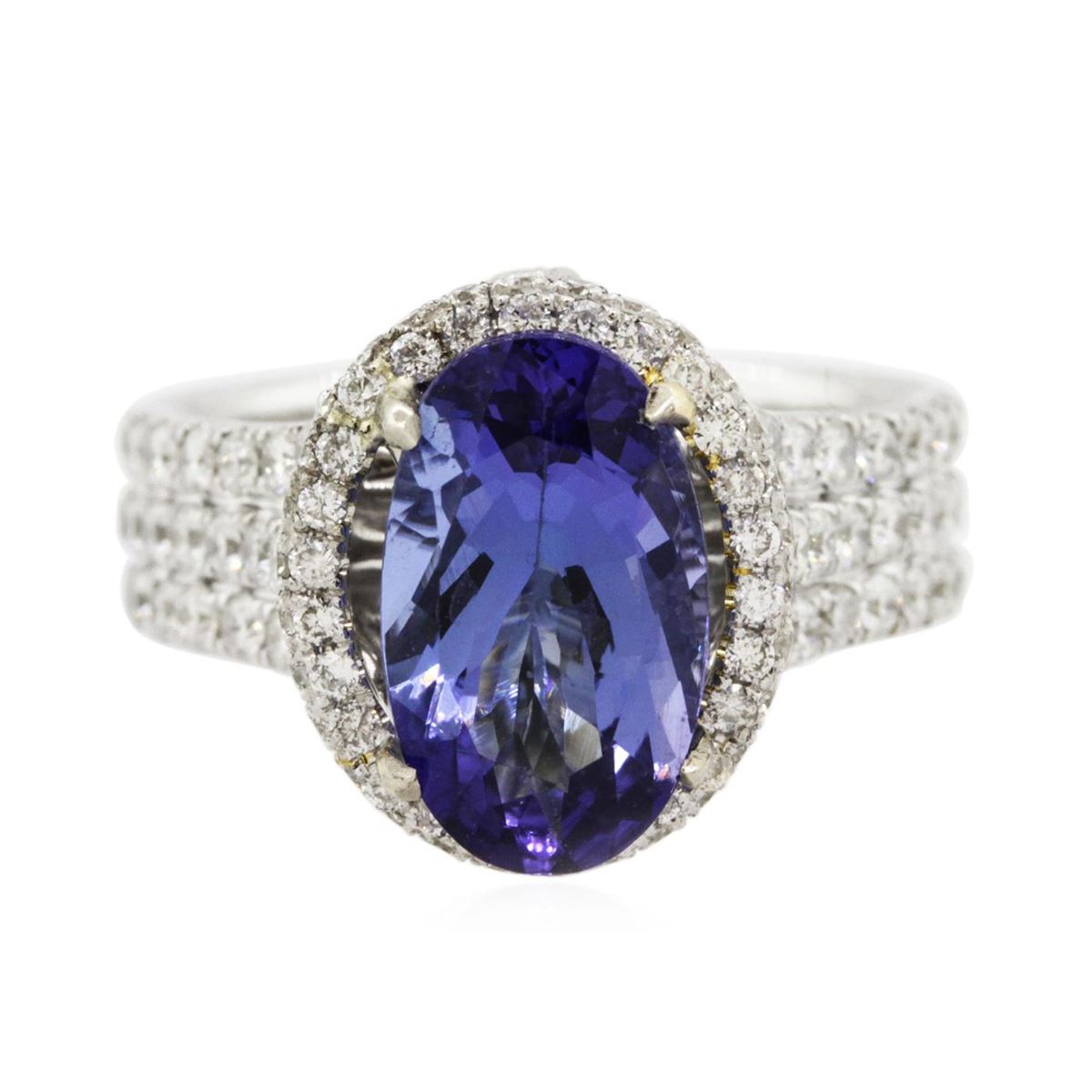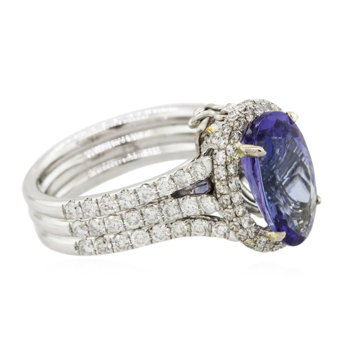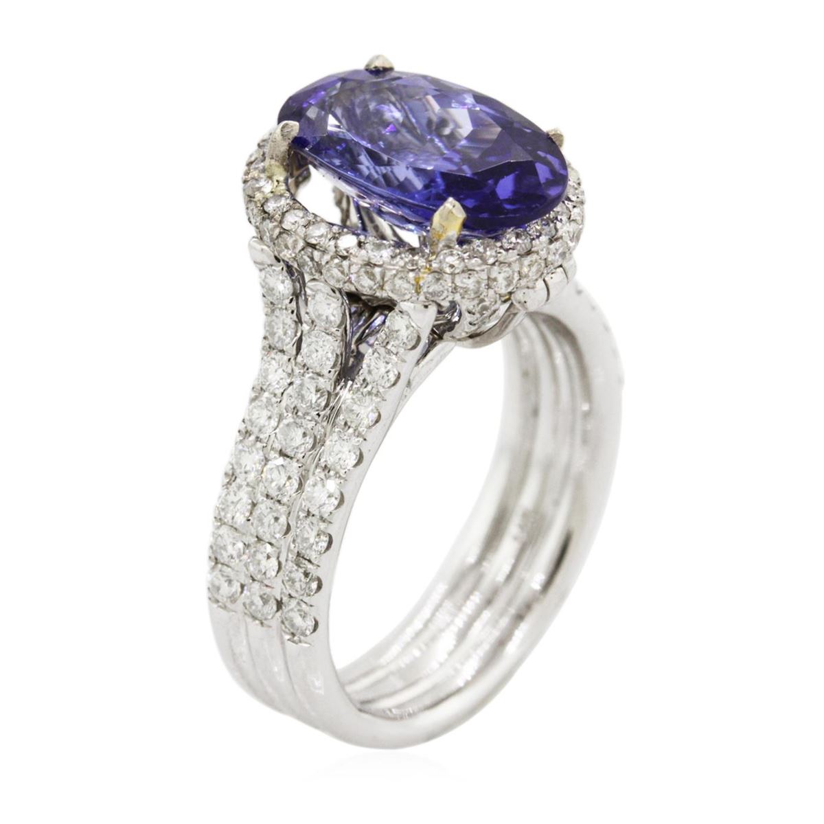 One electronically tested 14KT white and yellow gold ladies combination cast & assembled detachable pendant and ring with a split shoulder shank with a bright polish finish. Identified with markings of "14K". Condition is new. Containing: One prong set oval modified brilliant cut natural tanzanite, measuring 12.81 x 7.56 x 4.91mm, approximate weight of 3.41ct., clarity is eye clean, type I, medium, very slightly grayish, bluish violet color, (GIA bV 5/3), cut is good. Forty-Eight prong set round brilliant cut diamonds, measuring 1.60 - 1.60 x 0.96mm (depth est.) approximate total weight of 48 Stones = 0.72ct. Clarity: SI-2 to I-2. Color: H - I, Cut is Good. Sixty prong set round brilliant cut diamonds, measuring 1.10 - 1.10 x 0.66mm (depth est.) approximate total weight of 60 Stones = 0.29ct. Clarity: I-1 to I-2. Color: H - I, Cut is Good. Colored gemstones are presumed to have been subjected to commonly used enhancement processes. All diamonds and colored gemstones are graded in the mounting, unless otherwise stated. Total Weight of Colored Stones 3.41ct. Total Weight of Diamonds 1.00ct. Total Weight of Ring 9.20 grams. GGL Appraised at $10,315.00.