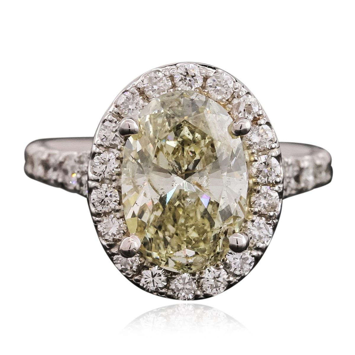 One electronically tested 14KT white and yellow gold ladies combination cast & assembled engagement ring with a split shank with a bright polish finish. Identified with markings of "14K". Condition is new. Containing: One prong set oval shaped cut diamond, measuring 11.50 x 7.83 x 4.89mm (depth est.) approximate weight of 2.83ct. Clarity: I-1, Cut is Good. Thirty prong set round brilliant cut diamonds, measuring 2.00 - 1.50 x 1.05mm (depth est.) approximate total weight of 30 Stones = 0.59ct. Clarity: SI-1 to I-1. Color: H - I, Cut is Good. All diamonds are graded in the mounting, unless otherwise stated. Total Weight of Diamonds 3.42ct. Total Weight of Ring 5.80 grams. GGL Appraised at $36,055.00.