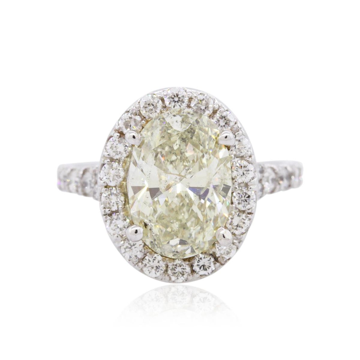 One electronically tested 14KT white and yellow gold ladies combination cast & assembled engagement ring with a split shank with a bright polish finish. Identified with markings of "14K". Condition is new. Containing: One prong set oval shaped cut diamond, measuring 11.50 x 7.83 x 4.89mm (depth est.) approximate weight of 2.83ct. Clarity: I-1, Cut is Good. Thirty prong set round brilliant cut diamonds, measuring 2.00 - 1.50 x 1.05mm (depth est.) approximate total weight of 30 Stones = 0.59ct. Clarity: SI-1 to I-1. Color: H - I, Cut is Good. All diamonds are graded in the mounting, unless otherwise stated. Total Weight of Diamonds 3.42ct. Total Weight of Ring 5.80 grams. GGL Appraised at $36,055.00.