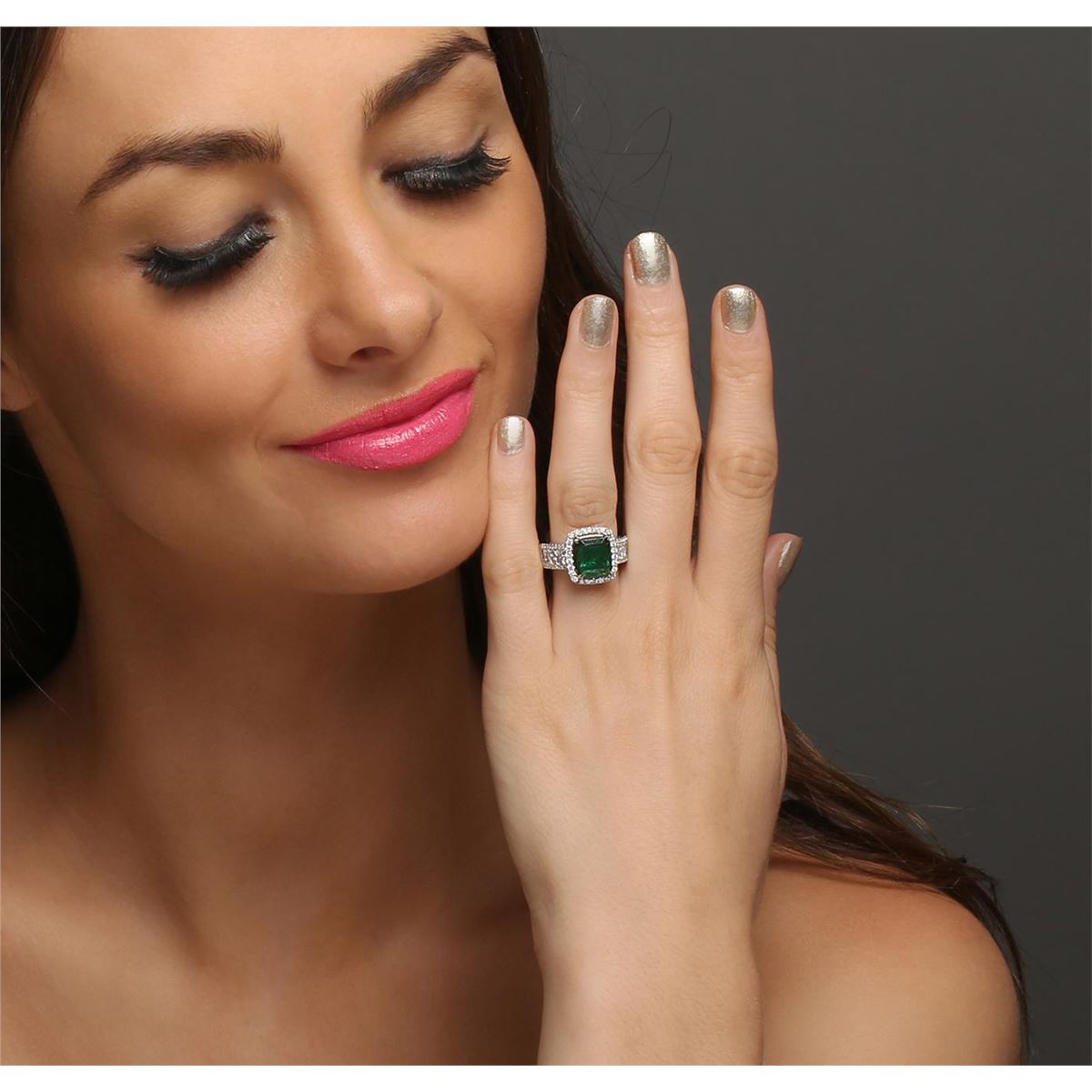 One electronically tested 14KT white and yellow gold ladies combination cast & assembled emerald and diamond ring with a flat shank with a bright polish finish. Identified with markings of "14K". Condition is new. Containing: One prong set emerald standard step cut natural emerald, measuring 9.68 x 8.67 x 5.59mm, approximate weight of 3.45ct., clarity is heavily included, type III, medium dark, moderately strong, green color, (GIA G 6/4), cut is good. Fifty-Seven prong set round brilliant cut diamonds, measuring 1.30 - 1.00 x 0.69mm (depth est.) approximate total weight of 57 Stones = 0.31ct. Clarity: I-1 to I-2. Color: I - J, Cut is Good. Sixteen invisible set princess cut diamonds, measuring 2.00 x 2.00 x 1.50mm (depth est.) approximate total weight of 16 Stones = 0.79ct. Clarity: SI-1. Color: H - I, Cut is Good. Colored gemstones are presumed to have been subjected to commonly used enhancement processes. All diamonds and colored gemstones are graded in the mounting, unless otherwise stated total weight of Colored Stones 3.45ct. Total Weight of Diamonds 1.10ct. Total Weight of Ring 6.40 grams. GGL Appraised at $10,940.00.