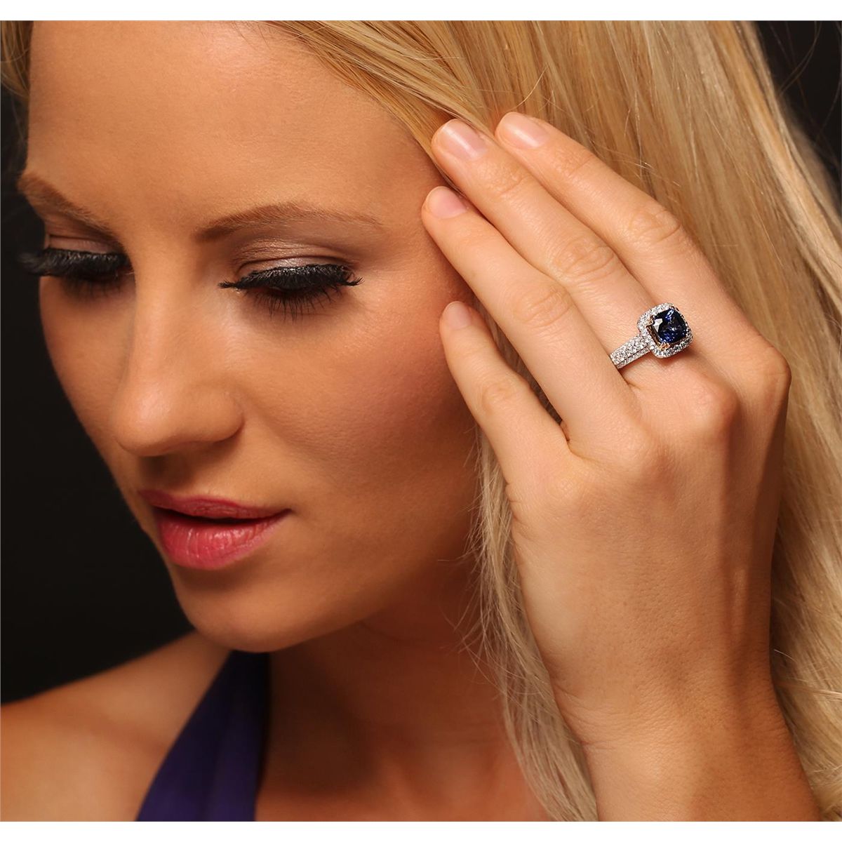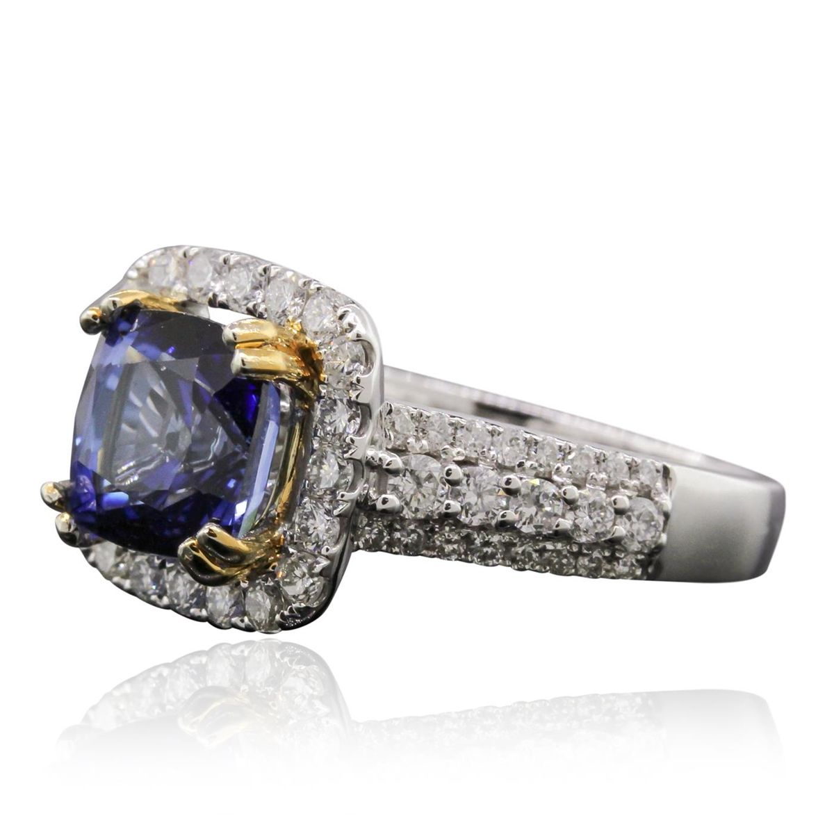 One electronically tested 14KT white and yellow gold Ladies combination cast & assembled ring with a high polish finish. Condition is new. Identified with markings of "14K". Containing: One prong set square cushion modified mixed cut natural tanzanite, measuring 8.00 x 8.00 x 6.08mm, approximate weight of 3.47ct., clarity is eye clean, type I, medium, moderately strong, blue color, (GIA B 5/4), cut is very good. Colored gemstones are presumed to have been subjected to commonly used color/clarity enhancement processes. Sixty-Three bead set round brilliant cut diamonds, measuring 1.80 - 1.20 x 0.90mm (depth est.) approximate. Total Weight of 63 Stones = 1.08ct. Clarity: SI-2 to I-2. Color: H - I, Cut is Good. Total Weight of Colored Stones 3.47ct. Total Weight of Diamonds 1.08ct. Total Weight of Ring 6.10 grams. GGL Appraised at $8,420.00.