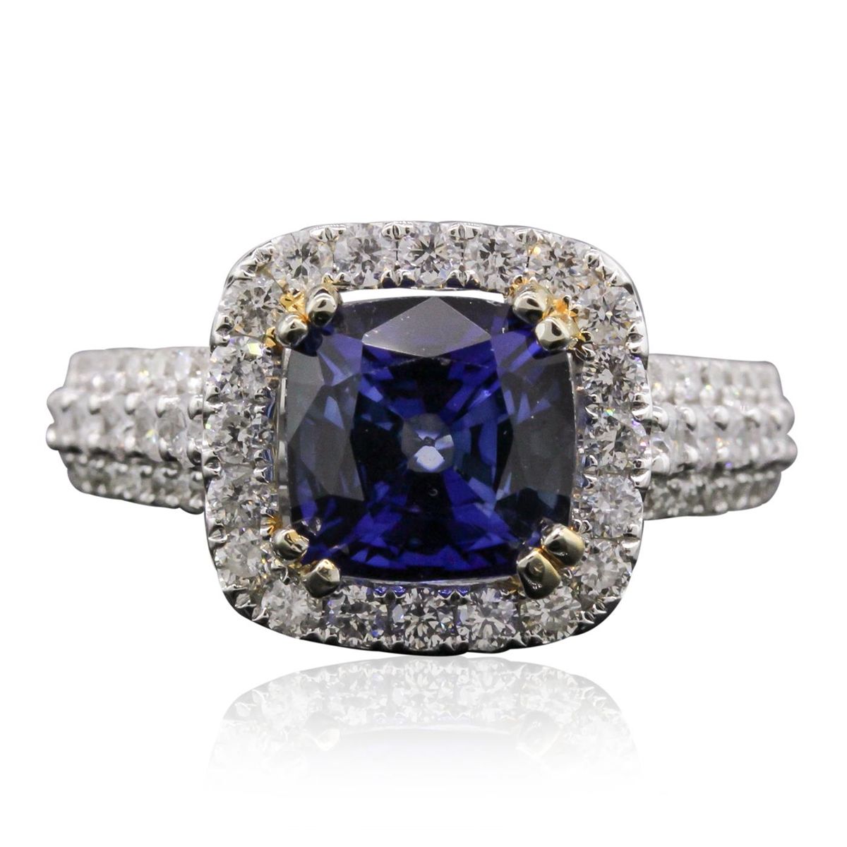 One electronically tested 14KT white and yellow gold Ladies combination cast & assembled ring with a high polish finish. Condition is new. Identified with markings of "14K". Containing: One prong set square cushion modified mixed cut natural tanzanite, measuring 8.00 x 8.00 x 6.08mm, approximate weight of 3.47ct., clarity is eye clean, type I, medium, moderately strong, blue color, (GIA B 5/4), cut is very good. Colored gemstones are presumed to have been subjected to commonly used color/clarity enhancement processes. Sixty-Three bead set round brilliant cut diamonds, measuring 1.80 - 1.20 x 0.90mm (depth est.) approximate. Total Weight of 63 Stones = 1.08ct. Clarity: SI-2 to I-2. Color: H - I, Cut is Good. Total Weight of Colored Stones 3.47ct. Total Weight of Diamonds 1.08ct. Total Weight of Ring 6.10 grams. GGL Appraised at $8,420.00.