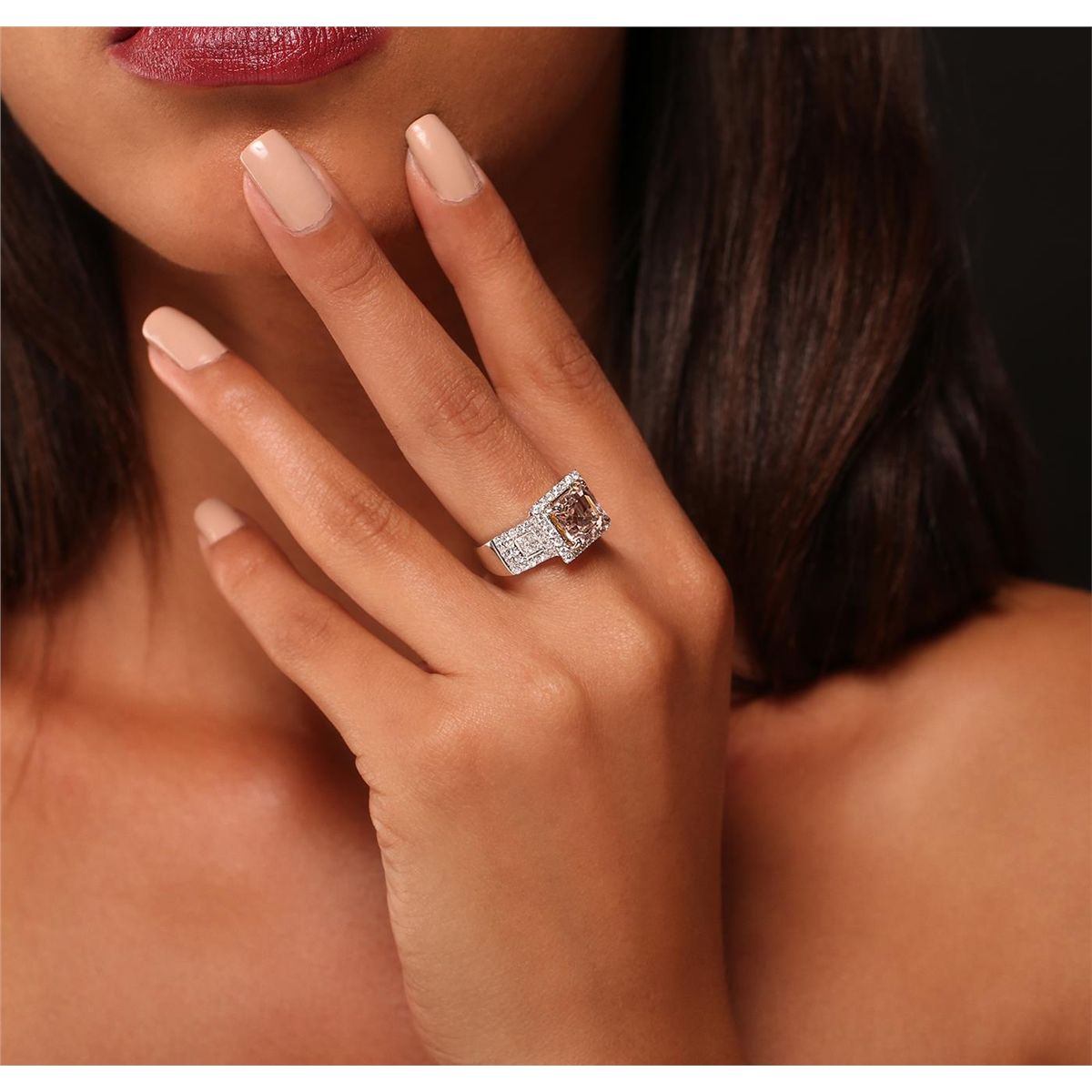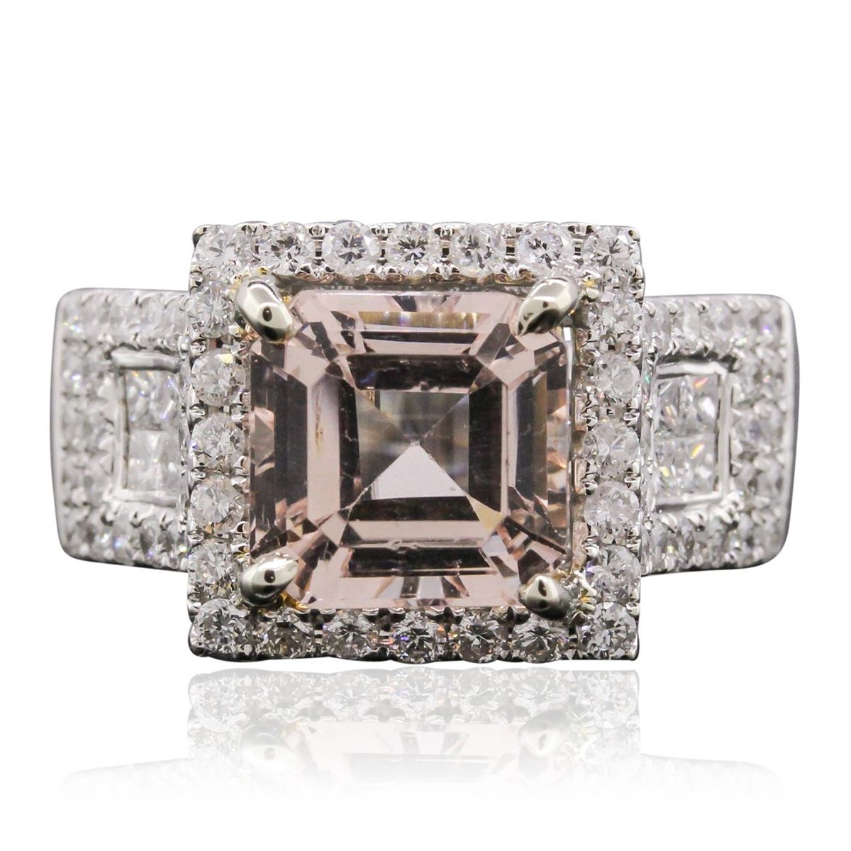One electronically tested 14KT white and yellow gold Ladies combination cast & assembled ring with a high polish finish. Condition is new. Identified with markings of "14K". Containing: One prong set emerald standard step cut natural morganite, measuring 8.60 x 8.60 x 6.20mm, approximate weight of 3.49ct., clarity is eye clean, type I, light, brownish, reddish orange color, (GIA rO 3/1), cut is very good. Colored gemstones are presumed to have been subjected to commonly used color/clarity enhancement processes. Sixty-Six bead set round brilliant cut diamonds, measuring 1.50 - 1.50 x 0.90mm (depth est.) approximate. Total Weight of 66 Stones = 1.00ct. Clarity: SI-1 to I-1. Color: G - H, Cut is Good. Eight invisible set princess cut diamonds, measuring 1.60 x 1.60 x 1.21mm (depth est.) approximate. Total Weight of 8 Stones = 0.43ct. Clarity: VS-2 to SI-1. Color: G - H, Cut is Good. Total Weight of Colored Stones 3.49ct. Total Weight of Diamonds 1.43ct. Total Weight of Ring 8.10 grams. GGL Appraised at $7,700.00.