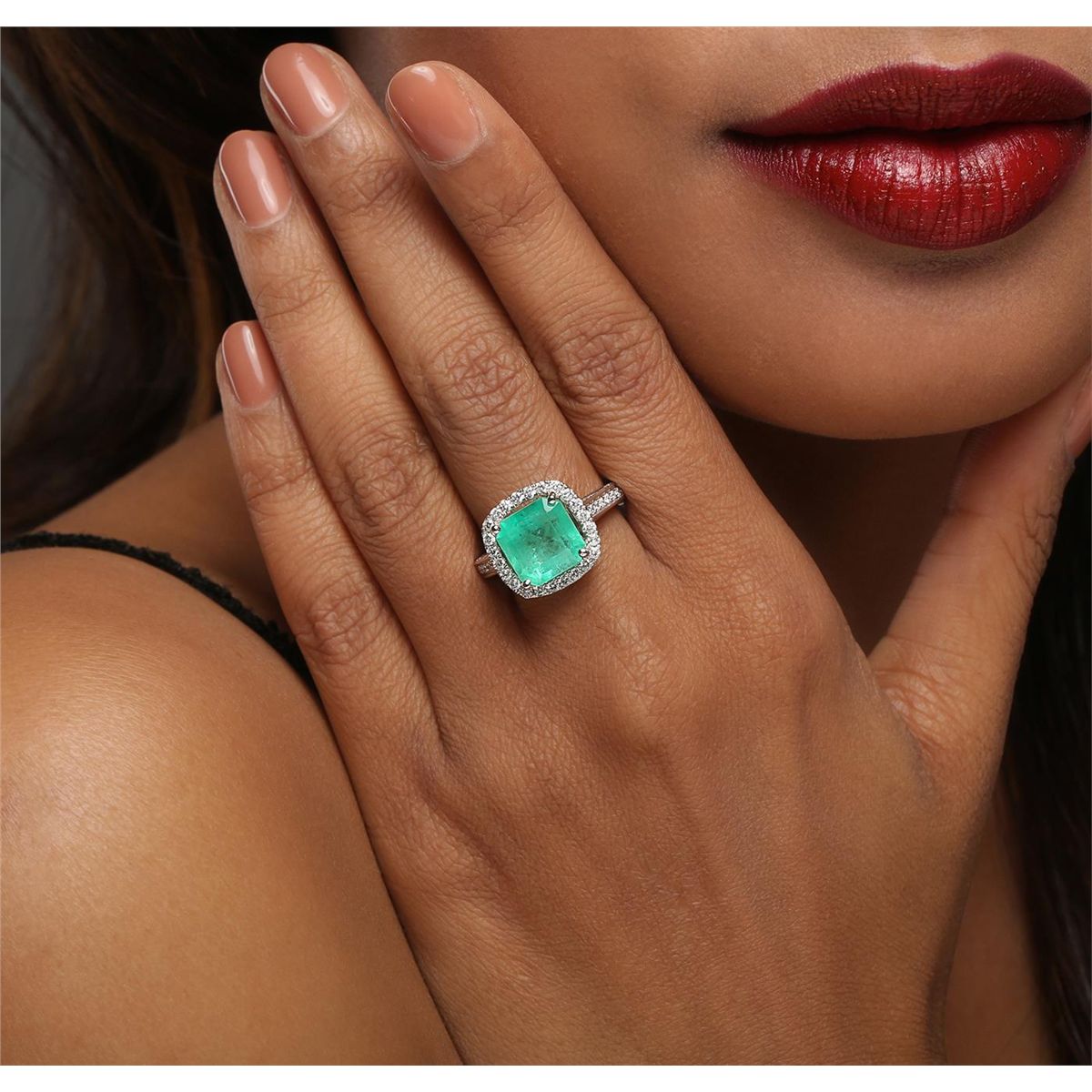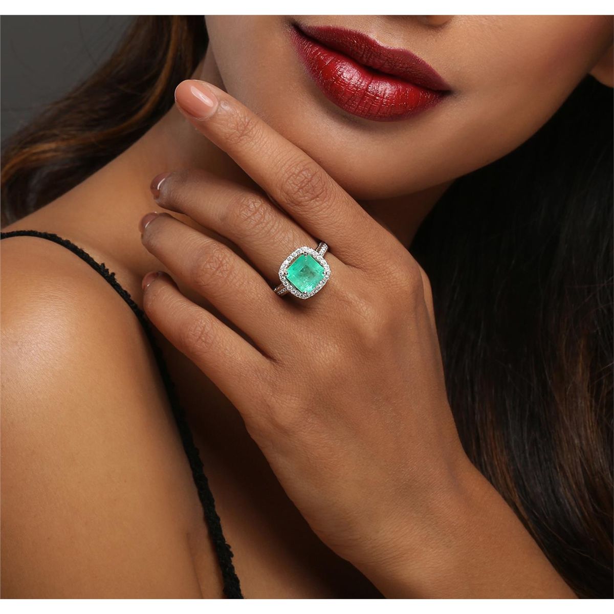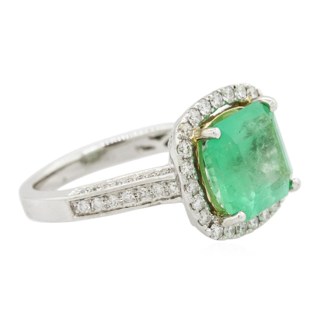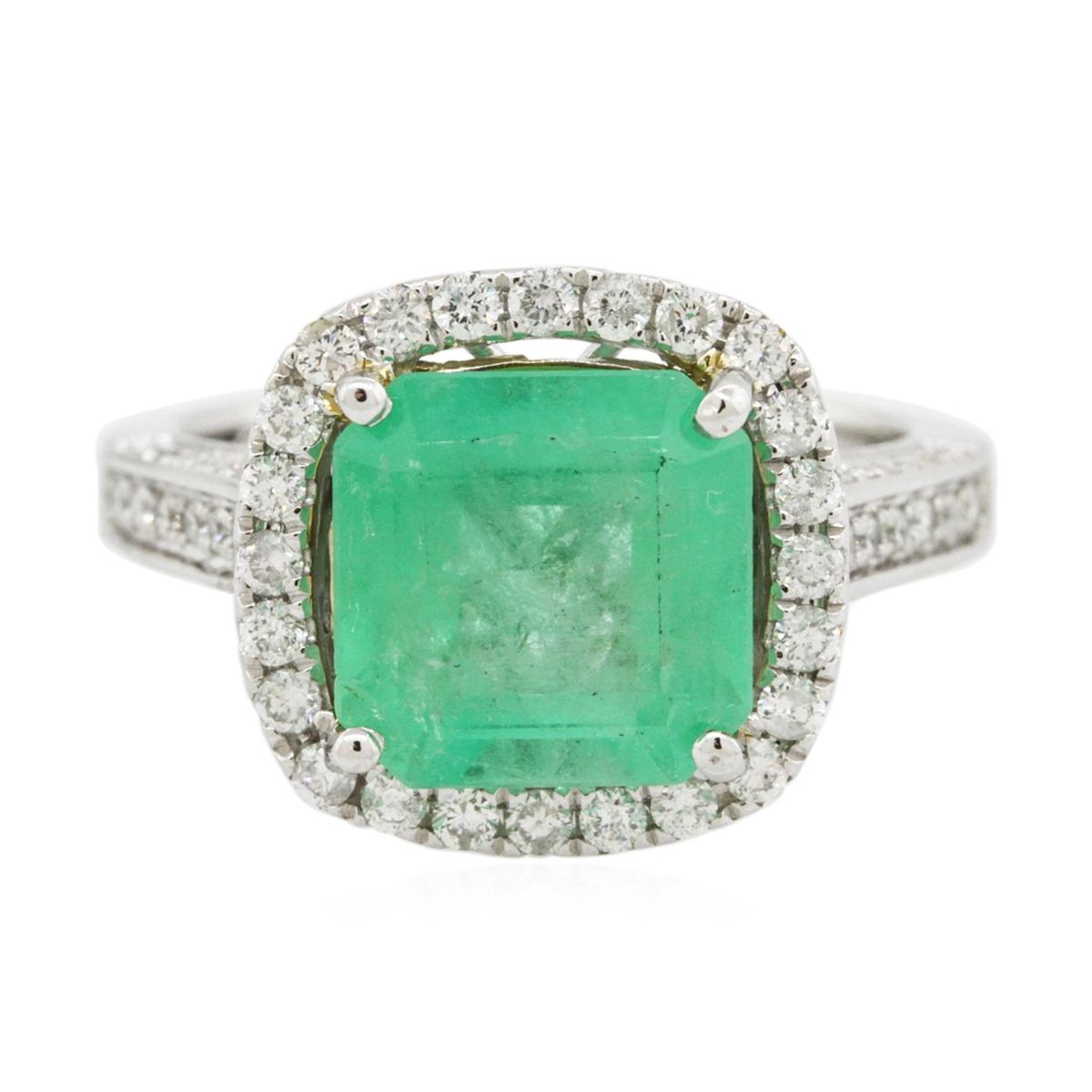 One electronically tested 14KT white and yellow gold ladies combination cast & assembled emerald and diamond ring with a cathedral shank with a bright polish finish. Identified with markings of "14K". Condition is new. Containing: One prong set square cushion modified brilliant cut natural emerald, measuring 9.51 x 9.46 x 6.09mm, approximate weight of 3.50ct., clarity is slightly included, type III, medium light, very slightly grayish, very slightly bluish green color, (GIA vslbG 4/3), cut is good. Ninety-Four prong set round brilliant cut diamonds, measuring 1.30 - 1.10 x 0.72mm (depth est.) approximate total weight of 94 Stones = 0.59ct. Clarity: I-1 to I-2. Color: H - I, Cut is Good. Colored gemstones are presumed to have been subjected to commonly used enhancement processes. All diamonds and colored gemstones are graded in the mounting, unless otherwise stated. Total Weight of Colored Stones 3.50ct. Total Weight of Diamonds 0.59ct. Total Weight of Ring 6.30 grams. GGL Appraised at $10,515.00.