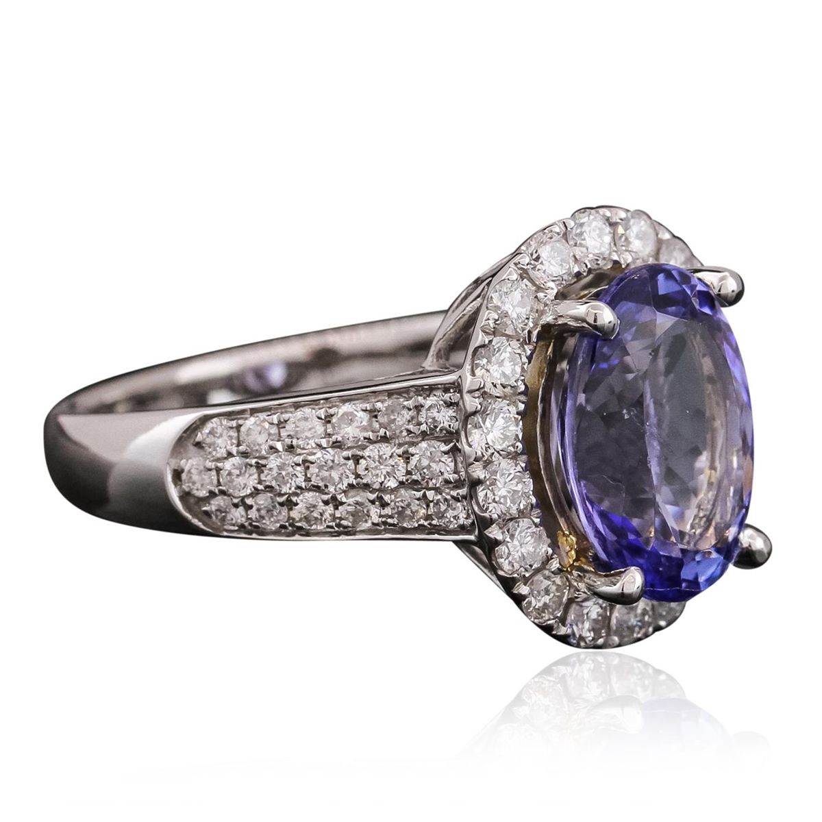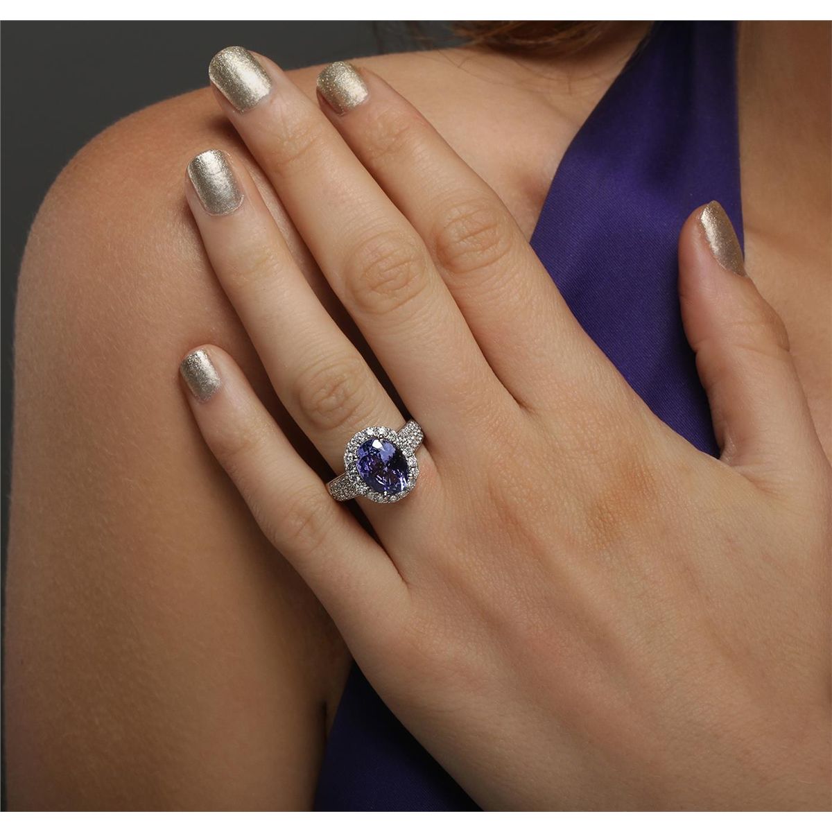 One electronically tested 14KT white and yellow gold ladies combination cast & assembled tanzanite and diamond ring with a tapered shank with a bright polish finish. Identified with markings of "14K". Condition is new. Containing: One prong set oval modified brilliant cut natural tanzanite, measuring 11.21 x 8.57 x 5.36mm, approximate weight of 3.51ct., clarity is eye clean, type I, medium, moderately strong, violet color, (GIA V 5/4), cut is good. Eighteen prong set round brilliant cut diamonds, measuring 1.70 - 1.70 x 1.02mm (depth est.) approximate total weight of 18 Stones = 0.32ct. Clarity: I-1 to I-2. Color: H - I, Cut is Good. Thirty-Six prong set round brilliant cut diamonds, measuring 1.30 - 1.30 x 0.78mm (depth est.) approximate total weight of 36 Stones = 0.29ct. Clarity: SI-2 to I-2. Color: H - I, Cut is Good. Colored gemstones are presumed to have been subjected to commonly used enhancement processes. All diamonds and colored gemstones are graded in the mounting, unless otherwise stated. Total Weight of Colored Stones 3.51ct. Total Weight of Diamonds 0.61ct. Total Weight of Ring 5.80 grams. GGL Appraised at $8,040.00.