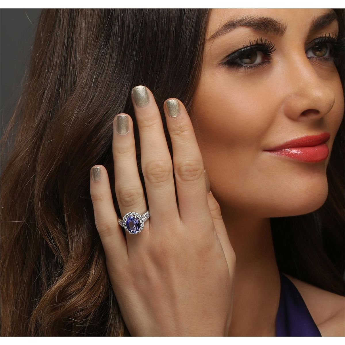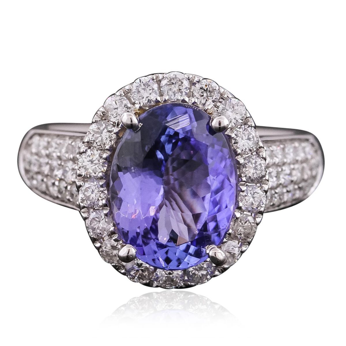 One electronically tested 14KT white and yellow gold ladies combination cast & assembled tanzanite and diamond ring with a tapered shank with a bright polish finish. Identified with markings of "14K". Condition is new. Containing: One prong set oval modified brilliant cut natural tanzanite, measuring 11.21 x 8.57 x 5.36mm, approximate weight of 3.51ct., clarity is eye clean, type I, medium, moderately strong, violet color, (GIA V 5/4), cut is good. Eighteen prong set round brilliant cut diamonds, measuring 1.70 - 1.70 x 1.02mm (depth est.) approximate total weight of 18 Stones = 0.32ct. Clarity: I-1 to I-2. Color: H - I, Cut is Good. Thirty-Six prong set round brilliant cut diamonds, measuring 1.30 - 1.30 x 0.78mm (depth est.) approximate total weight of 36 Stones = 0.29ct. Clarity: SI-2 to I-2. Color: H - I, Cut is Good. Colored gemstones are presumed to have been subjected to commonly used enhancement processes. All diamonds and colored gemstones are graded in the mounting, unless otherwise stated. Total Weight of Colored Stones 3.51ct. Total Weight of Diamonds 0.61ct. Total Weight of Ring 5.80 grams. GGL Appraised at $8,040.00.
