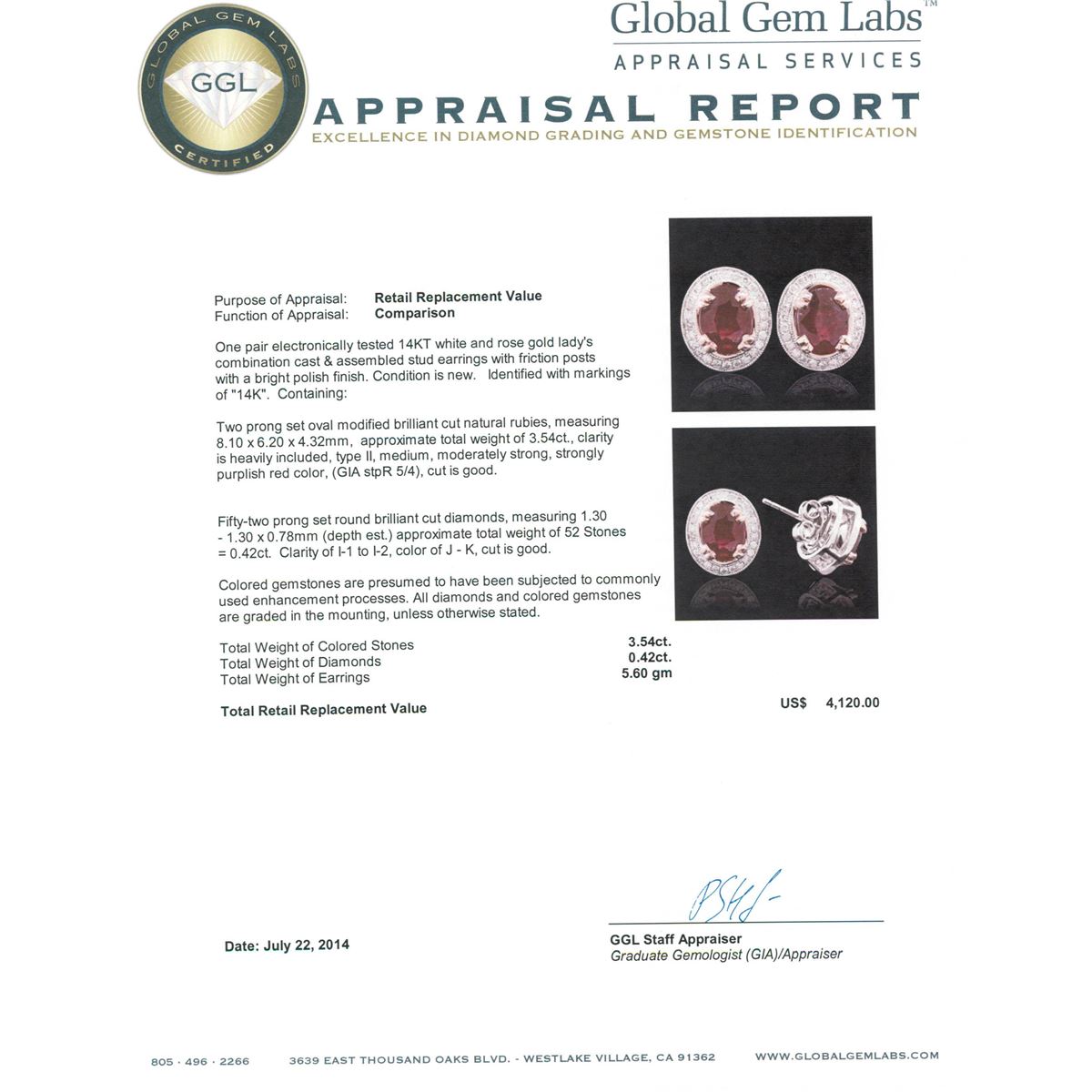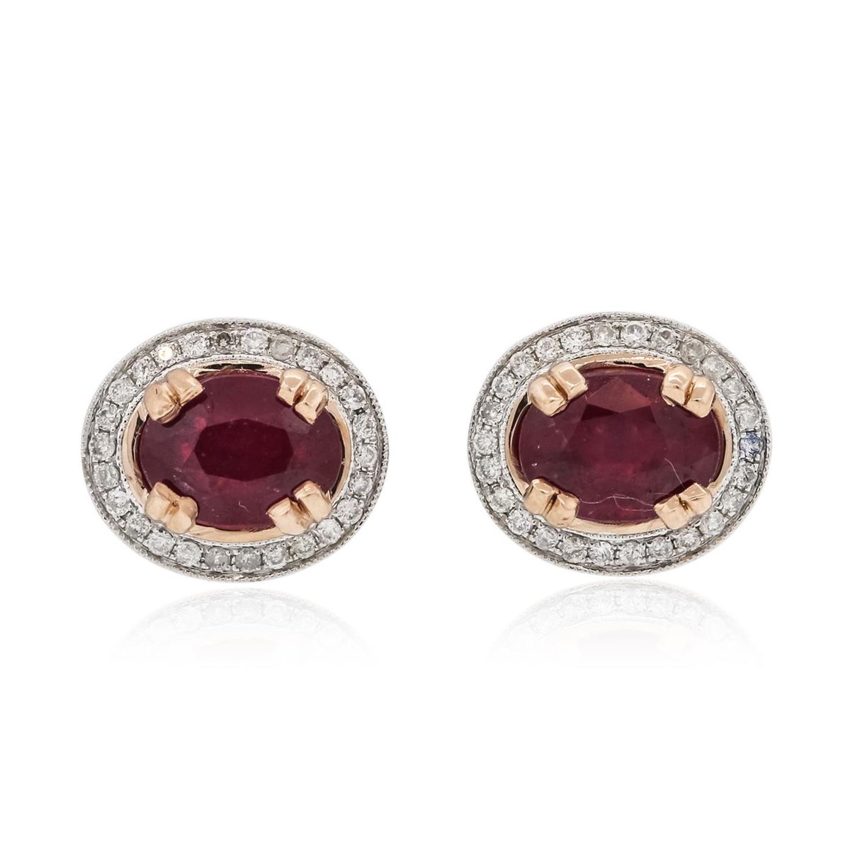 One pair electronically tested 14KT white and rose gold ladies combination cast & assembled stud earrings with friction posts with a bright polish finish. Condition is new. Identified with markings of "14K". Containing: Two prong set oval modified brilliant cut natural rubies, measuring 8.10 x 6.20 x 4.32mm, approximate total weight of 3.54ct., clarity is heavily included, type II, medium, moderately strong, strongly purplish red color, (GIA stpR 5/4), cut is good. Fifty-Two prong set round brilliant cut diamonds, measuring 1.30 - 1.30 x 0.78mm (depth est.) approximate total weight of 52 Stones = 0.42ct. Clarity: I-1 to I-2. Color: J - K, Cut is Good. Colored gemstones are presumed to have been subjected to commonly used enhancement processes. All diamonds and colored gemstones are graded in the mounting, unless otherwise stated. Total Weight of Colored Stones 3.54ct. Total Weight of Diamonds 0.42ct. Total Weight of Earrings 5.60 grams. GGL Appraised at $4,120.00.