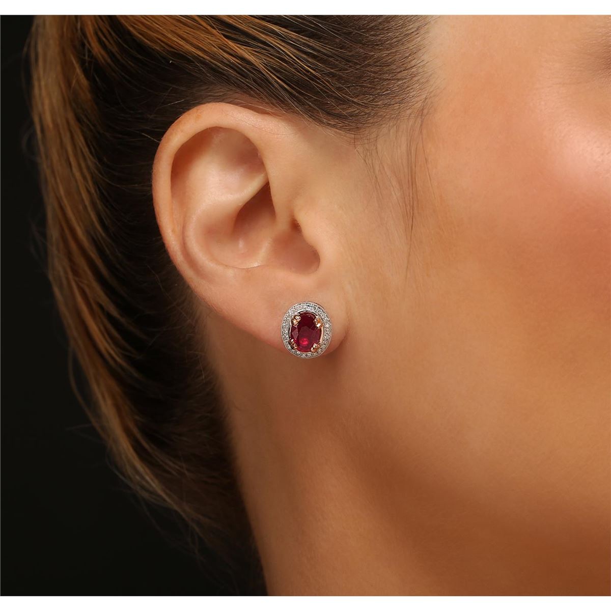 One pair electronically tested 14KT white and rose gold ladies combination cast & assembled stud earrings with friction posts with a bright polish finish. Condition is new. Identified with markings of "14K". Containing: Two prong set oval modified brilliant cut natural rubies, measuring 8.10 x 6.20 x 4.32mm, approximate total weight of 3.54ct., clarity is heavily included, type II, medium, moderately strong, strongly purplish red color, (GIA stpR 5/4), cut is good. Fifty-Two prong set round brilliant cut diamonds, measuring 1.30 - 1.30 x 0.78mm (depth est.) approximate total weight of 52 Stones = 0.42ct. Clarity: I-1 to I-2. Color: J - K, Cut is Good. Colored gemstones are presumed to have been subjected to commonly used enhancement processes. All diamonds and colored gemstones are graded in the mounting, unless otherwise stated. Total Weight of Colored Stones 3.54ct. Total Weight of Diamonds 0.42ct. Total Weight of Earrings 5.60 grams. GGL Appraised at $4,120.00.