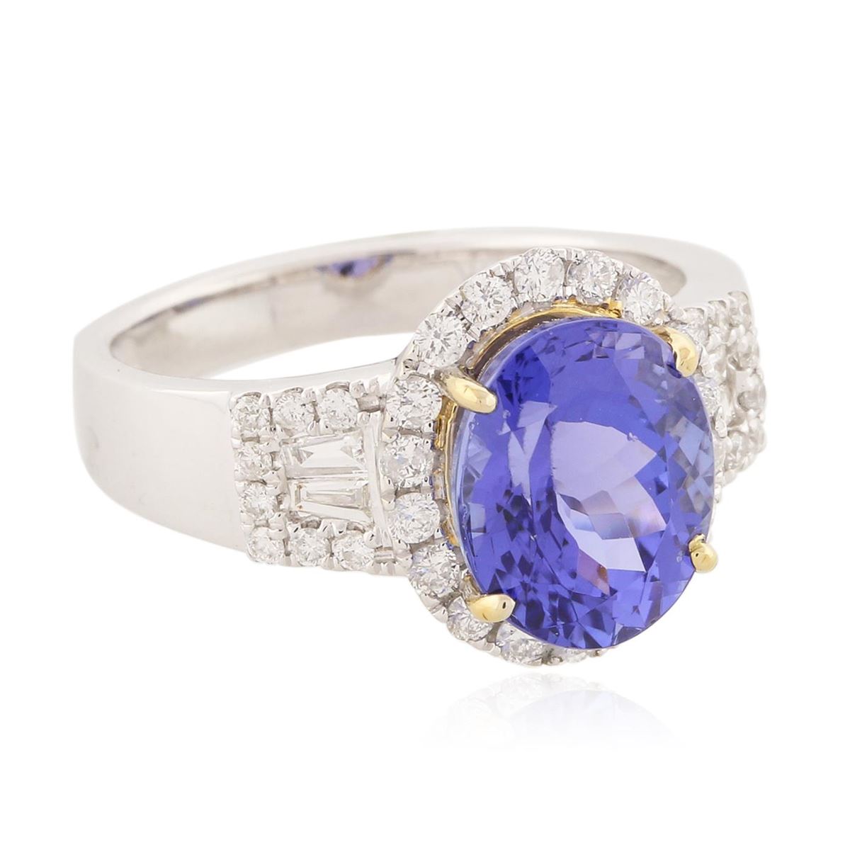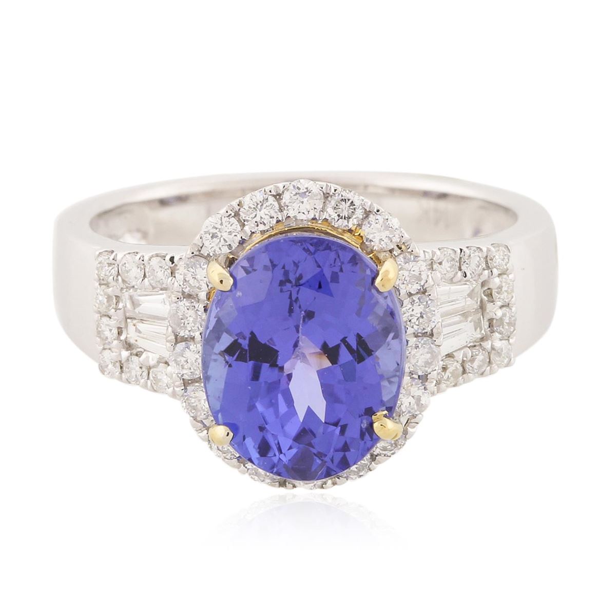 One electronically tested 14KT white and yellow gold Ladies combination cast & assembled fancy ring with a bright polish finish. Condition is new. Identified with markings of "14K". Containing: One prong set oval modified mixed cut natural tanzanite, measuring 10.00 x 8.00 x 6.50mm, approximate weight of 3.55ct., clarity is eye clean, type I, medium, moderately strong, bluish violet color, (GIA bV 5/4), cut is very good. Colored gemstones are presumed to have been subjected to commonly used color/clarity enhancement processes. Thirty-Four prong set round brilliant cut diamonds, measuring 1.40 - 1.10 x 0.75mm (depth est.) approximate. Total Weight of 34 Stones = 0.24ct. Clarity: I-1 to I-2. Color: G - H, Cut is Good. Four channel set baguette cut diamonds, measuring 3.00 x 2.00 x 1.70mm (depth est.) approximate. Total Weight of 4 Stones = 0.39ct. Clarity: SI-1 to SI-2. Color: H - I, Cut is Good. Total Weight of Colored Stones 3.55ct. Total Weight of Diamonds 0.63ct. Total Weight of Ring 5.20 grams. GGL Appraised at $8,130.00.