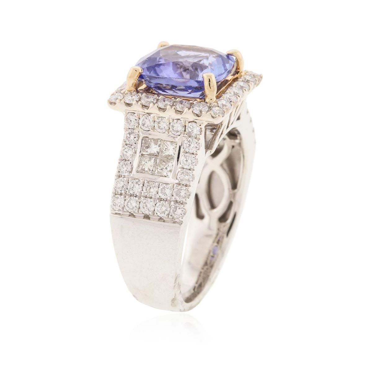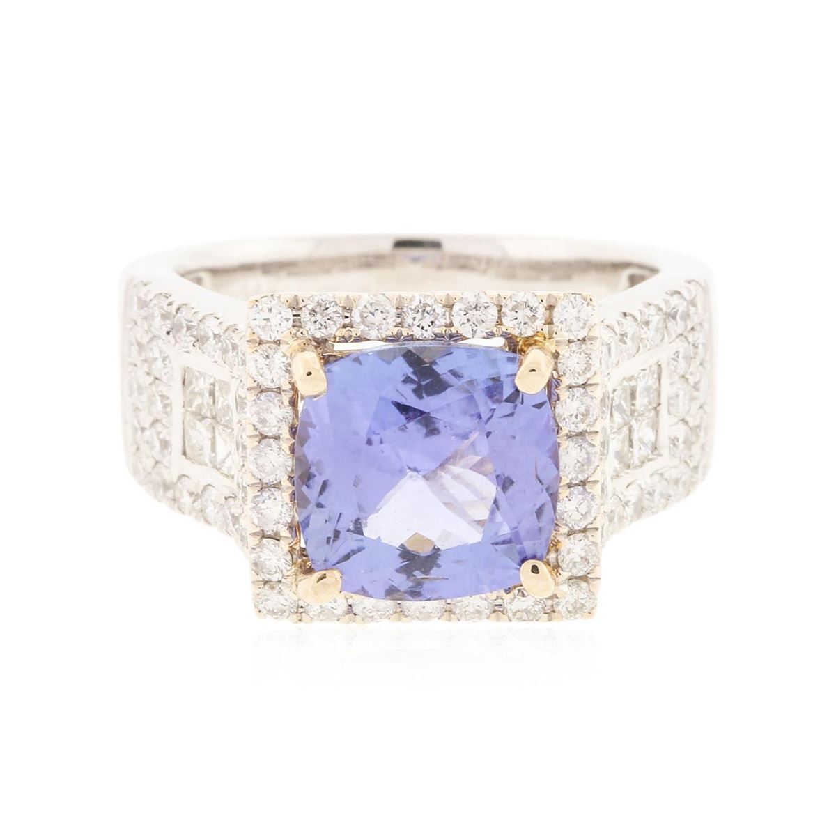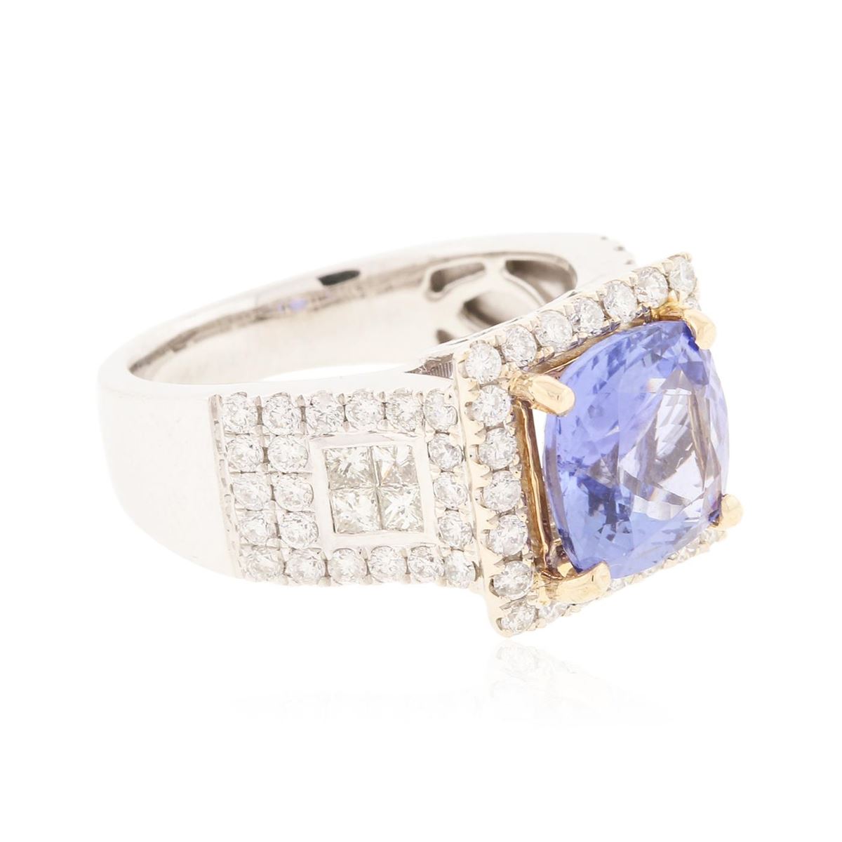 One electronically tested 14KT yellow and white gold Ladies combination cast & assembled ring with a bright polish finish. Condition is new. Identified with markings of "14K". Containing: One prong set square cushion modified mixed cut natural tanzanite, measuring 9.00 x 9.00 x 5.20mm, approximate weight of 3.56ct., clarity is eye clean, type I, medium light, very slightly grayish, violet color, (GIA V 4/3), cut is very good. Colored gemstones are presumed to have been subjected to commonly used color/clarity enhancement processes. Eight invisible set princess cut diamonds, measuring 1.90 x 1.90 x 1.43mm (depth est.) approximate. Total Weight of 8 Stones = 0.34ct. Clarity: SI-1 to SI-2. Color: J - K, Cut is Good. Sixty-Six prong set round brilliant cut diamonds, measuring 1.50 - 1.50 x 0.90mm (depth est.) approximate. Total Weight of 66 Stones = 1.09ct. Clarity: SI-1 to I-1. Color: H - I, Cut is Good. Total Weight of Colored Stones 3.56ct. Total Weight of Diamonds 1.43ct. Total Weight of Ring 8.70 grams. GGL Appraised at $9,525.00.