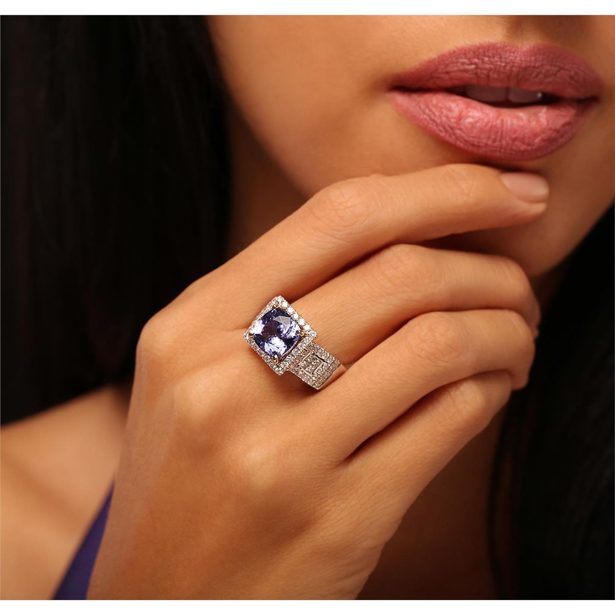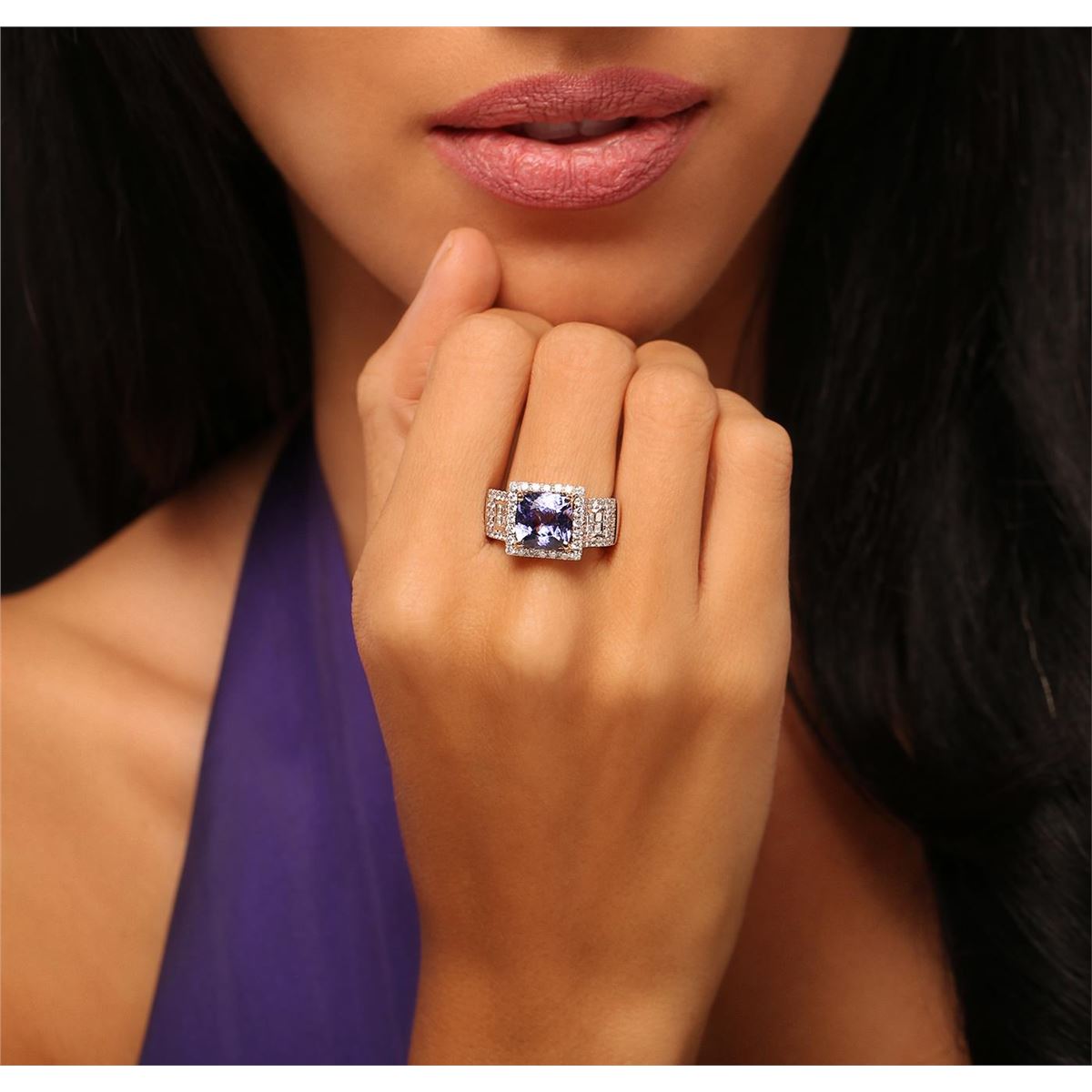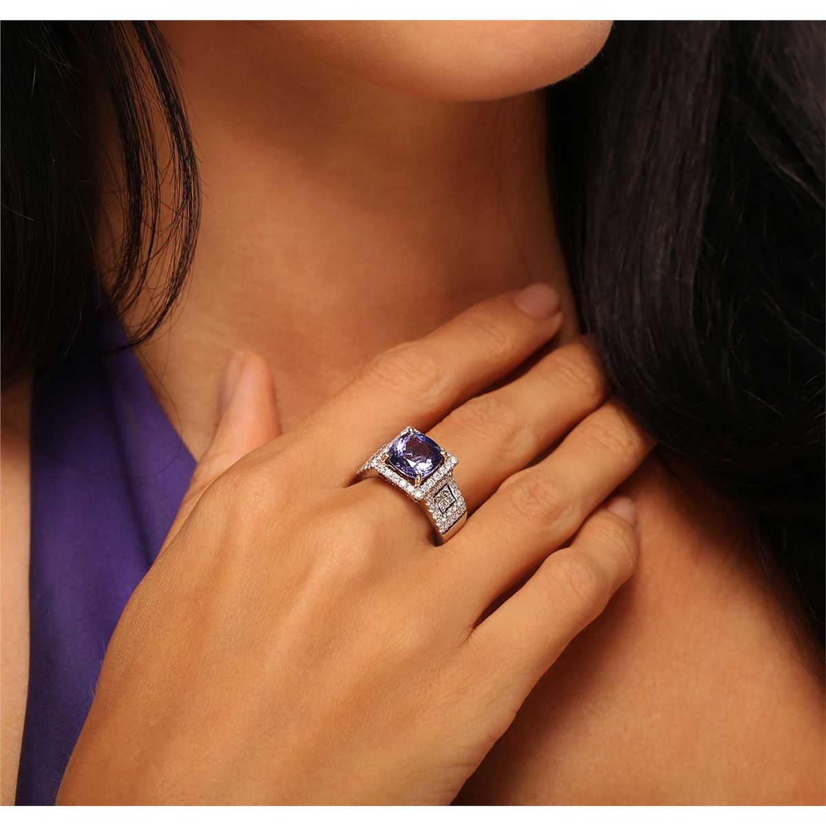 One electronically tested 14KT yellow and white gold Ladies combination cast & assembled ring with a bright polish finish. Condition is new. Identified with markings of "14K". Containing: One prong set square cushion modified mixed cut natural tanzanite, measuring 9.00 x 9.00 x 5.20mm, approximate weight of 3.56ct., clarity is eye clean, type I, medium light, very slightly grayish, violet color, (GIA V 4/3), cut is very good. Colored gemstones are presumed to have been subjected to commonly used color/clarity enhancement processes. Eight invisible set princess cut diamonds, measuring 1.90 x 1.90 x 1.43mm (depth est.) approximate. Total Weight of 8 Stones = 0.34ct. Clarity: SI-1 to SI-2. Color: J - K, Cut is Good. Sixty-Six prong set round brilliant cut diamonds, measuring 1.50 - 1.50 x 0.90mm (depth est.) approximate. Total Weight of 66 Stones = 1.09ct. Clarity: SI-1 to I-1. Color: H - I, Cut is Good. Total Weight of Colored Stones 3.56ct. Total Weight of Diamonds 1.43ct. Total Weight of Ring 8.70 grams. GGL Appraised at $9,525.00.