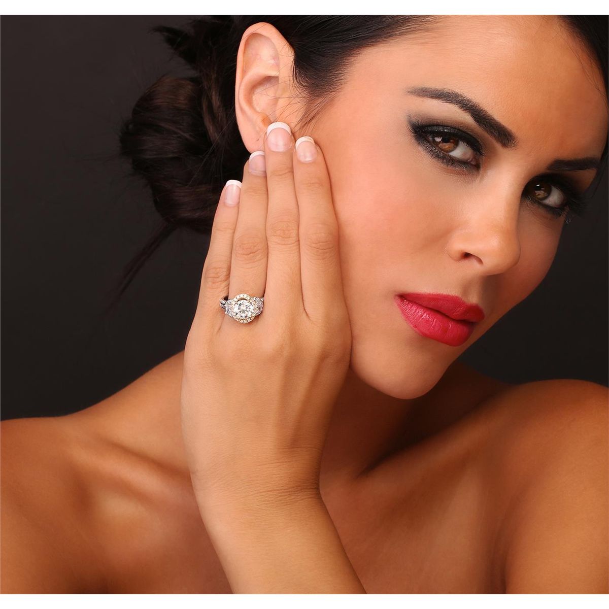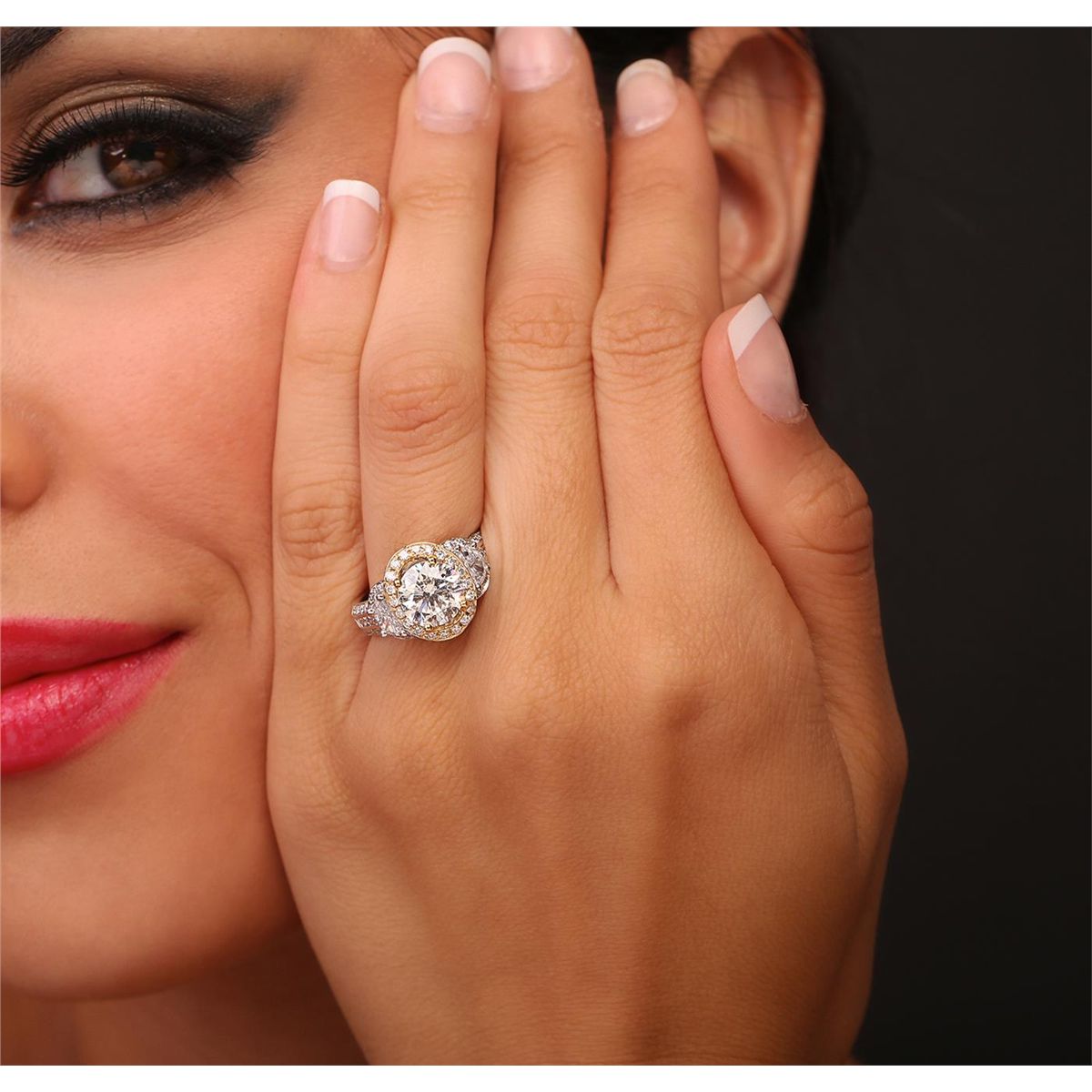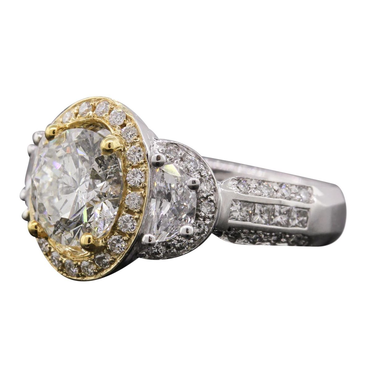 One electronically tested 14KT white and yellow gold Ladies combination cast & assembled engagement ring with a bright polish finish. Condition is new. Identified with markings of "14K". Containing: One prong set round brilliant cut diamond, measuring 8.60 - 8.50 x 5.50mm (depth est.) approximate weight of 2.45ct. Clarity: I-2. Color: K, Cut is Good. Two prong set half moon cut diamonds, measuring 5.40 x 3.00 x 2.00mm (depth est.) approximate. Total Weight of 2 Stones = 0.60ct. Clarity: SI-1 to SI-2. Color: H, Cut is Good. Eight prong set princess cut diamonds, measuring 1.50 x 1.50 x 1.13mm (depth est.) approximate. Total Weight of 8 Stones = 0.17ct. Clarity: SI-2. Color: I, Cut is Good. Fifty bead set round brilliant cut diamonds, measuring 1.30 - 1.30 x 0.78mm (depth est.) approximate. Total Weight of 50 Stones = 0.40ct. Clarity: SI-2 to I-1. Color: H - I, Cut is Good. Total Weight of Diamonds 3.62ct. Total Weight of Engagement Ring 8.40 grams. GGL Appraised at $24,105.00.