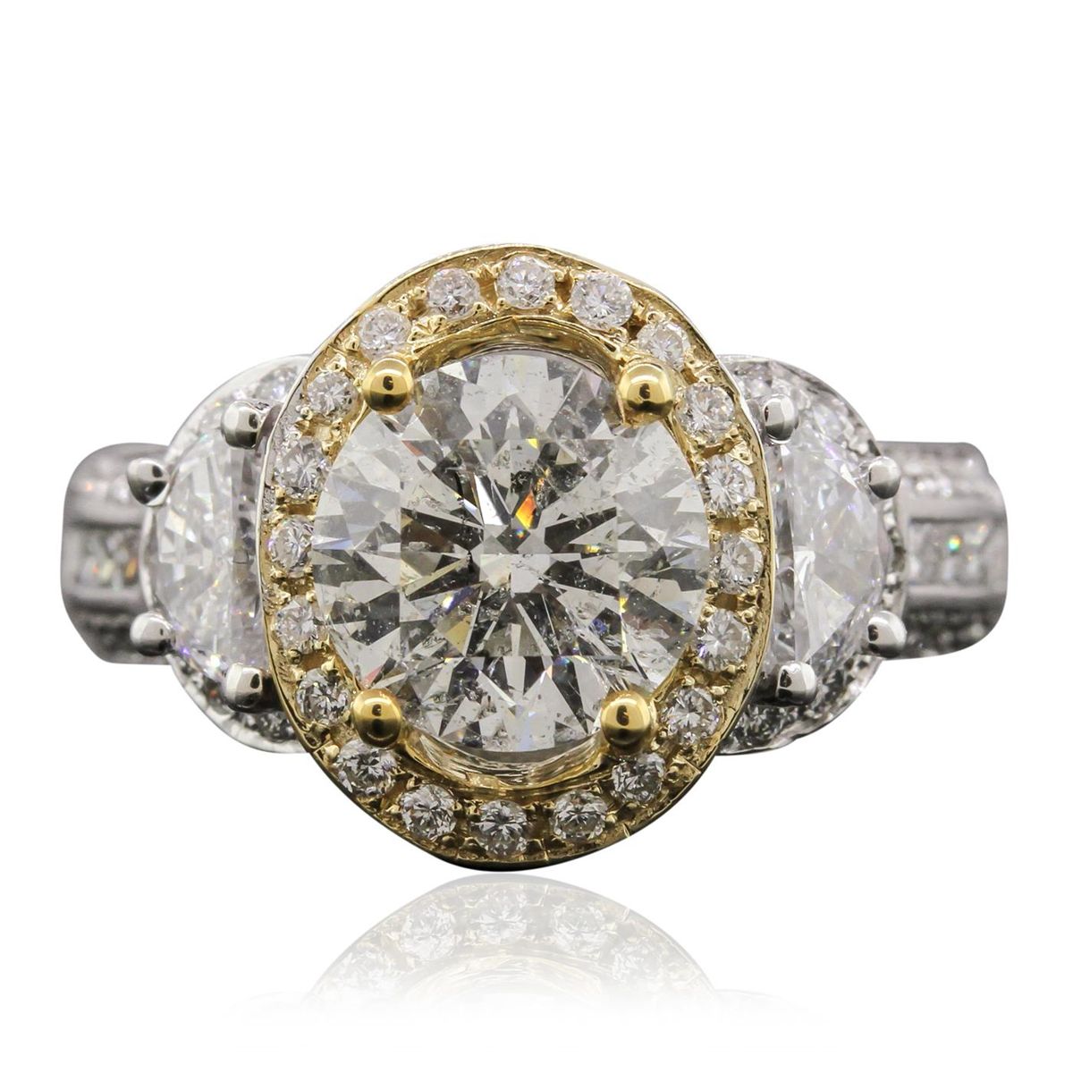 One electronically tested 14KT white and yellow gold Ladies combination cast & assembled engagement ring with a bright polish finish. Condition is new. Identified with markings of "14K". Containing: One prong set round brilliant cut diamond, measuring 8.60 - 8.50 x 5.50mm (depth est.) approximate weight of 2.45ct. Clarity: I-2. Color: K, Cut is Good. Two prong set half moon cut diamonds, measuring 5.40 x 3.00 x 2.00mm (depth est.) approximate. Total Weight of 2 Stones = 0.60ct. Clarity: SI-1 to SI-2. Color: H, Cut is Good. Eight prong set princess cut diamonds, measuring 1.50 x 1.50 x 1.13mm (depth est.) approximate. Total Weight of 8 Stones = 0.17ct. Clarity: SI-2. Color: I, Cut is Good. Fifty bead set round brilliant cut diamonds, measuring 1.30 - 1.30 x 0.78mm (depth est.) approximate. Total Weight of 50 Stones = 0.40ct. Clarity: SI-2 to I-1. Color: H - I, Cut is Good. Total Weight of Diamonds 3.62ct. Total Weight of Engagement Ring 8.40 grams. GGL Appraised at $24,105.00.