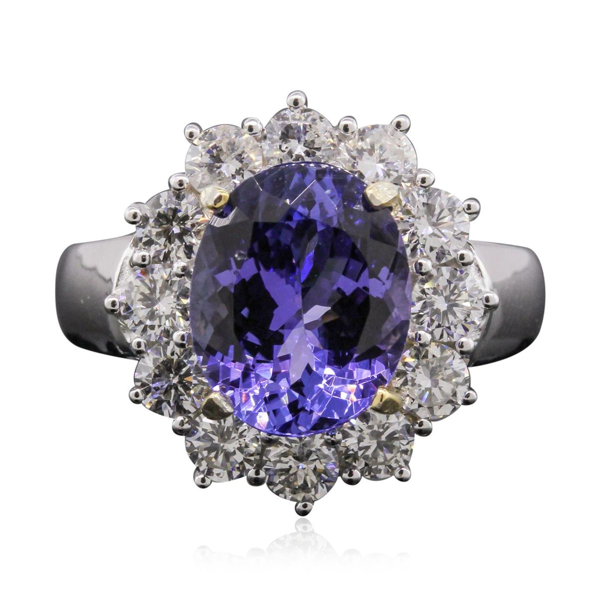 One electronically tested 14KT white and yellow gold Ladies combination cast & assembled ring with a high polish finish. Condition is new. Identified with markings of "14K". Containing: One prong set oval modified mixed cut natural tanzanite, measuring 11.00 x 9.00 x 5.50mm, approximate weight of 3.64ct., clarity is eye clean, type I, medium, moderately strong, bluish violet color, (GIA bV 5/4), cut is very good. Colored gemstones are presumed to have been subjected to commonly used color/clarity enhancement processes. Twelve bead set round brilliant cut diamonds, measuring 3.00 - 3.00 x 1.80mm (depth est.) approximate. Total Weight of 12 Stones = 1.48ct. Clarity: I-1 to I-2. Color: I - J, Cut is Good. Total Weight of Colored Stones 3.64ct. Total Weight of Diamonds 1.48ct. Total Weight of Ring 6.60 grams. GGL Appraised at $8,675.00.