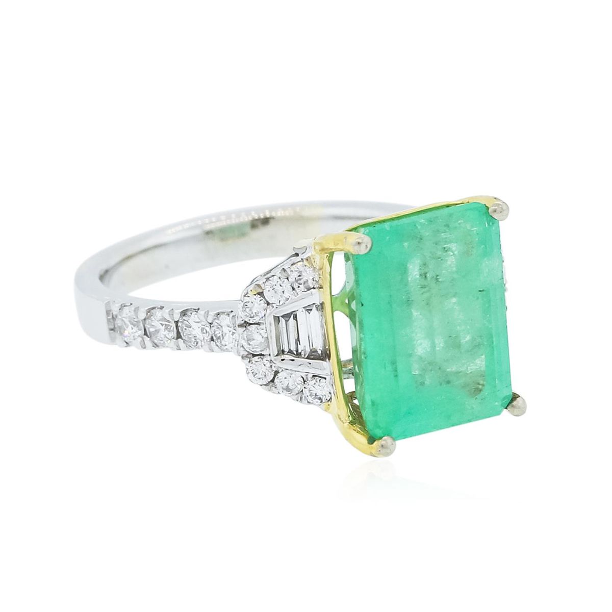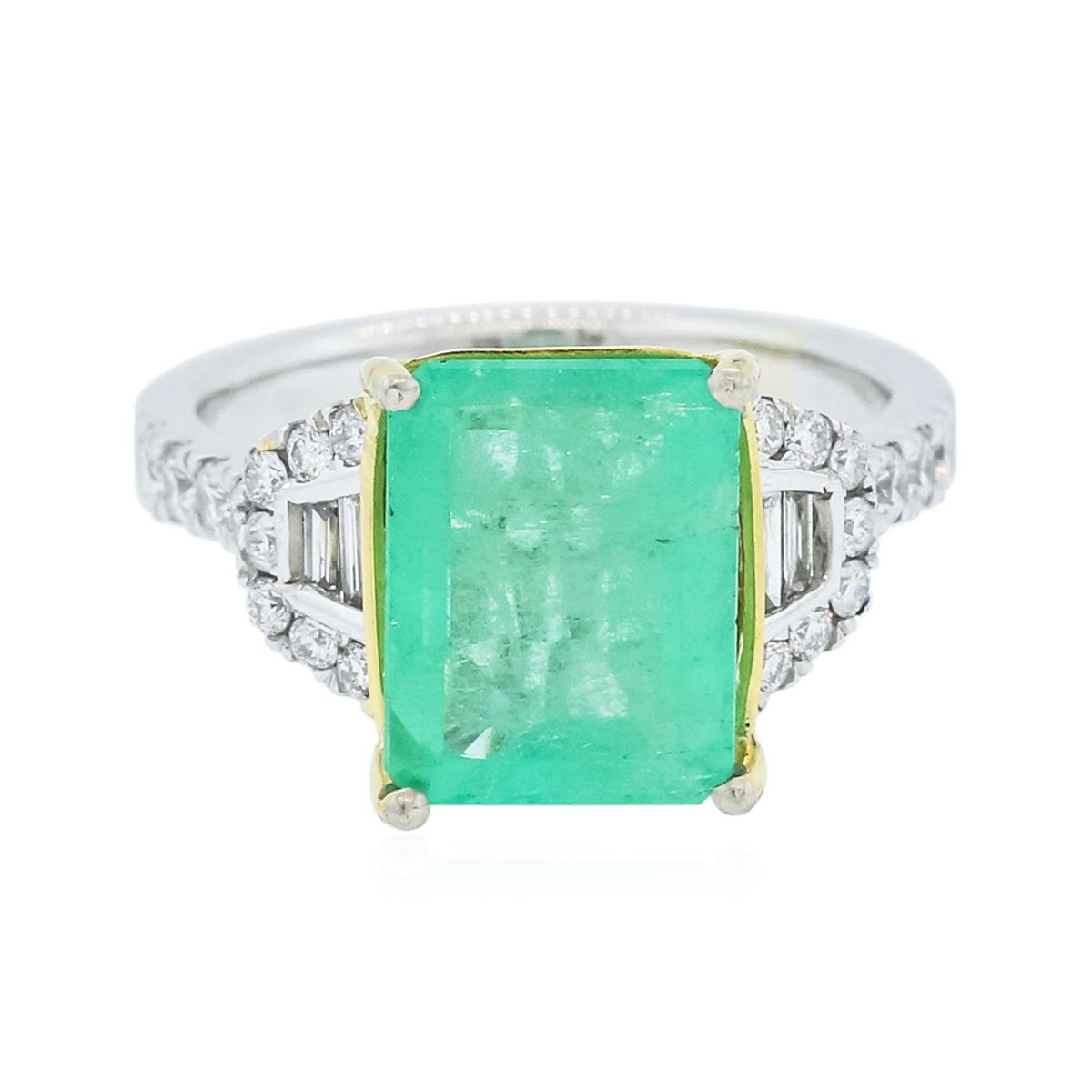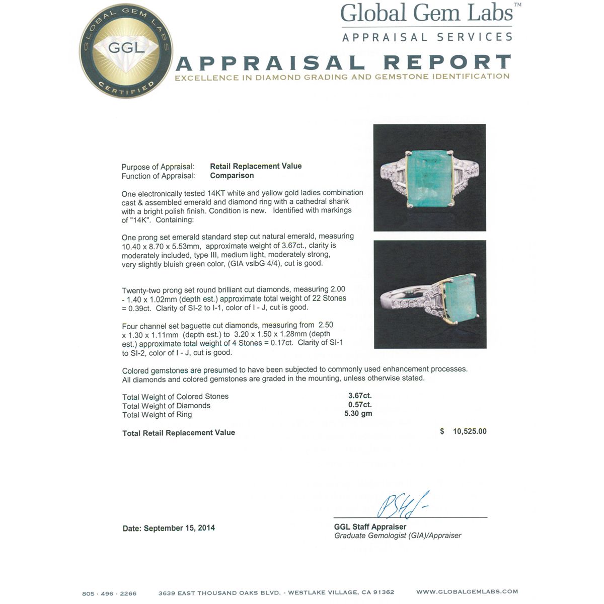 One electronically tested 14KT white and yellow gold ladies combination cast & assembled emerald and diamond ring with a cathedral shank with a bright polish finish. Identified with markings of "14K". Condition is new. Containing: One prong set emerald standard step cut natural emerald, measuring 10.40 x 8.70 x 5.53mm, approximate weight of 3.67ct., clarity is moderately included, type III, medium light, moderately strong, very slightly bluish green color, (GIA vslbG 4/4), cut is good. Twenty-Two prong set round brilliant cut diamonds, measuring 2.00 - 1.40 x 1.02mm (depth est.) approximate total weight of 22 Stones = 0.39ct. Clarity: SI-2 to I-1. Color: I - J, Cut is Good. Four channel set baguette cut diamonds, measuring from 2.50 x 1.30 x 1.11mm (depth est.) to 3.20 x 1.50 x 1.28mm (depth est.) approximate total weight of 4 Stones = 0.17ct. Clarity: SI-1 to SI-2. Color: I - J, Cut is Good. Colored gemstones are presumed to have been subjected to commonly used enhancement processes. All diamonds and colored gemstones are graded in the mounting, unless otherwise stated total weight of Colored Stones 3.67ct. Total Weight of Diamonds 0.57ct. Total Weight of Ring 5.30 grams. GGL Appraised at $10,525.00.