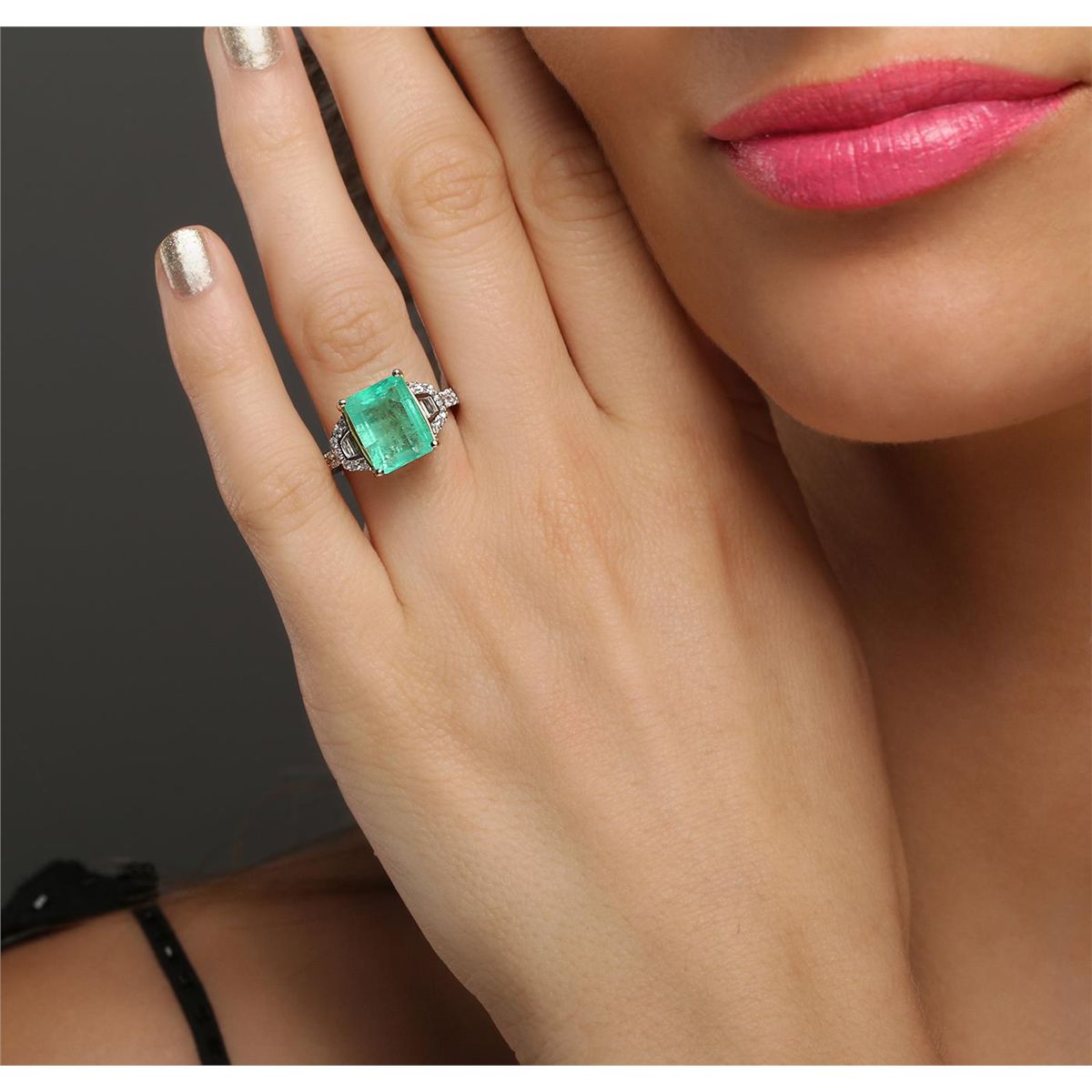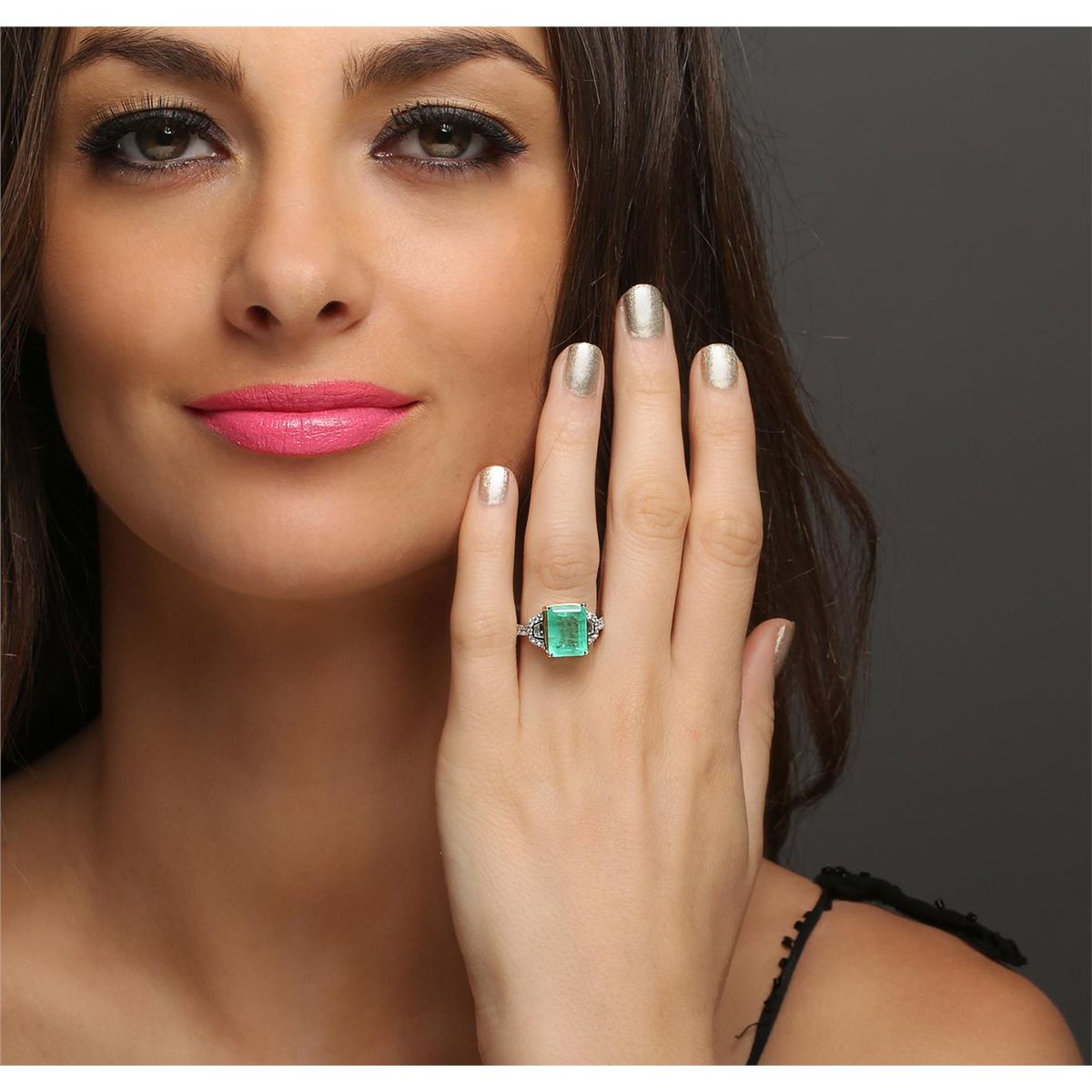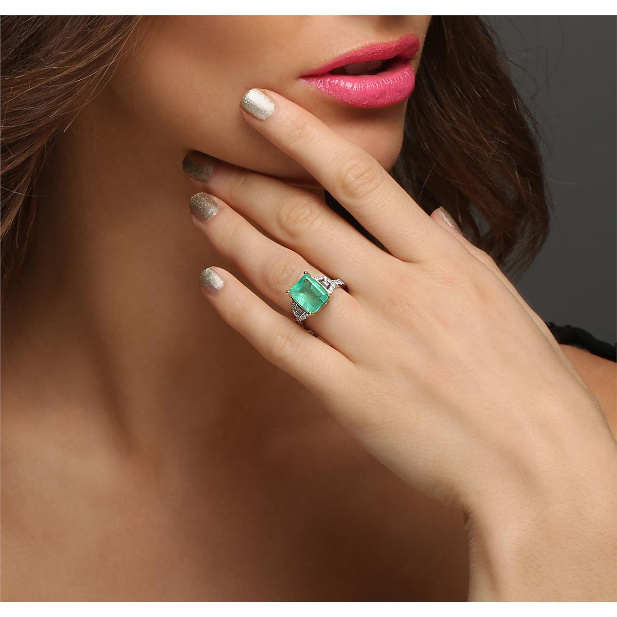 One electronically tested 14KT white and yellow gold ladies combination cast & assembled emerald and diamond ring with a cathedral shank with a bright polish finish. Identified with markings of "14K". Condition is new. Containing: One prong set emerald standard step cut natural emerald, measuring 10.40 x 8.70 x 5.53mm, approximate weight of 3.67ct., clarity is moderately included, type III, medium light, moderately strong, very slightly bluish green color, (GIA vslbG 4/4), cut is good. Twenty-Two prong set round brilliant cut diamonds, measuring 2.00 - 1.40 x 1.02mm (depth est.) approximate total weight of 22 Stones = 0.39ct. Clarity: SI-2 to I-1. Color: I - J, Cut is Good. Four channel set baguette cut diamonds, measuring from 2.50 x 1.30 x 1.11mm (depth est.) to 3.20 x 1.50 x 1.28mm (depth est.) approximate total weight of 4 Stones = 0.17ct. Clarity: SI-1 to SI-2. Color: I - J, Cut is Good. Colored gemstones are presumed to have been subjected to commonly used enhancement processes. All diamonds and colored gemstones are graded in the mounting, unless otherwise stated total weight of Colored Stones 3.67ct. Total Weight of Diamonds 0.57ct. Total Weight of Ring 5.30 grams. GGL Appraised at $10,525.00.