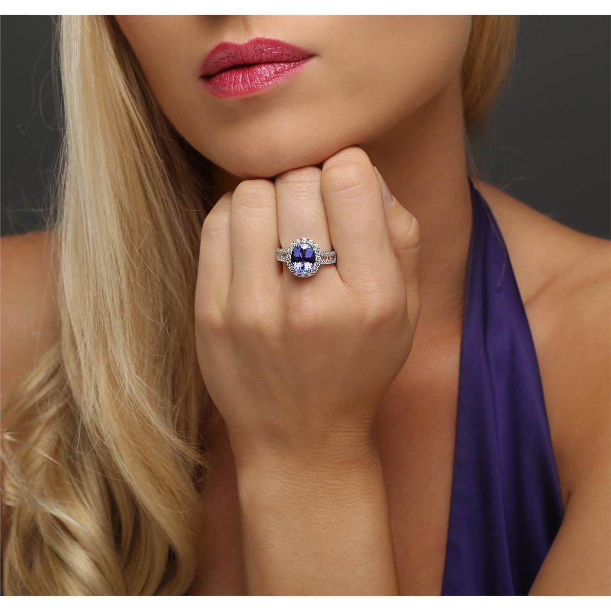 One electronically tested 14KT white and yellow gold ladies combination cast & assembled tanzanite and diamond ring with a flat shank with a bright polish finish. Identified with markings of "14K". Condition is new. Containing: One prong set oval modified brilliant cut natural tanzanite, measuring 10.68 x 8.62 x 6.00mm, approximate weight of 3.74ct., clarity is eye clean, type I, medium light, moderately strong, violet color, (GIA V 4/4), cut is good. Fifty-Six prong set round brilliant cut diamonds, measuring 1.90 - 1.00 x 0.87mm (depth est.) approximate total weight of 56 Stones = 0.62ct. Clarity: I-1 to I-2. Color: I - J, Cut is Good. Colored gemstones are presumed to have been subjected to commonly used enhancement processes. All diamonds and colored gemstones are graded in the mounting, unless otherwise stated total weight of Colored Stones 3.74ct. Total Weight of Diamonds 0.62ct. Total Weight of Ring 6.00 grams. GGL Appraised at $8,520.00.