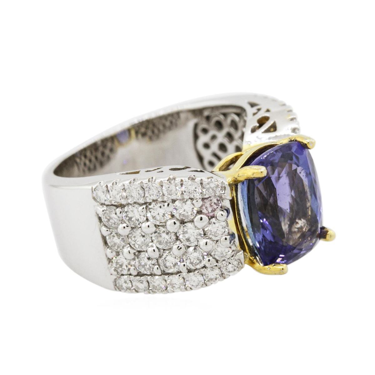 One electronically tested 14KT white and yellow gold ladies combination cast & assembled tanzanite and diamond ring with a tapered shank with a bright polish finish. Identified with markings of "14K". Condition is new. Containing: One prong set rectangular cushion modified brilliant cut natural tanzanite, measuring 10.18 x 7.96 x 5.96mm, approximate weight of 3.80ct., clarity is eye clean, type I, medium, moderately strong, bluish violet color, (GIA bV 5/4), cut is good. Thirty prong set round brilliant cut diamonds, measuring 1.90 - 1.90 x 1.14mm (depth est.) approximate total weight of 30 Stones = 0.75ct. Clarity: I-1 to I-2. Color: I - J, Cut is Good. Twenty-Eight prong set round brilliant cut diamonds, measuring 1.30 - 1.30 x 0.78mm (depth est.) approximate total weight of 28 Stones = 0.22ct. Clarity: I-1 to I-2. Color: I - J, Cut is Good. Colored gemstones are presumed to have been subjected to commonly used enhancement processes. All diamonds and colored gemstones are graded in the mounting, unless otherwise stated. Total Weight of Colored Stones 3.80ct. Total Weight of Diamonds 0.98ct. Total Weight of Ring 10.90 grams. GGL Appraised at $10,525.00.