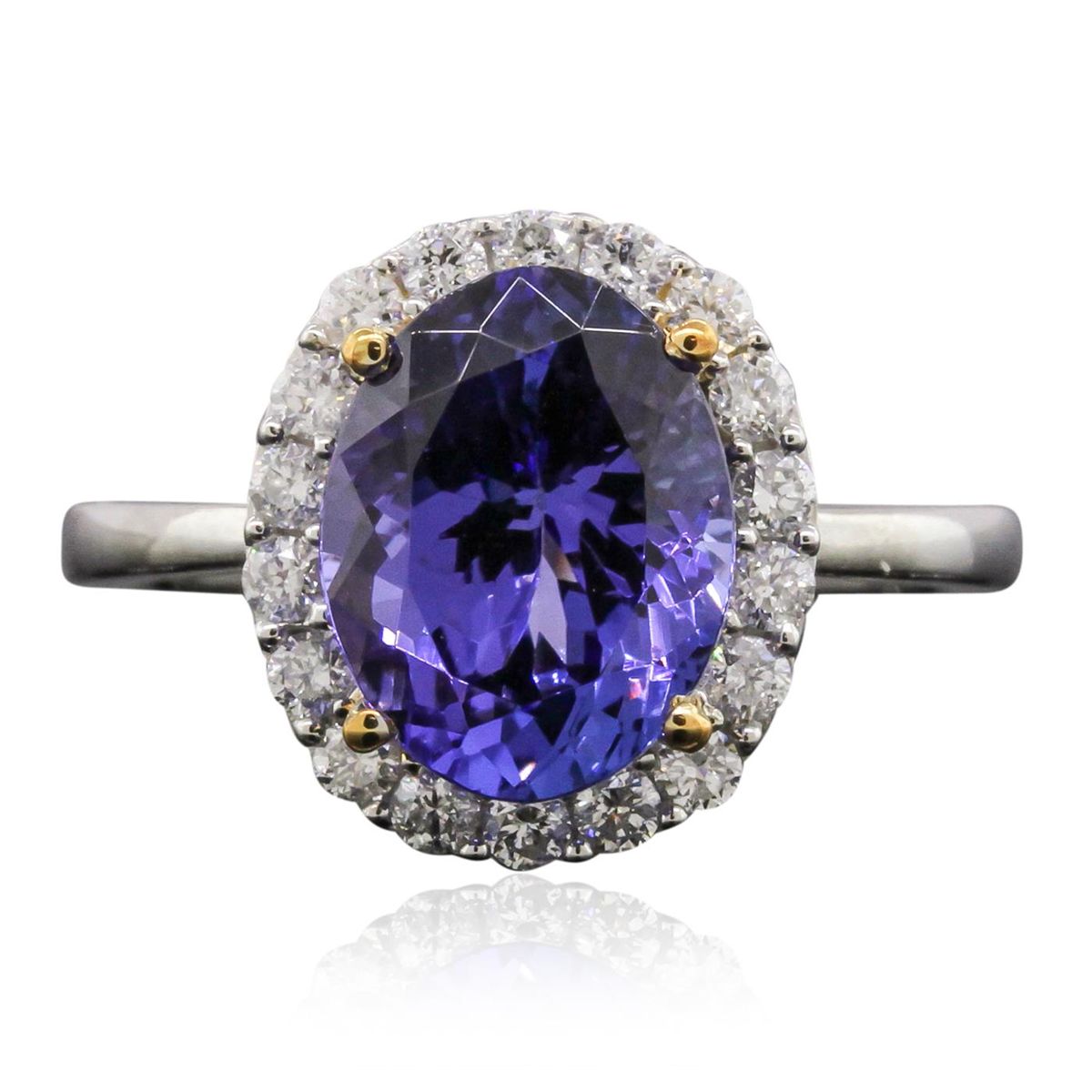 One electronically tested 14KT white and yellow gold Ladies combination cast & assembled ring with a bright polish finish. Condition is new. Identified with markings of "14K". Containing: Eighteen prong set round brilliant cut diamonds, measuring 1.70 - 1.70 x 1.02mm (depth est.) approximate. Total Weight of 18 Stones = 0.53ct. Clarity: I-1 to I-2. Color: I - J, Cut is Good. One prong set oval modified brilliant cut natural tanzanite, measuring 12.00 x 8.00 x 5.20mm, approximate weight of 3.90ct., clarity is eye clean, type I, medium dark, moderately strong, bluish violet color, (GIA bV 6/4), cut is very good. Colored gemstones are presumed to have been subjected to commonly used color/clarity enhancement processes. Total Weight of Colored Stones 3.90ct. Total Weight of Diamonds 0.53ct. Total Weight of Ring 4.30 grams. GGL Appraised at $7,815.00.
