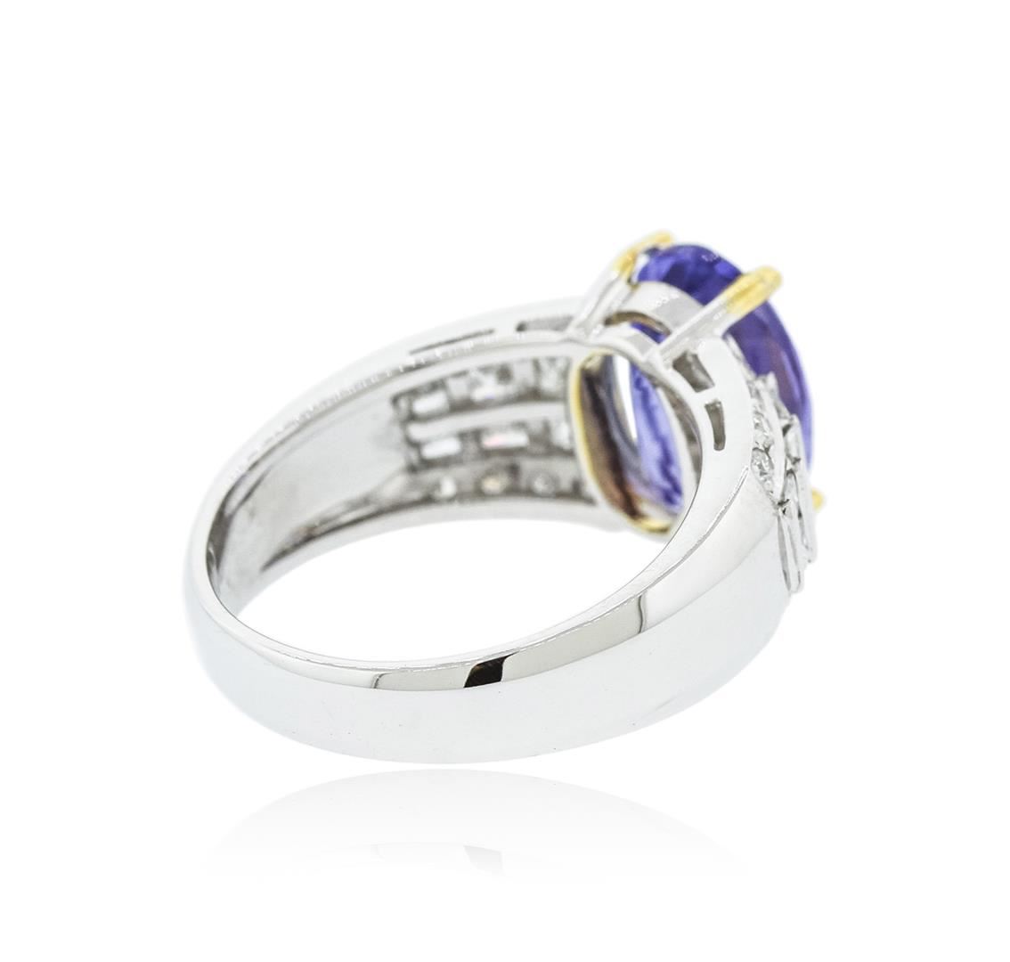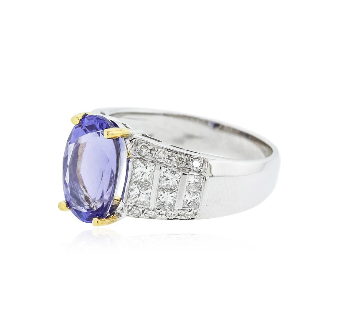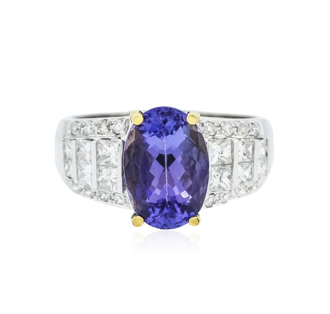 One electronically tested 14KT white and yellow gold ladies cast tanzanite and diamond ring with a bright polish finish. Identified with markings of "14K". Condition is new. Containing: One prong set oval modified brilliant cut natural tanzanite, measuring 11.50 x 7.80 x 6.20mm, approximate weight of 3.91ct., clarity is eye clean, type I, medium, moderately strong, violet color, (GIA V 5/4), cut is good. Sixteen prong set round brilliant cut diamonds, measuring 1.20 - 1.20 x 0.72mm (depth est.) approximate total weight of 16 Stones = 0.10ct. Clarity: SI-2 to I-1. Color: I - J, Cut is Good. Twelve channel set princess cut diamonds, measuring 2.50 x 2.50 x 1.88mm (depth est.) approximate total weight of 12 Stones = 1.16ct. Clarity: SI-1 to SI-2. Color: I - J, Cut is Good. Colored gemstones are presumed to have been subjected to commonly used enhancement processes. All diamonds and colored gemstones are graded in the mounting, unless otherwise stated. Total Weight of Colored Stones 3.91ct. Total Weight of Diamonds 1.26ct. Total Weight of Ring 5.80 grams. GGL Appraised at $5,325.00.