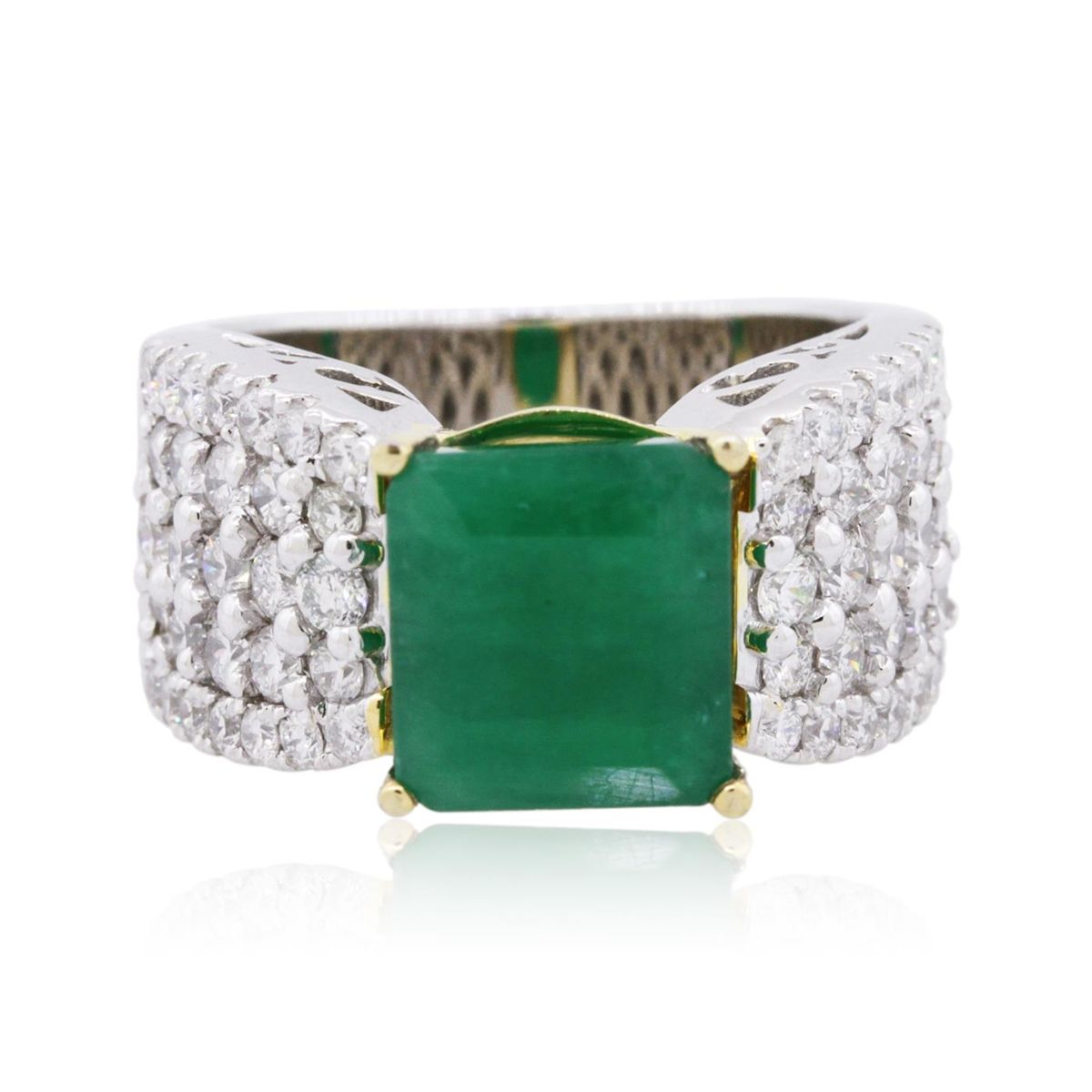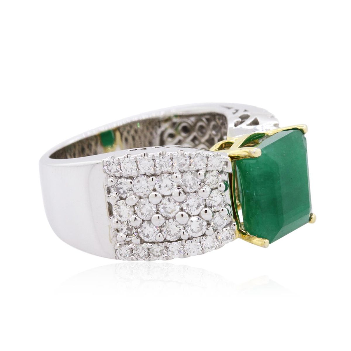 One electronically tested 14KT white and yellow gold ladies combination cast & assembled emerald and diamond ring with a flat shank with a bright polish finish. Identified with markings of "14K". Condition is new. Containing: One prong set emerald standard step cut natural emerald, measuring 9.36 x 9.63 x 5.94mm, approximate weight of 3.93ct., clarity is heavily included, type III, medium, moderately strong, green color, (GIA G 5/4), cut is good. Fifty-Six prong set round brilliant cut diamonds, measuring 1.90 - 1.50 x 1.02mm (depth est.) approximate total weight of 56 Stones = 1.00.ct. Clarity: SI-2 to I-1. Color: H - I, Cut is Good. Colored gemstones are presumed to have been subjected to commonly used enhancement processes. All diamonds and colored gemstones are graded in the mounting, unless otherwise stated. Total Weight of Colored Stones 3.93ct. Total Weight of Diamonds 1.00.ct. Total Weight of Ring 11.00. grams. GGL Appraised at $11,100.00.