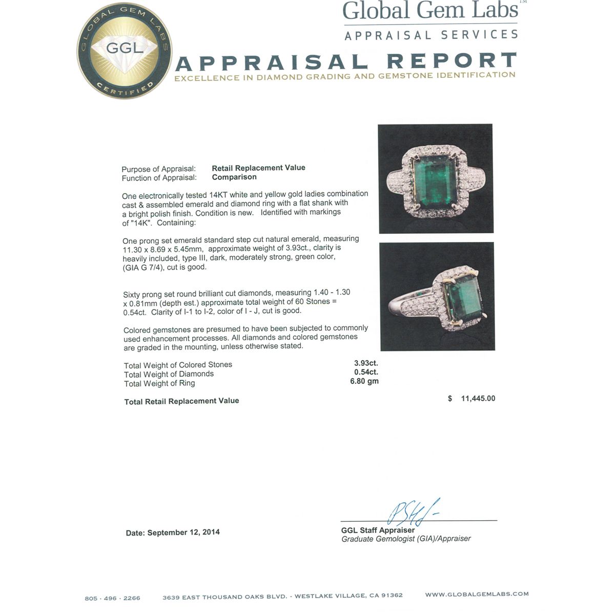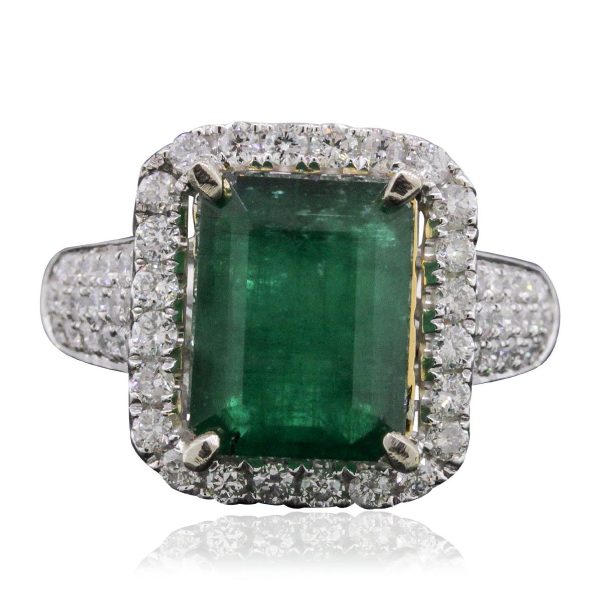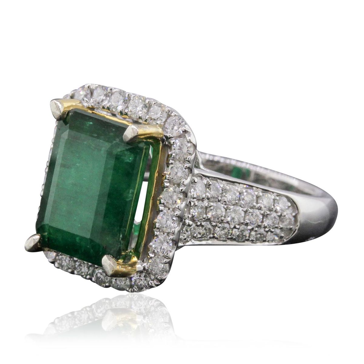 One electronically tested 14KT white and yellow gold ladies combination cast & assembled emerald and diamond ring with a flat shank with a bright polish finish. Identified with markings of "14K". Condition is new. Containing: One prong set emerald standard step cut natural emerald, measuring 11.30 x 8.69 x 5.45mm, approximate weight of 3.93ct., clarity is heavily included, type III, dark, moderately strong, green color, (GIA G 7/4), cut is good. Sixty prong set round brilliant cut diamonds, measuring 1.40 - 1.30 x 0.81mm (depth est.) approximate total weight of 60 Stones = 0.54ct. Clarity: I-1 to I-2. Color: I - J, Cut is Good. Colored gemstones are presumed to have been subjected to commonly used enhancement processes. All diamonds and colored gemstones are graded in the mounting, unless otherwise stated total weight of Colored Stones 3.93ct. Total Weight of Diamonds 0.54ct. Total Weight of Ring 6.80 grams. GGL Appraised at $11,445.00.