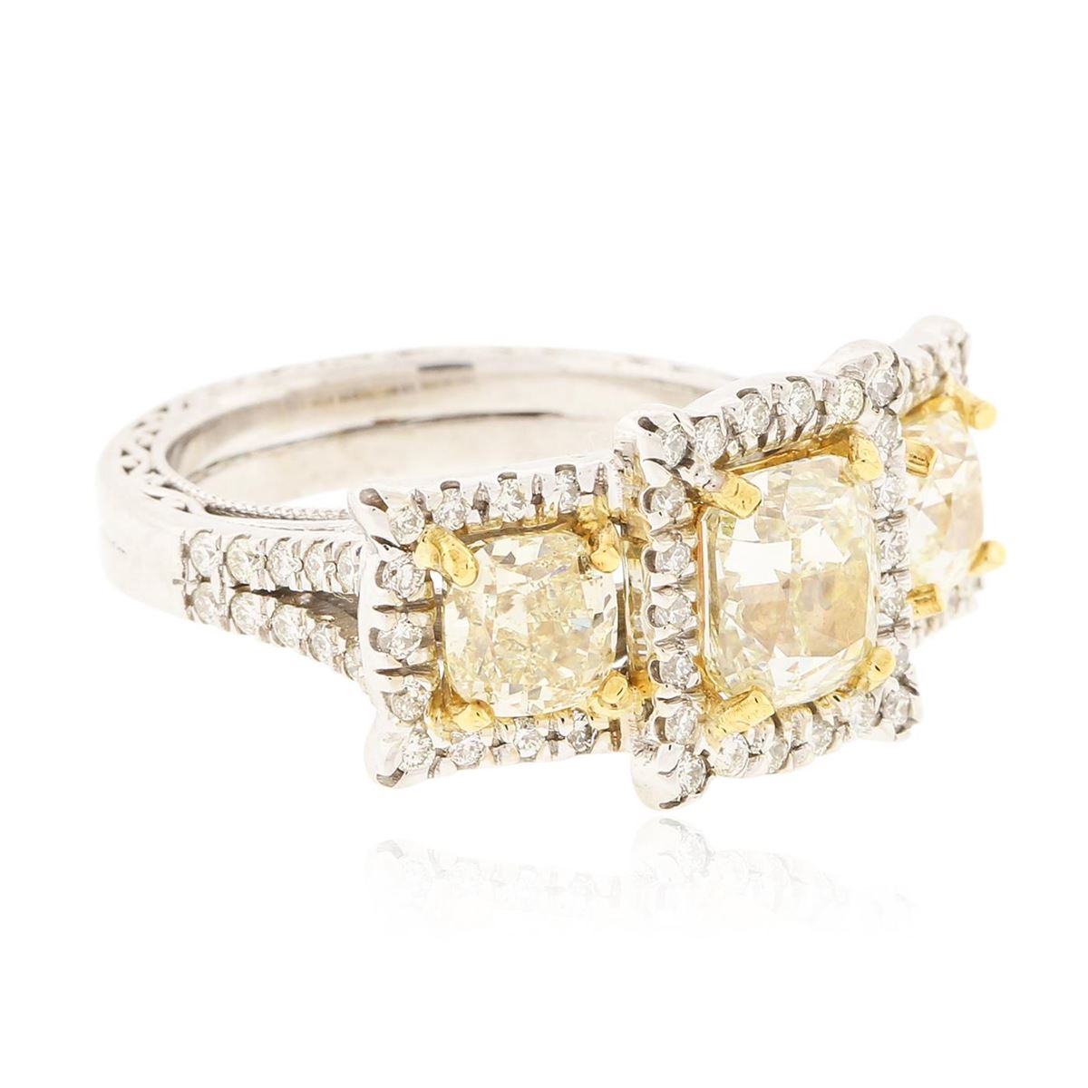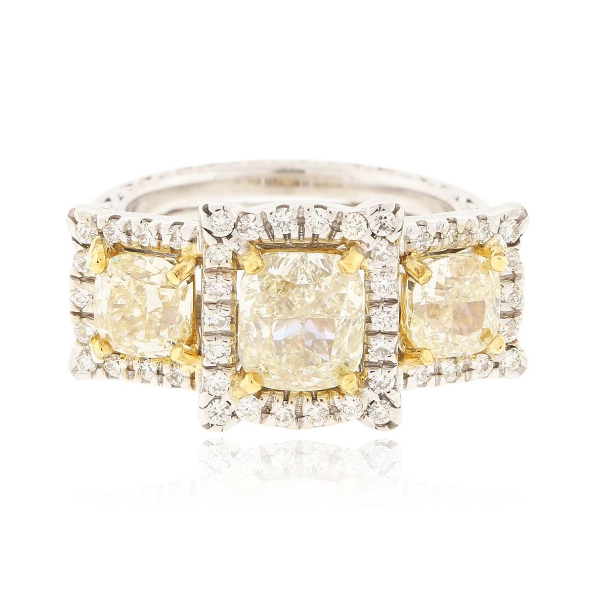 One electronically tested 14KT two-tone, yellow & white gold ladies cast & assembled diamond ring. Condition is good. The ring features three diamonds, each mounted in 14K yellow gold baskets, set within 14KT white gold diamond bezels, supported by diamond set shoulders and completed by a split one and one-half millimeter wide dual band. Bright and patterned finish with milgrain detailing throughout. Containing: One prong set cushion cut diamond, measuring 7.25 x 6.35 x 3.94mm (depth est.) approximate weight of 1.71ct. Graded in the setting. Clarity: SI-1. Depth: 62.1%. Table 52.0%. Two prong set cushion cut diamonds, measuring 5.40 x 5.20 x 3.22mm (depth est.), 10.00.%. GTCF approximate. Total Weight of 2 Stones = 1.89ct. Measurements & the color grade are an average for the pair. Graded in the setting. Clarity: SI-1 to SI-2 Sixty-Four prong set round brilliant cut diamonds, measuring 1.40 - 1.20 x 0.78mm (depth est.) approximate. Total Weight of 64 Stones = 0.61ct. Faint secondary color throughout. Graded in the setting. Clarity: SI-1 to I-1. Color: I - K. Total Weight of Diamonds 4.21ct. Total Weight of Ring 8.30 grams. AIG Appraised at $31,685.00.