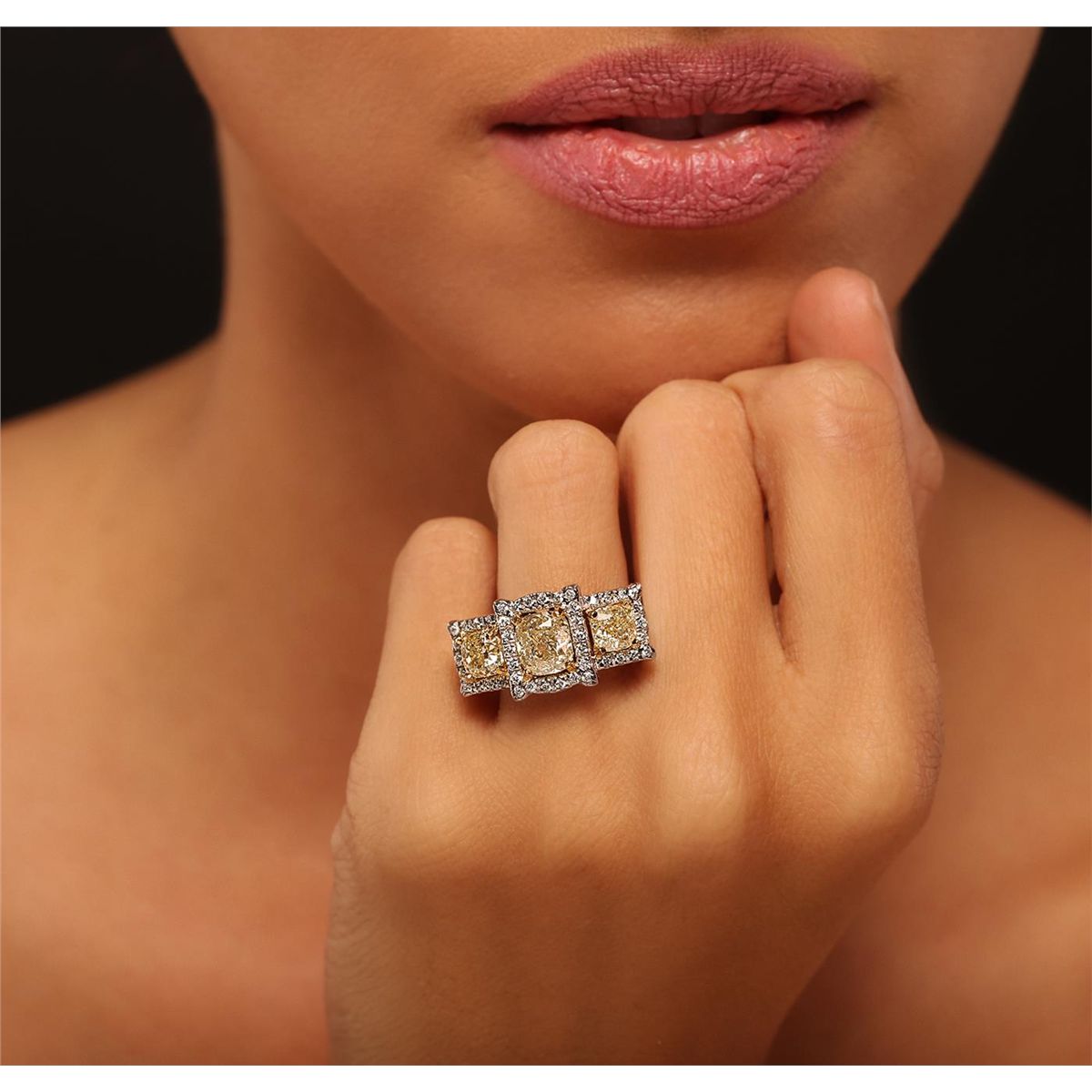 One electronically tested 14KT two-tone, yellow & white gold ladies cast & assembled diamond ring. Condition is good. The ring features three diamonds, each mounted in 14K yellow gold baskets, set within 14KT white gold diamond bezels, supported by diamond set shoulders and completed by a split one and one-half millimeter wide dual band. Bright and patterned finish with milgrain detailing throughout. Containing: One prong set cushion cut diamond, measuring 7.25 x 6.35 x 3.94mm (depth est.) approximate weight of 1.71ct. Graded in the setting. Clarity: SI-1. Depth: 62.1%. Table 52.0%. Two prong set cushion cut diamonds, measuring 5.40 x 5.20 x 3.22mm (depth est.), 10.00.%. GTCF approximate. Total Weight of 2 Stones = 1.89ct. Measurements & the color grade are an average for the pair. Graded in the setting. Clarity: SI-1 to SI-2 Sixty-Four prong set round brilliant cut diamonds, measuring 1.40 - 1.20 x 0.78mm (depth est.) approximate. Total Weight of 64 Stones = 0.61ct. Faint secondary color throughout. Graded in the setting. Clarity: SI-1 to I-1. Color: I - K. Total Weight of Diamonds 4.21ct. Total Weight of Ring 8.30 grams. AIG Appraised at $31,685.00.