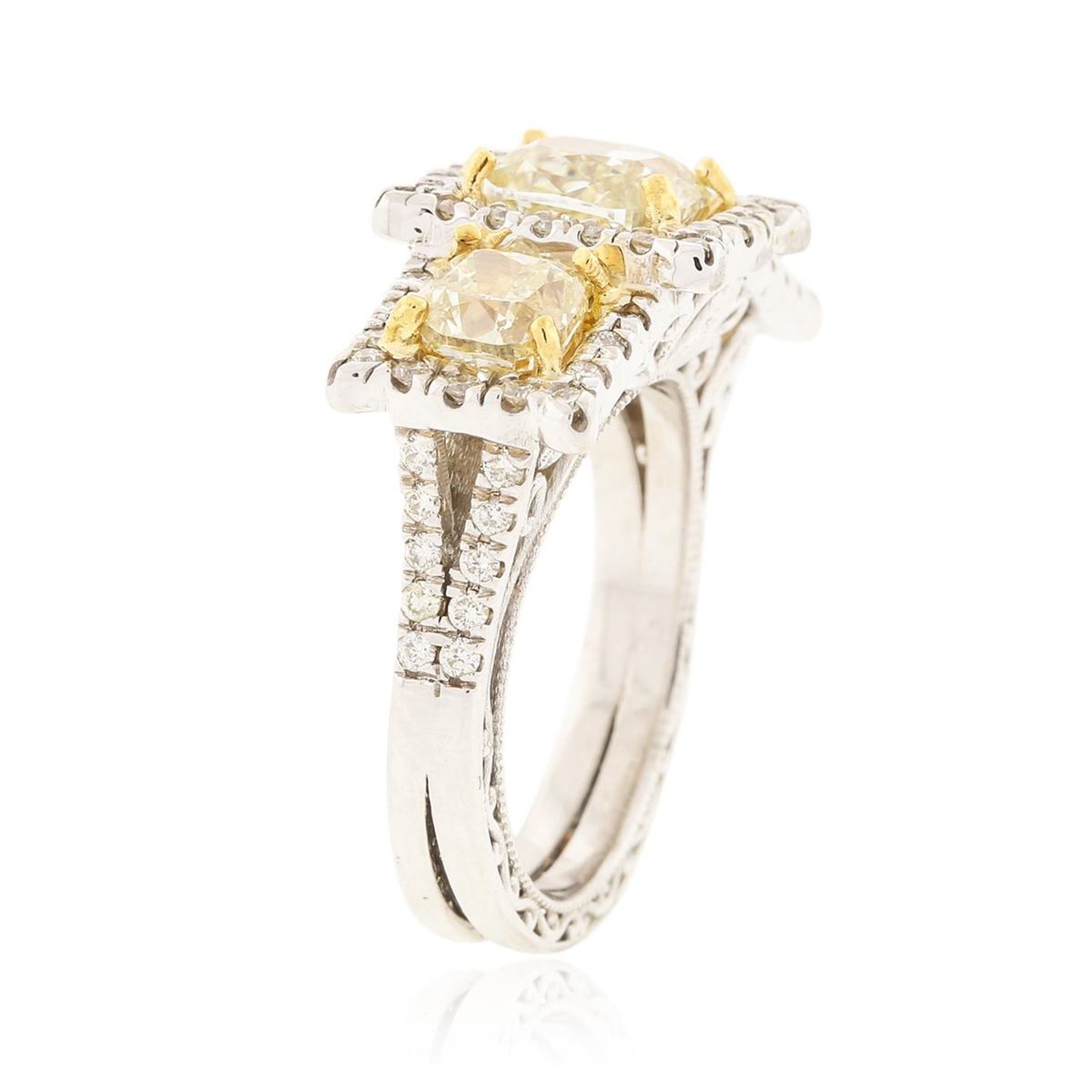 One electronically tested 14KT two-tone, yellow & white gold ladies cast & assembled diamond ring. Condition is good. The ring features three diamonds, each mounted in 14K yellow gold baskets, set within 14KT white gold diamond bezels, supported by diamond set shoulders and completed by a split one and one-half millimeter wide dual band. Bright and patterned finish with milgrain detailing throughout. Containing: One prong set cushion cut diamond, measuring 7.25 x 6.35 x 3.94mm (depth est.) approximate weight of 1.71ct. Graded in the setting. Clarity: SI-1. Depth: 62.1%. Table 52.0%. Two prong set cushion cut diamonds, measuring 5.40 x 5.20 x 3.22mm (depth est.), 10.00.%. GTCF approximate. Total Weight of 2 Stones = 1.89ct. Measurements & the color grade are an average for the pair. Graded in the setting. Clarity: SI-1 to SI-2 Sixty-Four prong set round brilliant cut diamonds, measuring 1.40 - 1.20 x 0.78mm (depth est.) approximate. Total Weight of 64 Stones = 0.61ct. Faint secondary color throughout. Graded in the setting. Clarity: SI-1 to I-1. Color: I - K. Total Weight of Diamonds 4.21ct. Total Weight of Ring 8.30 grams. AIG Appraised at $31,685.00.