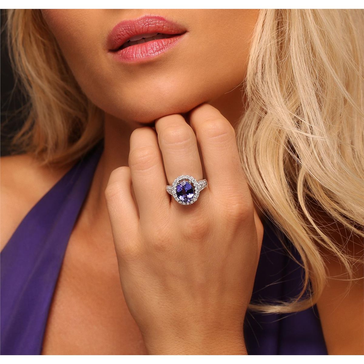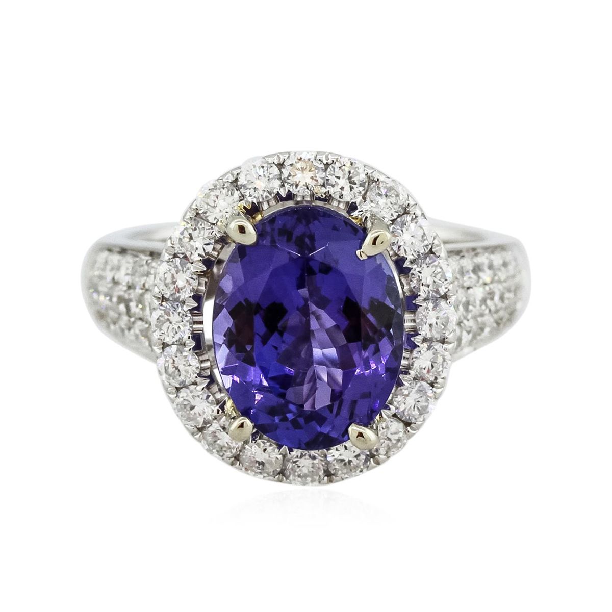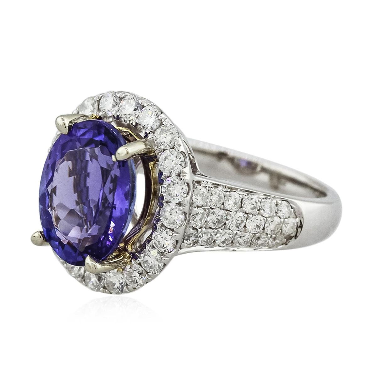 One electronically tested 14KT white and yellow gold Ladies combination cast & assembled ring with a high polish finish. Condition is new. Identified with markings of "14K". Containing: One prong set oval modified mixed cut natural tanzanite, measuring 12.00 x 8.00 x 5.70mm, approximate weight of 4.22ct., clarity is eye clean, type I, medium, moderately strong, bluish violet color, (GIA bV 5/4), cut is good. Colored gemstones are presumed to have been subjected to commonly used color/clarity enhancement processes. Fifty-Six bead set round brilliant cut diamonds, measuring 2.00 - 1.50 x 1.05mm (depth est.) approximate. Total Weight of 56 Stones = 1.38ct. Clarity: SI-1 to I-1. Color: F - G, Cut is Good. Total Weight of Colored Stones 4.22ct. Total Weight of Diamonds 1.38ct. Total Weight of Ring 7.10 grams. GGL Appraised at $10,285.00.