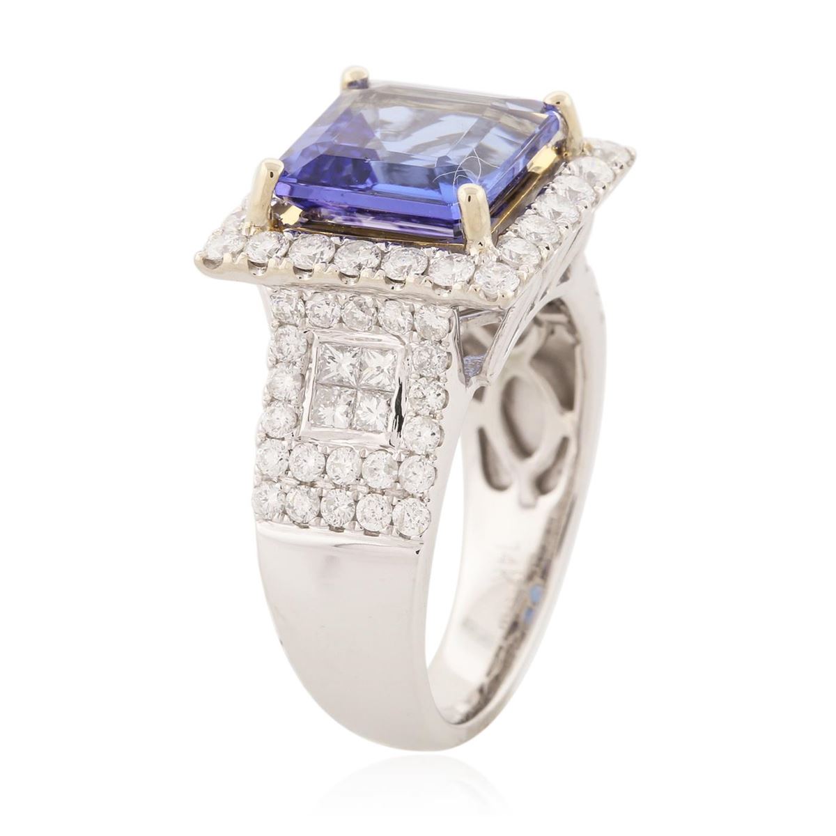 One electronically tested 14KT white and yellow gold Ladies combination cast & assembled fancy ring with a bright polish finish. Condition is new. Identified with markings of "14K". Containing: One prong set emerald standard step cut natural tanzanite, measuring 10.00 x 10.00 x 5.10mm, approximate weight of 4.23ct., clarity is eye clean, type I, medium light, moderately strong, bluish violet color, (GIA bV 4/4), cut is very good. Colored gemstones are presumed to have been subjected to commonly used color/clarity enhancement processes. Sixty-Six prong set round brilliant cut diamonds, measuring 1.60 - 1.50 x 0.93mm (depth est.) approximate. Total Weight of 66 Stones = 0.90ct. Clarity: I-1 to I-2. Color: H - I, Cut is Good. Eight invisible set princess cut diamonds, measuring 1.80 x 1.80 x 1.36mm (depth est.) approximate. Total Weight of 8 Stones = 0.29ct. Clarity: VS-2 to SI-1. Color: H - I, Cut is Good. Total Weight of Colored Stones 4.23ct. Total Weight of Diamonds 1.19ct. Total Weight of Ring 8.80 grams. GGL Appraised at $11,250.00.