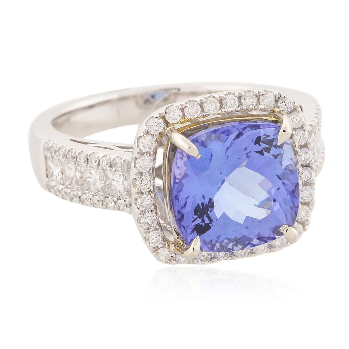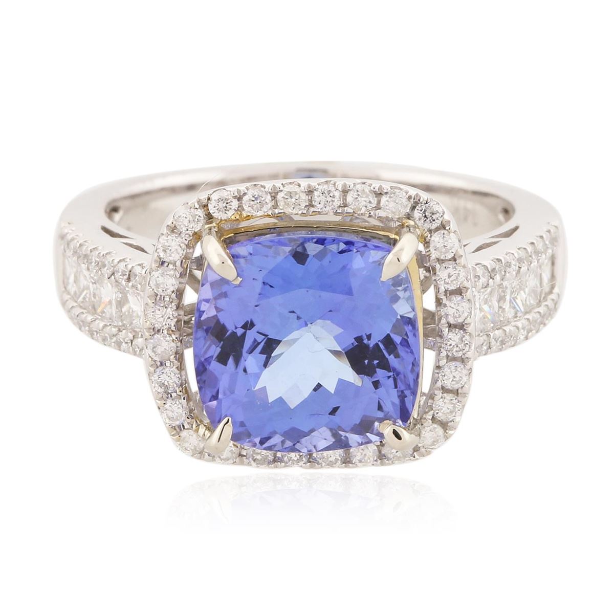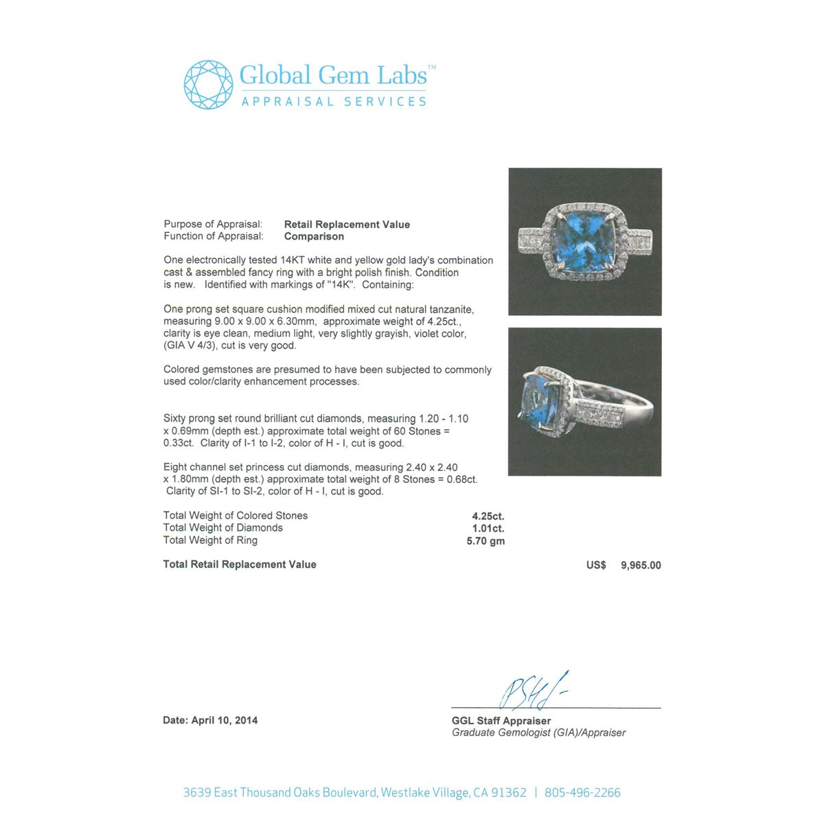 One electronically tested 14KT white and yellow gold Ladies combination cast & assembled fancy ring with a bright polish finish. Condition is new. Identified with markings of "14K". Containing: One prong set square cushion modified mixed cut natural tanzanite, measuring 9.00 x 9.00 x 6.30mm, approximate weight of 4.25ct., clarity is eye clean, medium light, very slightly grayish, violet color, (GIA V 4/3), cut is very good. Colored gemstones are presumed to have been subjected to commonly used color/clarity enhancement processes. Sixty prong set round brilliant cut diamonds, measuring 1.20 - 1.10 x 0.69mm (depth est.) approximate. Total Weight of 60 Stones = 0.33ct. Clarity: I-1 to I-2. Color: H - I, Cut is Good. Eight channel set princess cut diamonds, measuring 2.40 x 2.40 x 1.80mm (depth est.) approximate. Total Weight of 8 Stones = 0.68ct. Clarity: SI-1 to SI-2. Color: H - I, Cut is Good. Total Weight of Colored Stones 4.25ct. Total Weight of Diamonds 1.01ct. Total Weight of Ring 5.70 grams. GGL Appraised at $9,965.00.