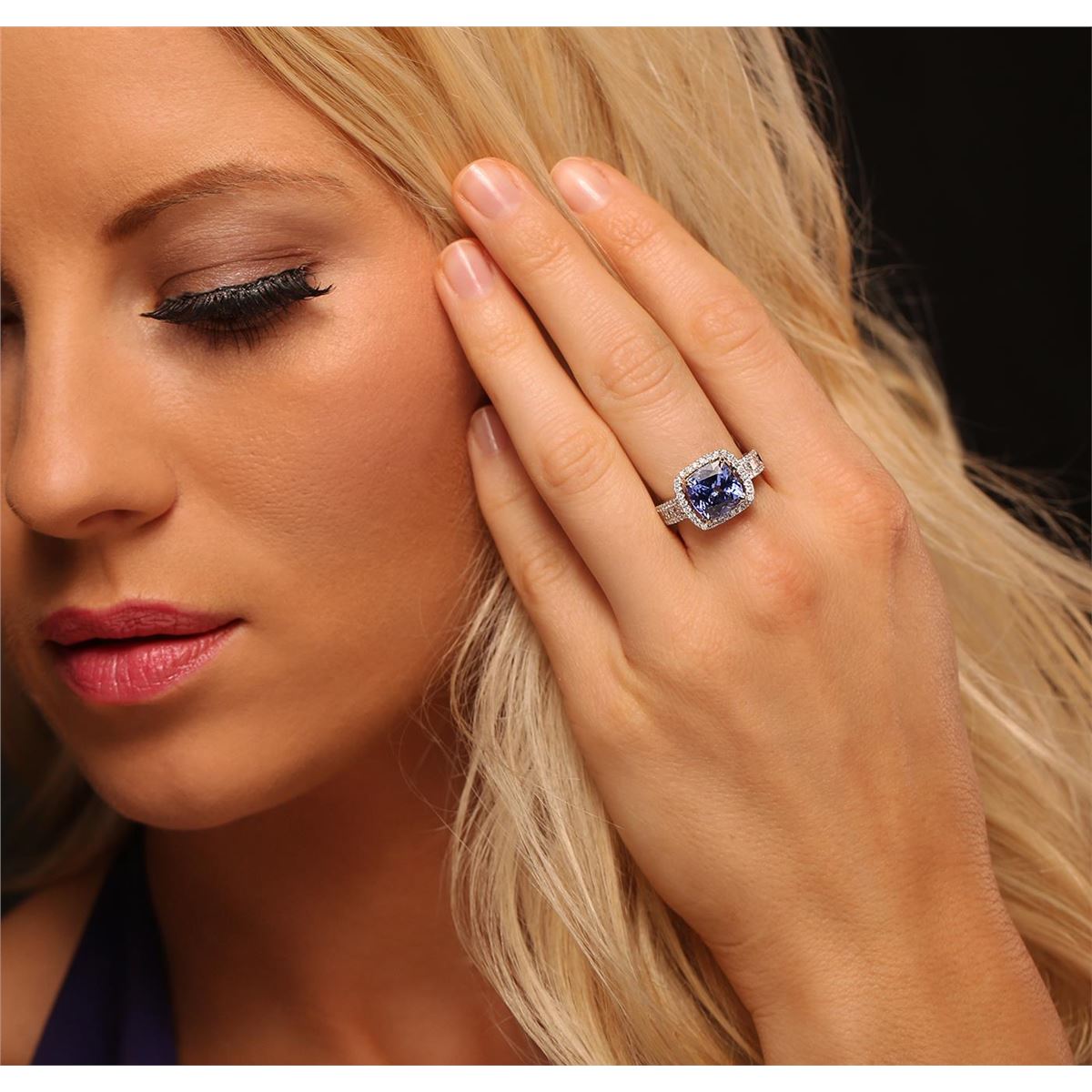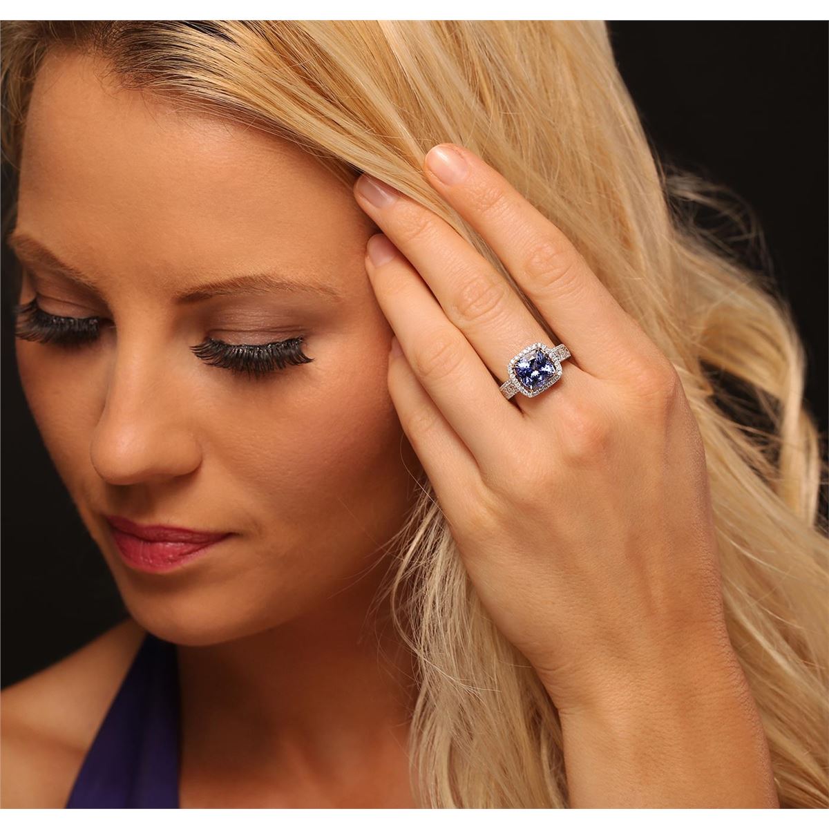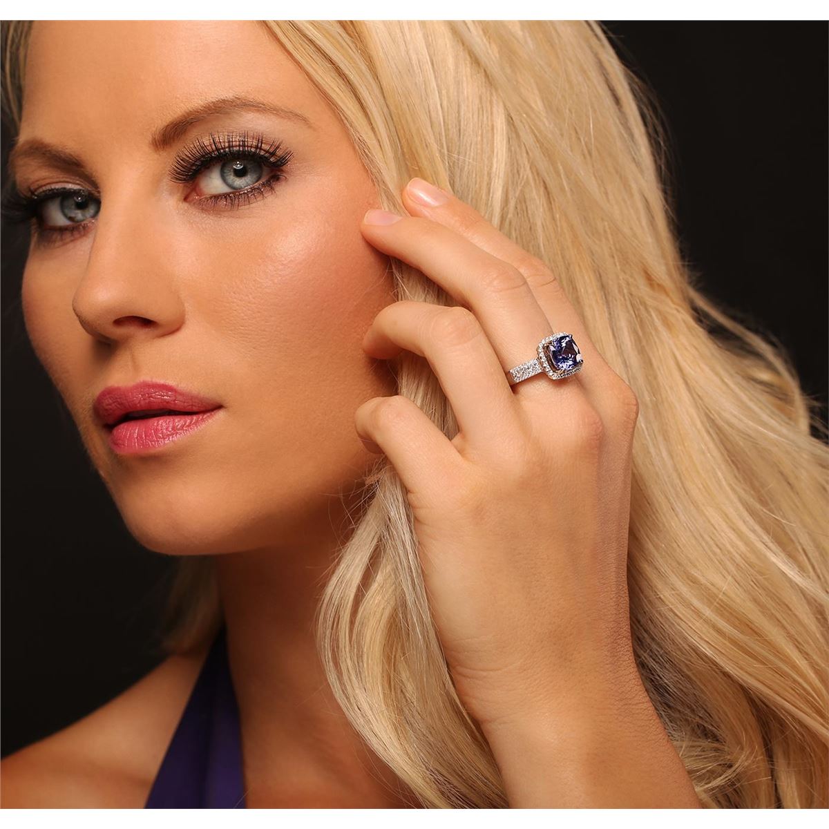 One electronically tested 14KT white and yellow gold Ladies combination cast & assembled fancy ring with a bright polish finish. Condition is new. Identified with markings of "14K". Containing: One prong set square cushion modified mixed cut natural tanzanite, measuring 9.00 x 9.00 x 6.30mm, approximate weight of 4.25ct., clarity is eye clean, medium light, very slightly grayish, violet color, (GIA V 4/3), cut is very good. Colored gemstones are presumed to have been subjected to commonly used color/clarity enhancement processes. Sixty prong set round brilliant cut diamonds, measuring 1.20 - 1.10 x 0.69mm (depth est.) approximate. Total Weight of 60 Stones = 0.33ct. Clarity: I-1 to I-2. Color: H - I, Cut is Good. Eight channel set princess cut diamonds, measuring 2.40 x 2.40 x 1.80mm (depth est.) approximate. Total Weight of 8 Stones = 0.68ct. Clarity: SI-1 to SI-2. Color: H - I, Cut is Good. Total Weight of Colored Stones 4.25ct. Total Weight of Diamonds 1.01ct. Total Weight of Ring 5.70 grams. GGL Appraised at $9,965.00.