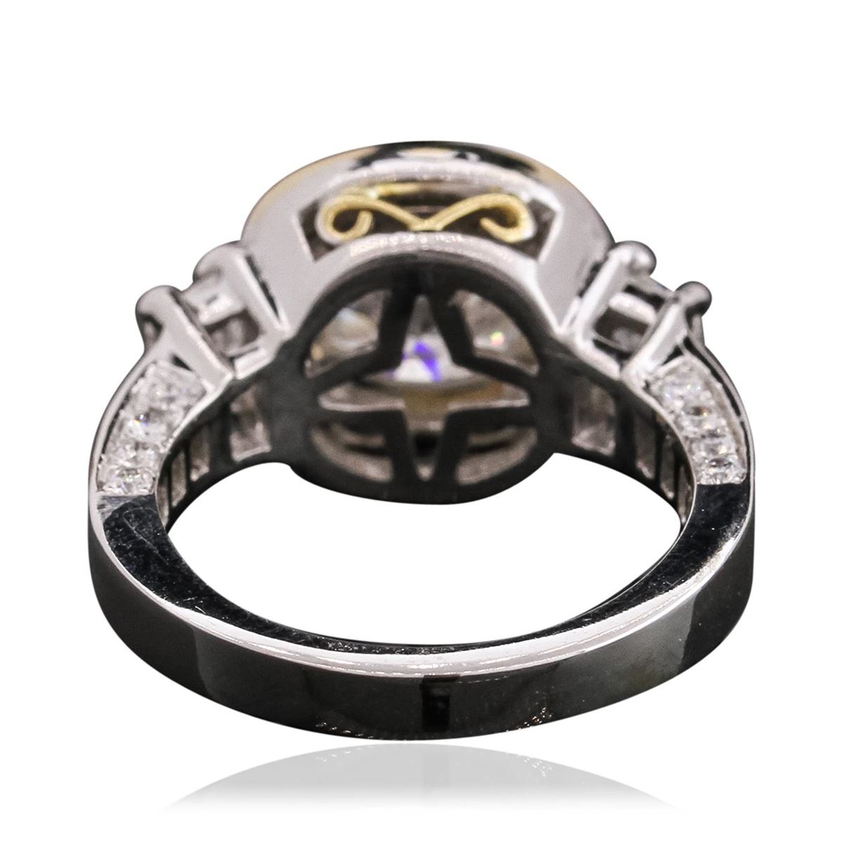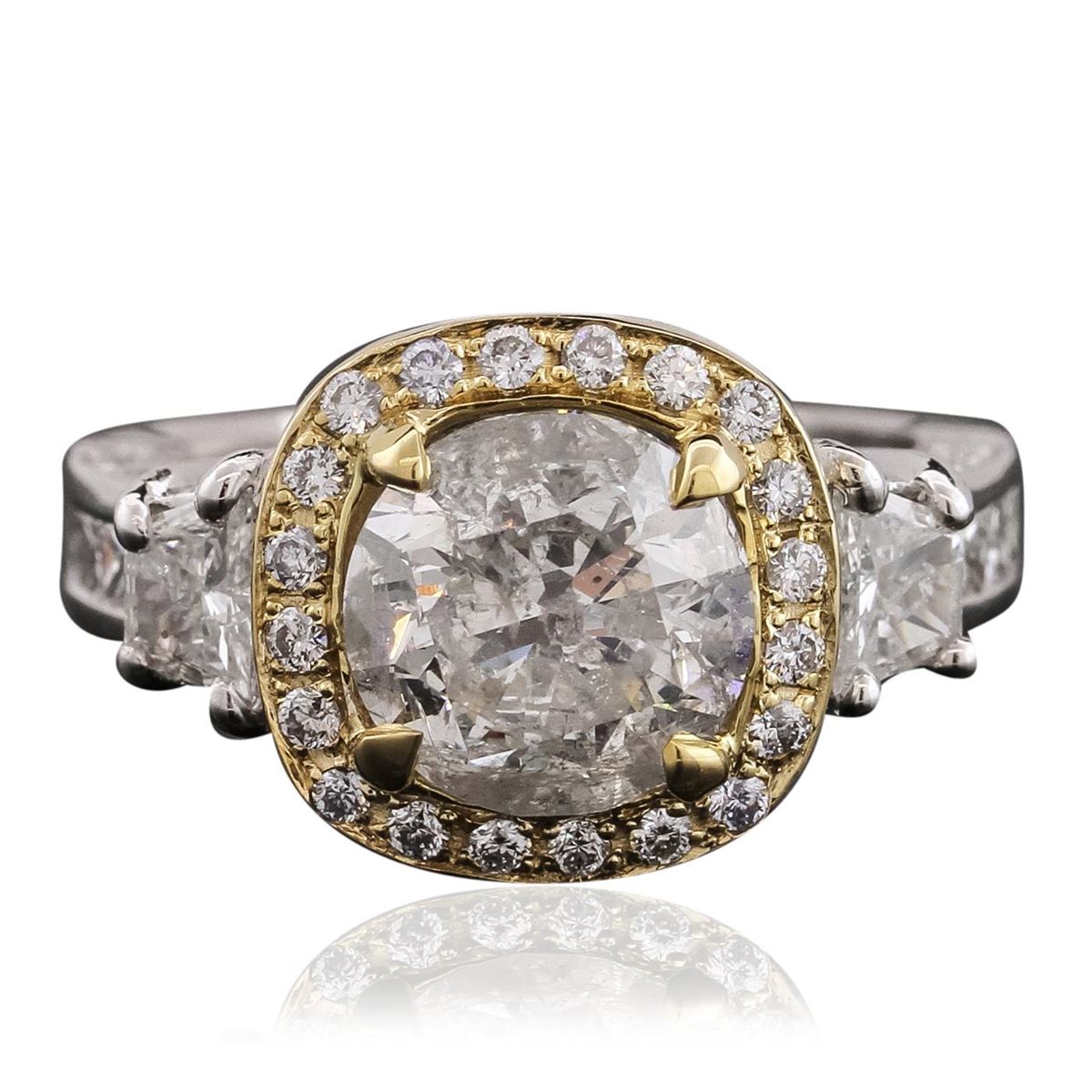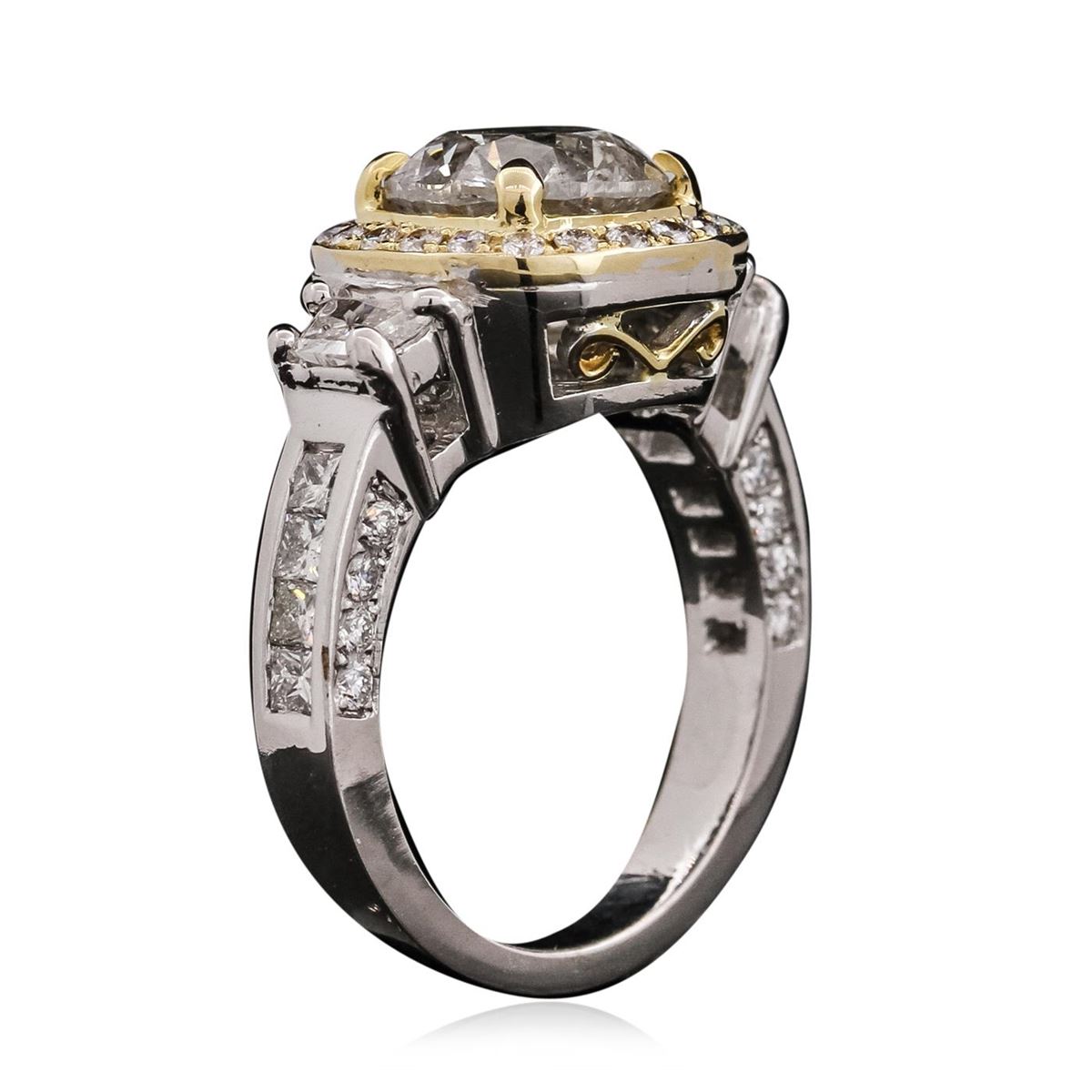 One electronically tested 14KT white and yellow gold ladies combination cast & assembled engagement ring with a flat shank with a bright polish finish. Identified with markings of "14K". Condition is new. Containing: One prong set round brilliant cut diamond, measuring 8.93 - 8.80 x 5.72mm (depth est.) approximate weight of 2.74ct. Clarity: I-2. Color: H, Cut is Good. Two prong set brilliant trapezoid cut diamonds, measuring 4.20 x 2.90 x 2.00mm (depth est.) approximate total weight of 2 Stones = 0.70ct. Clarity: I-1. Color: G, Cut is Good. Eight channel set princess cut diamonds, measuring 2.00 x 2.00 x 1.50mm (depth est.) approximate total weight of 8 Stones = 0.39ct. Clarity: SI-1. Color: I - J, Cut is Good. Thirty-Six prong set round brilliant cut diamonds, measuring 1.50 - 1.50 x 0.90mm (depth est.) approximate total weight of 36 Stones = 0.44ct. Clarity: SI-1 to SI-2. Color: F - G, Cut is Very Good. All diamonds are graded in the mounting, unless otherwise stated. Total Weight of Diamonds 4.28ct. Total Weight of Ring 8.50 grams. GGL Appraised at $41,620.00.