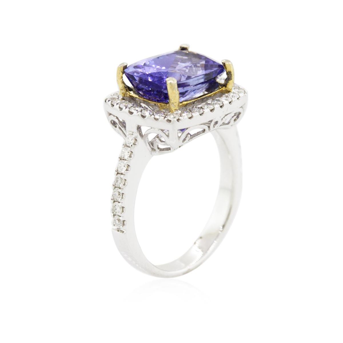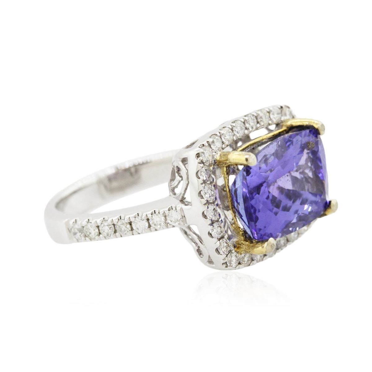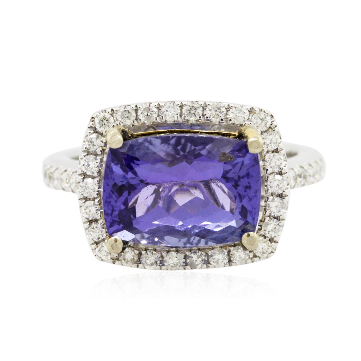 One electronically tested 14KT white and yellow gold Ladies combination cast & assembled ring with a bright polish finish. Condition is new. Identified with markings of "14K". Containing: One prong set rectangular cushion modified brilliant cut natural tanzanite, measuring 11.40 x 8.10 x 5.90mm, approximate weight of 4.29ct., clarity is eye clean, type I, medium light, moderately strong, violet color, (GIA V 4/4), cut is good. Colored gemstones are presumed to have been subjected to commonly used color/clarity enhancement processes. Forty prong set round brilliant cut diamonds, measuring 1.50 - 1.30 x 0.84mm (depth est.) approximate. Total Weight of 40 Stones = 0.40ct. Clarity: I-1 to I-2. Color: H - J, Cut is Good. Total Weight of Colored Stones 4.29ct. Total Weight of Diamonds 0.40ct. Total Weight of Ring 5.70 grams. GGL Appraised at $8,645.00.
