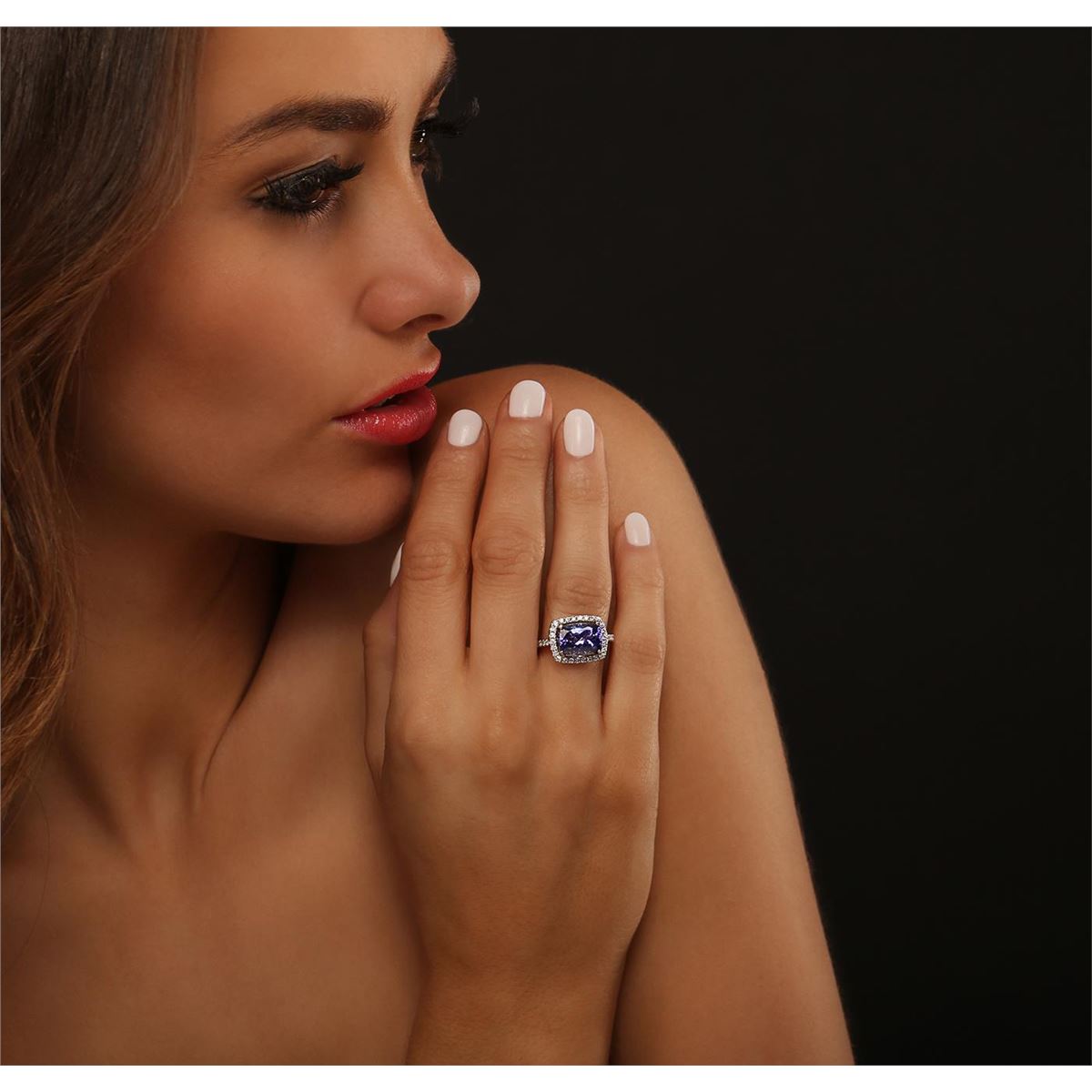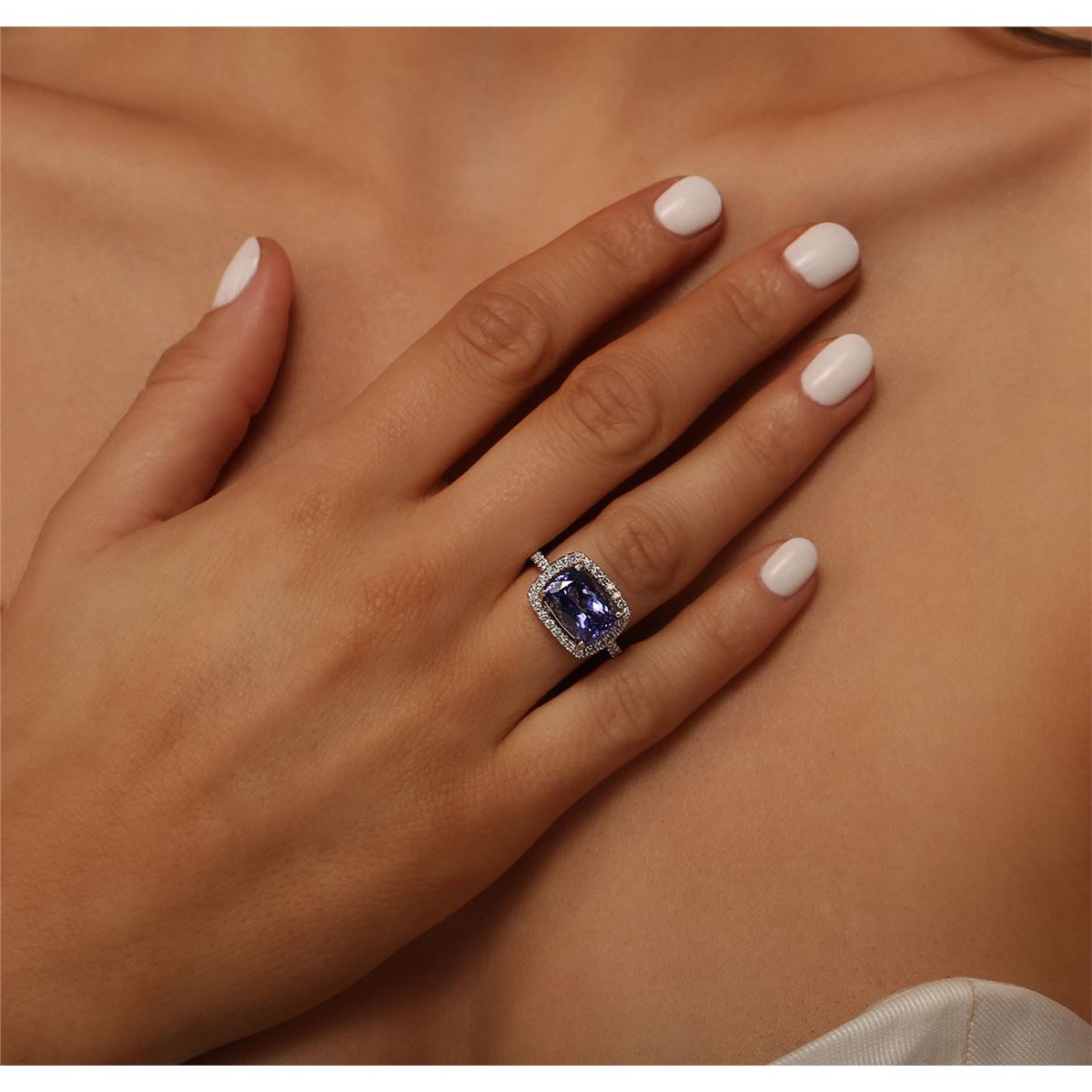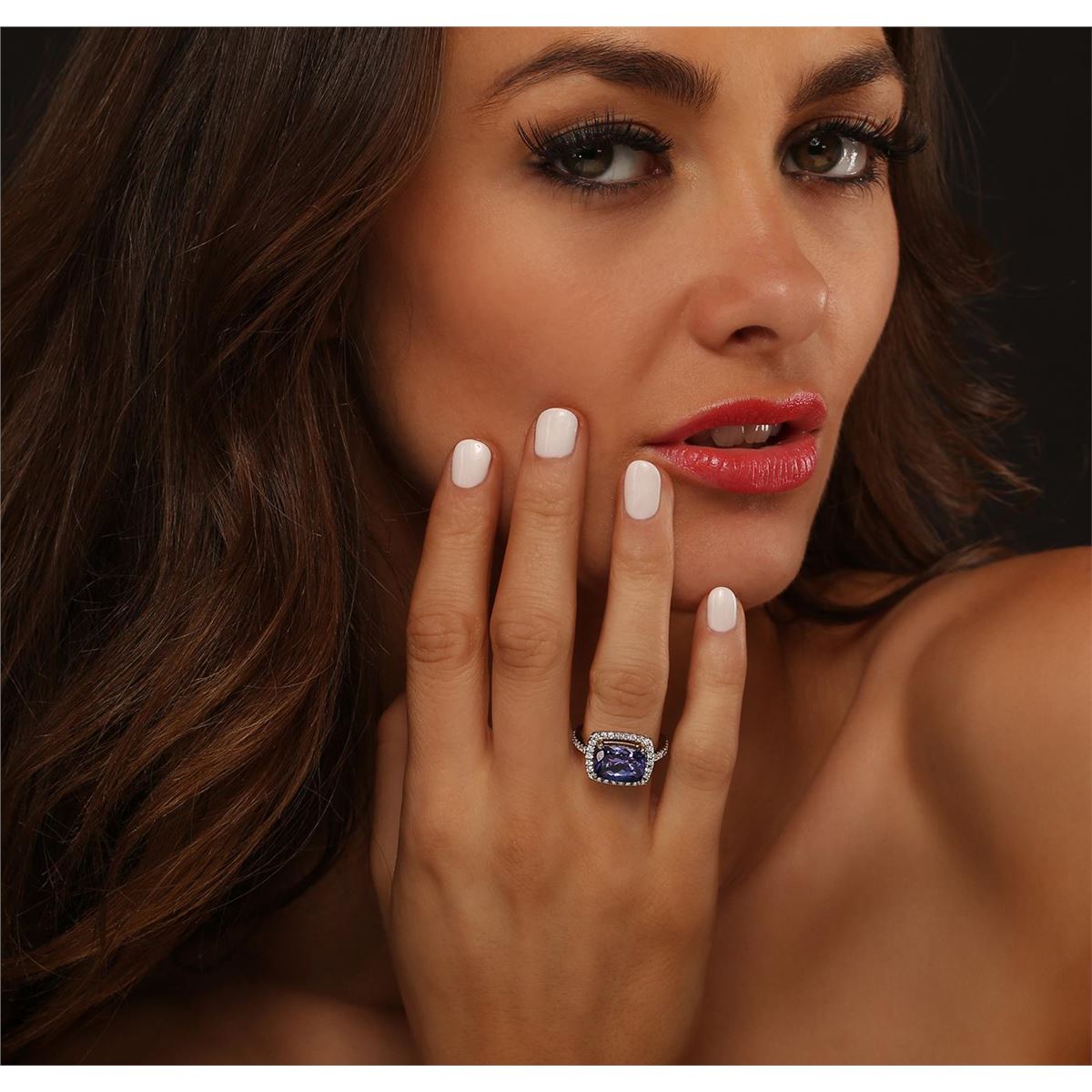 One electronically tested 14KT white and yellow gold Ladies combination cast & assembled ring with a bright polish finish. Condition is new. Identified with markings of "14K". Containing: One prong set rectangular cushion modified brilliant cut natural tanzanite, measuring 11.40 x 8.10 x 5.90mm, approximate weight of 4.29ct., clarity is eye clean, type I, medium light, moderately strong, violet color, (GIA V 4/4), cut is good. Colored gemstones are presumed to have been subjected to commonly used color/clarity enhancement processes. Forty prong set round brilliant cut diamonds, measuring 1.50 - 1.30 x 0.84mm (depth est.) approximate. Total Weight of 40 Stones = 0.40ct. Clarity: I-1 to I-2. Color: H - J, Cut is Good. Total Weight of Colored Stones 4.29ct. Total Weight of Diamonds 0.40ct. Total Weight of Ring 5.70 grams. GGL Appraised at $8,645.00.
